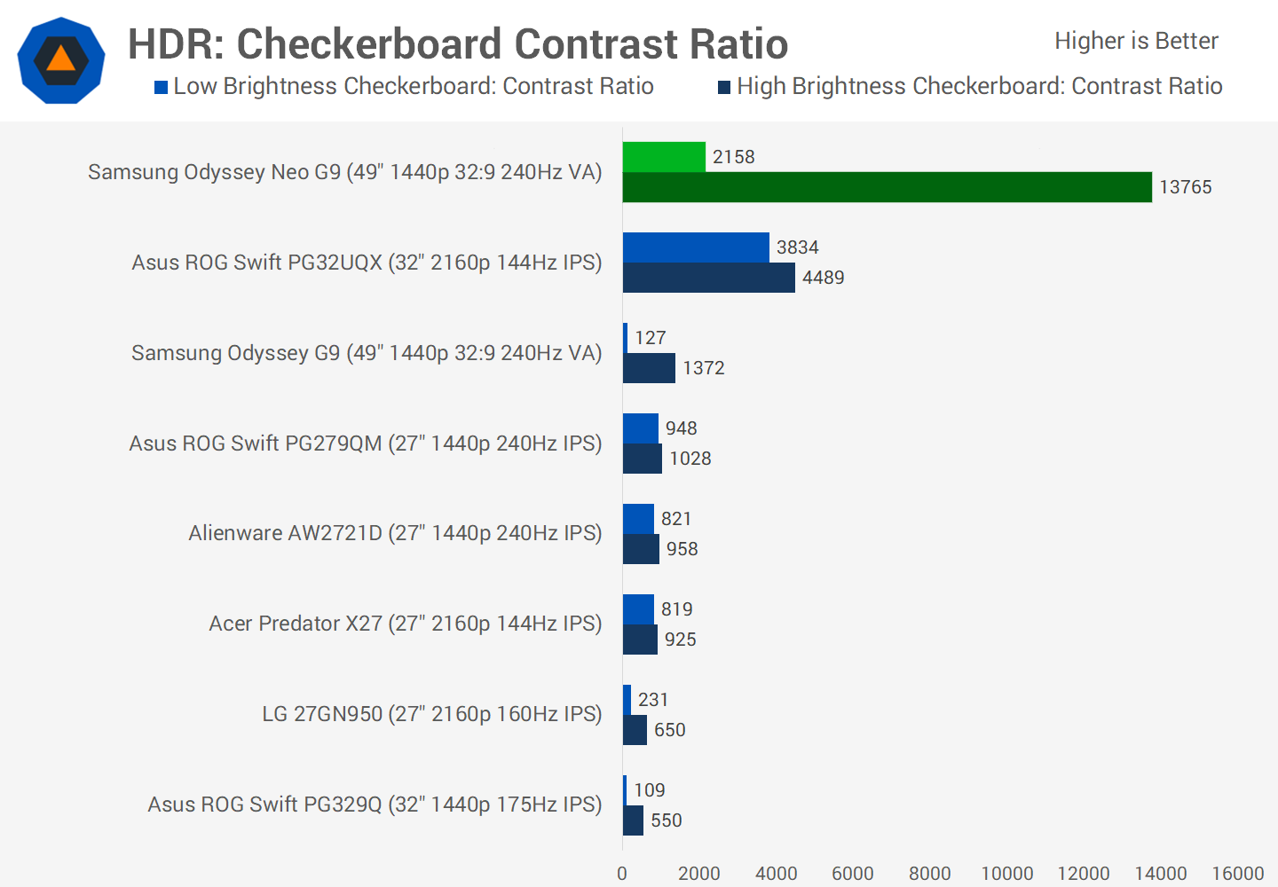 Even in a checkerboard test for contrast, the Neo G9 destroys its competitors, especially in the high brightness checkerboard. Results are not as good in the low brightness checkerboard, due to what I believe are similar issues to what I described previously with the HDR standard mode. But regardless, there is no doubting the Neo G9 has the best contrast capabilities I've seen yet from a gaming monitor, outside of OLED, and this is why despite some strange brightness results in some tests, the Neo G9 still looks awesome in a lot of HDR content.