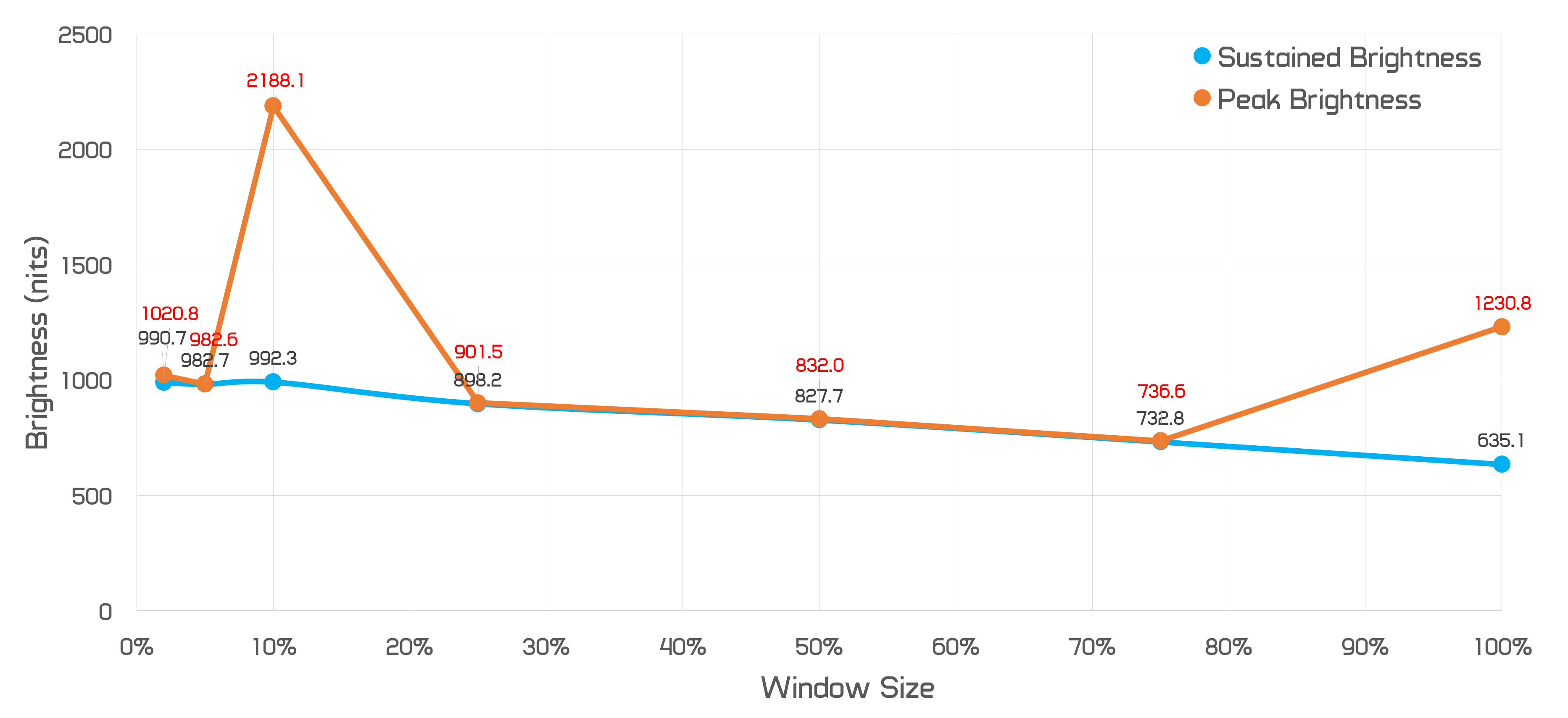 So how do you actually achieve 2000 nits with this monitor? Well you have to use the HDR Dynamic mode, which as we showed earlier has weird issues with tones and other artefacts. In this mode, sustained brightness is a little higher, but the main difference is that at around a 10% window, the Neo G9 can do over 2000 nits peak. Again not quite sure why brightness falls off to below 1000 nits at a 5% window and why 2000 nits is so limited to this range of window sizes, but the Neo G9 can technically do what it says on the box.