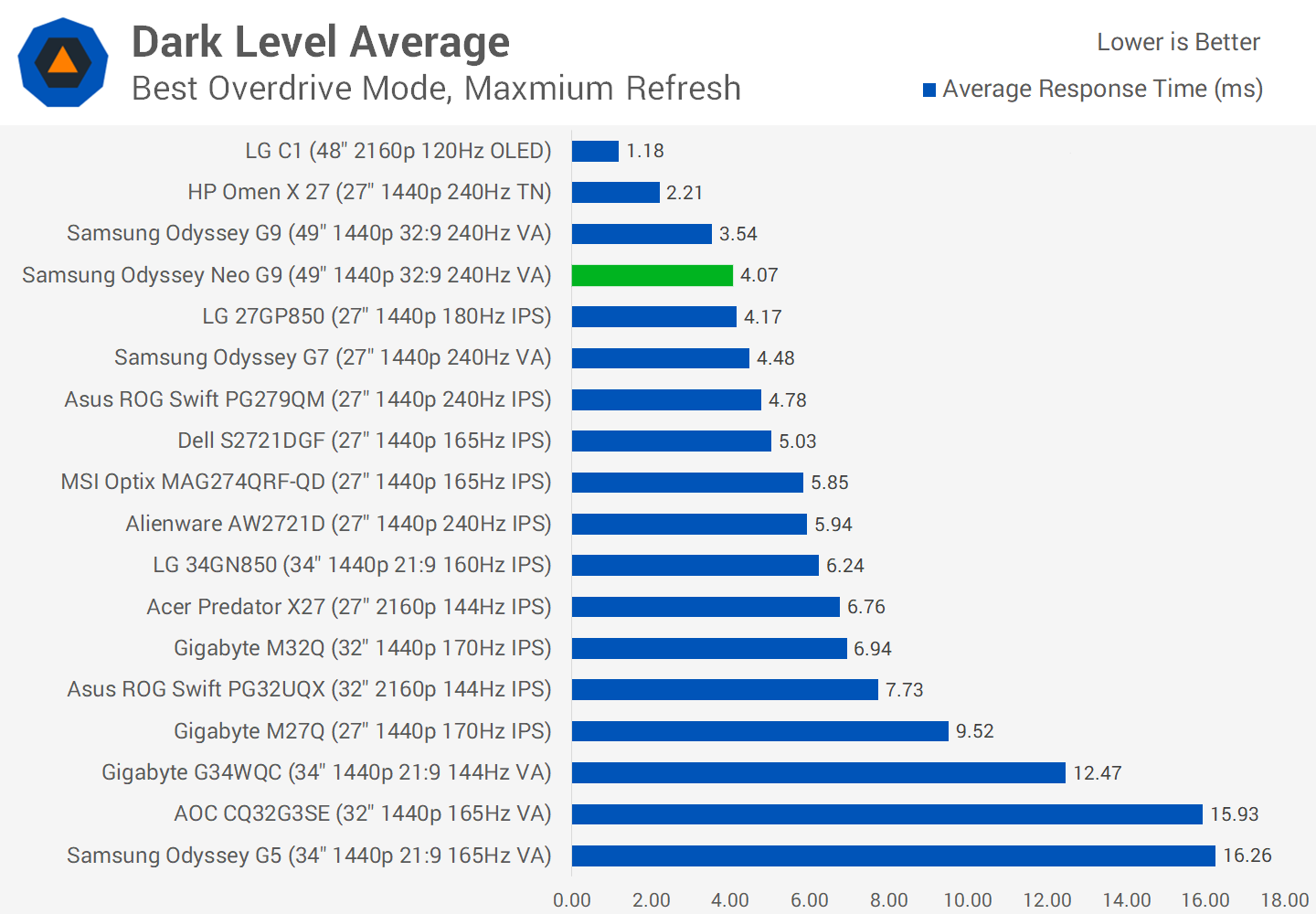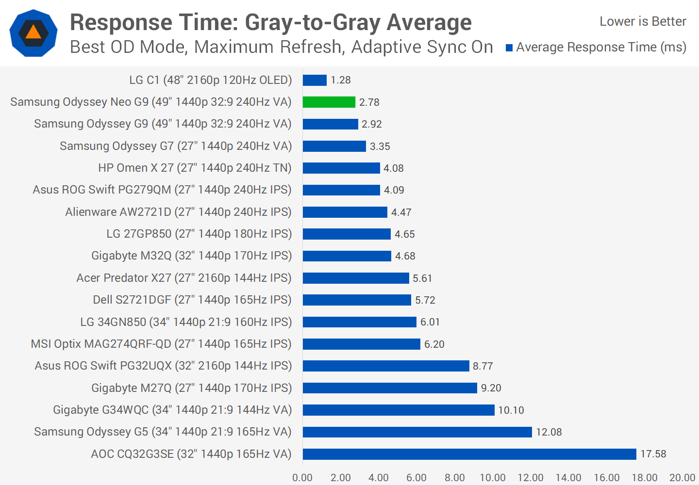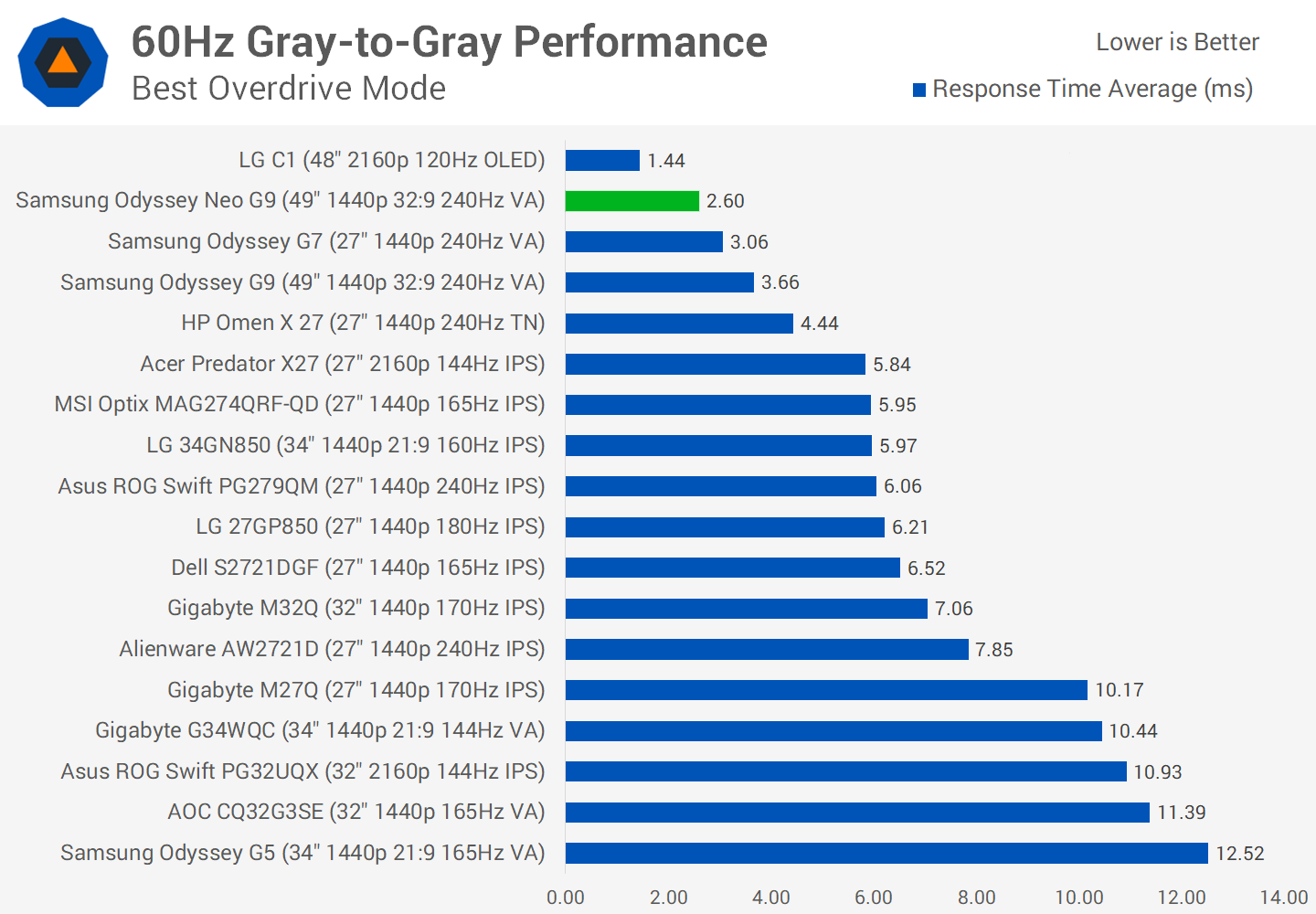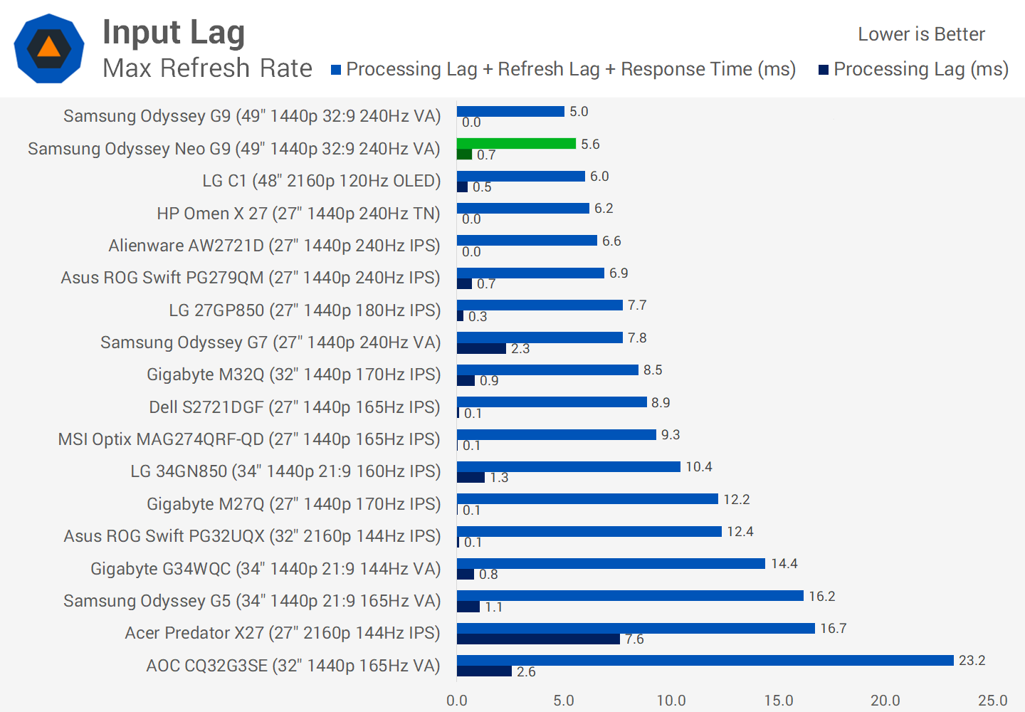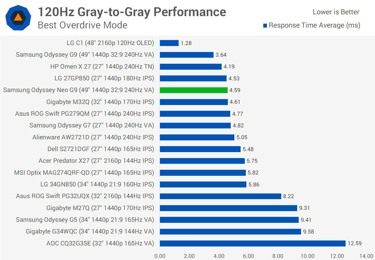 On average across the refresh range, the G9 and Neo G9 perform basically the same. Makes sense, as both use practically the same VA technology, with even a small improvement on the Odyssey G7. This allows this ultrawide display to beat most other contenders in the field, including products like the LG 34GN850 which isn't bad by any means for an ultrawide, but the Neo G9 is simply a lot faster.