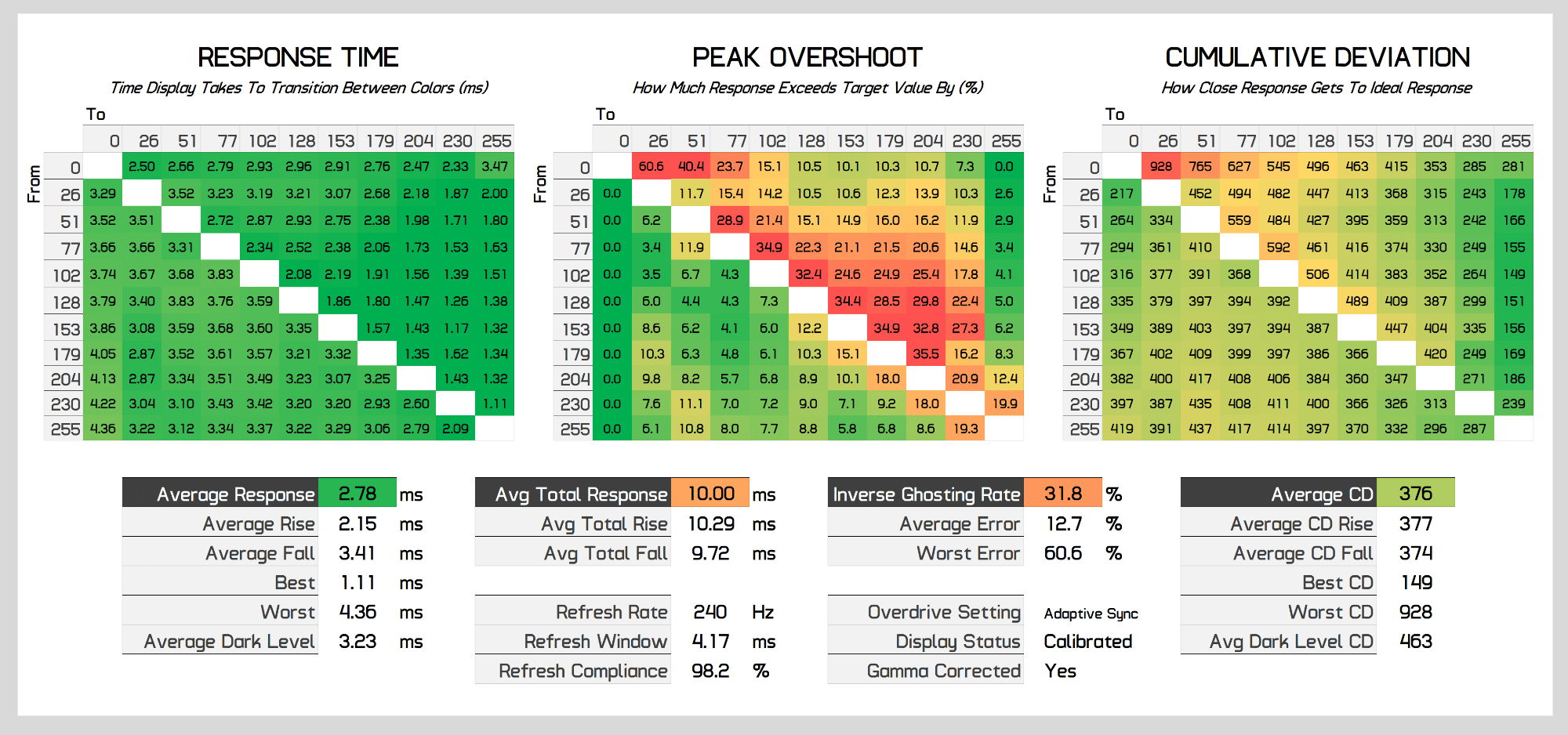 At the maximum 240Hz, the Neo G9 is a very fast monitor. It packs a 2.8ms grey to grey response time and while there is some overshoot at this refresh rate, it's somewhat manageable and actually a bit less overshoot than the same refresh rate on the G9. This leads to excellent cumulative deviation results and negligible dark level smearing which is outstanding for a VA display.