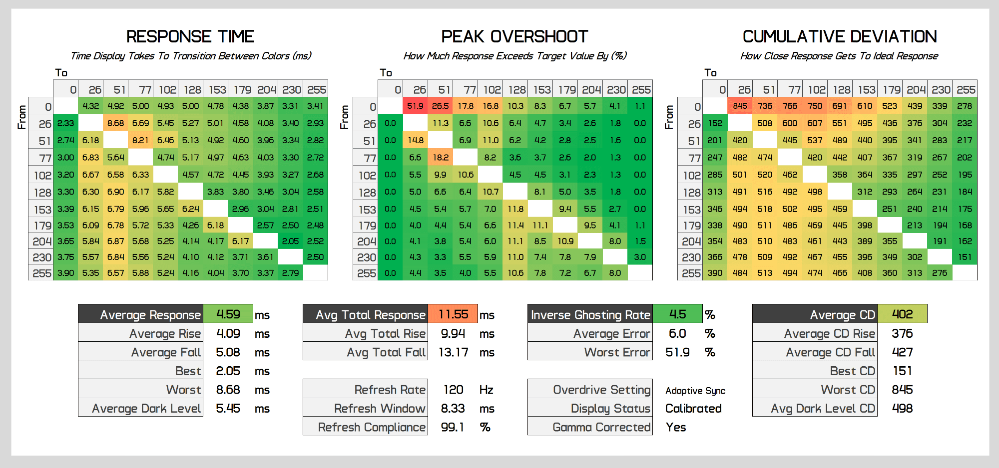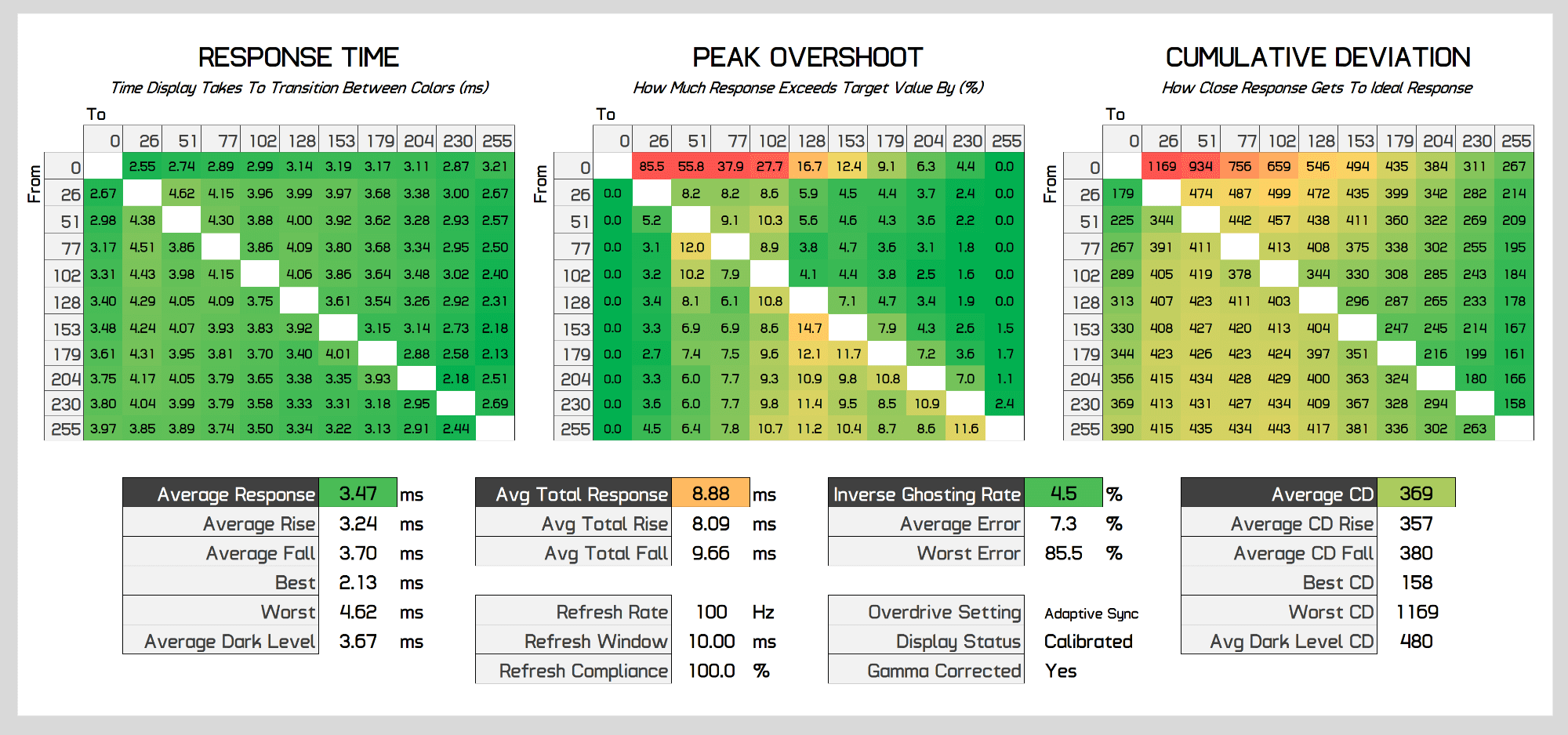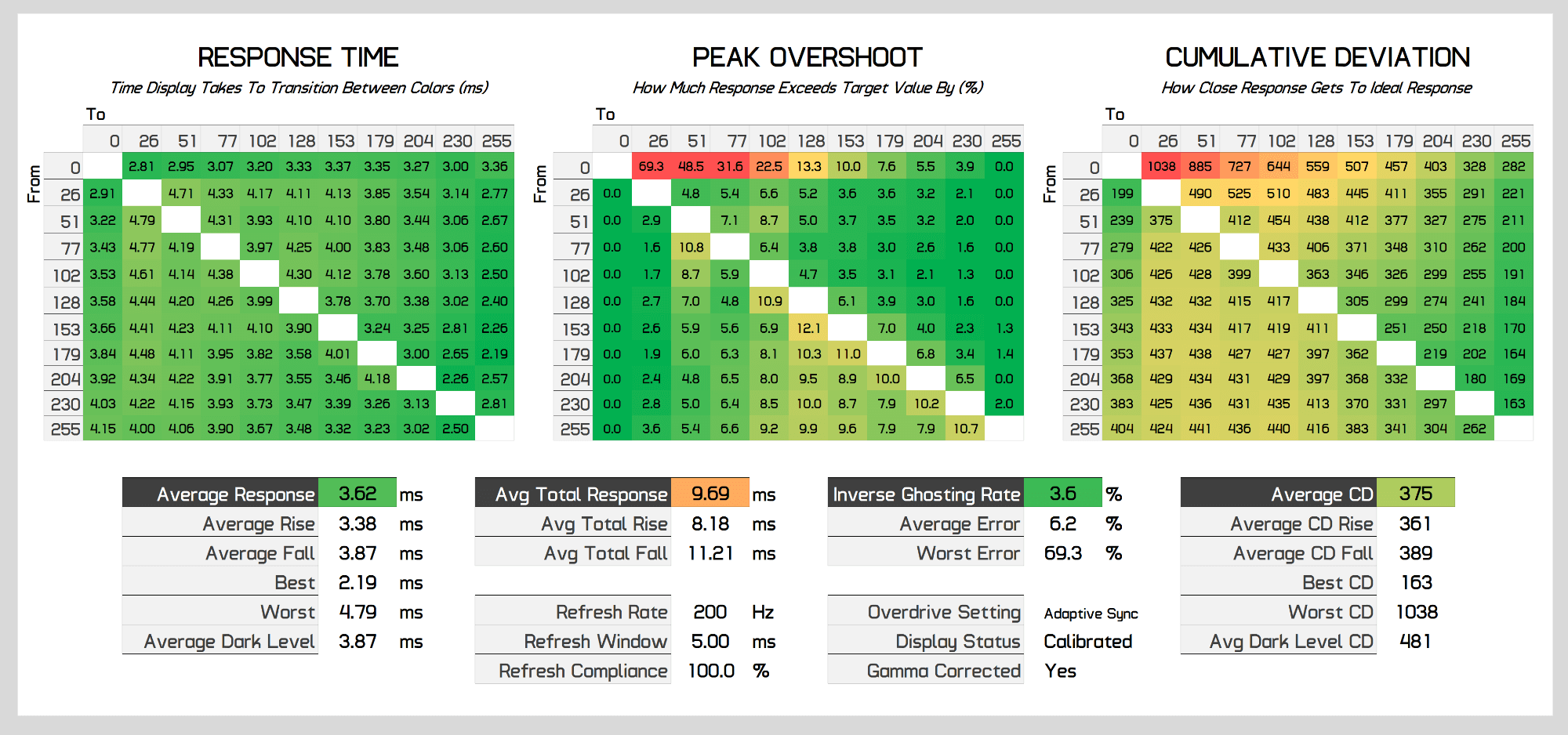 As the refresh rate decreases, performance stays pretty balanced. At below 200Hz, overshoot drops away to be insignificant, while for the most part preserving a sub-4ms response time average with few changes to cumulative deviation. At 100Hz performance improves again as the Neo G9 actually runs this refresh rate at 200Hz on the display, and similar at 60Hz which actually runs at 180Hz, standard refresh rate duplication on a variable refresh monitor which is done to deliver the best performance. But regardless you can clearly see the Neo G9 delivers a single overdrive mode experience.