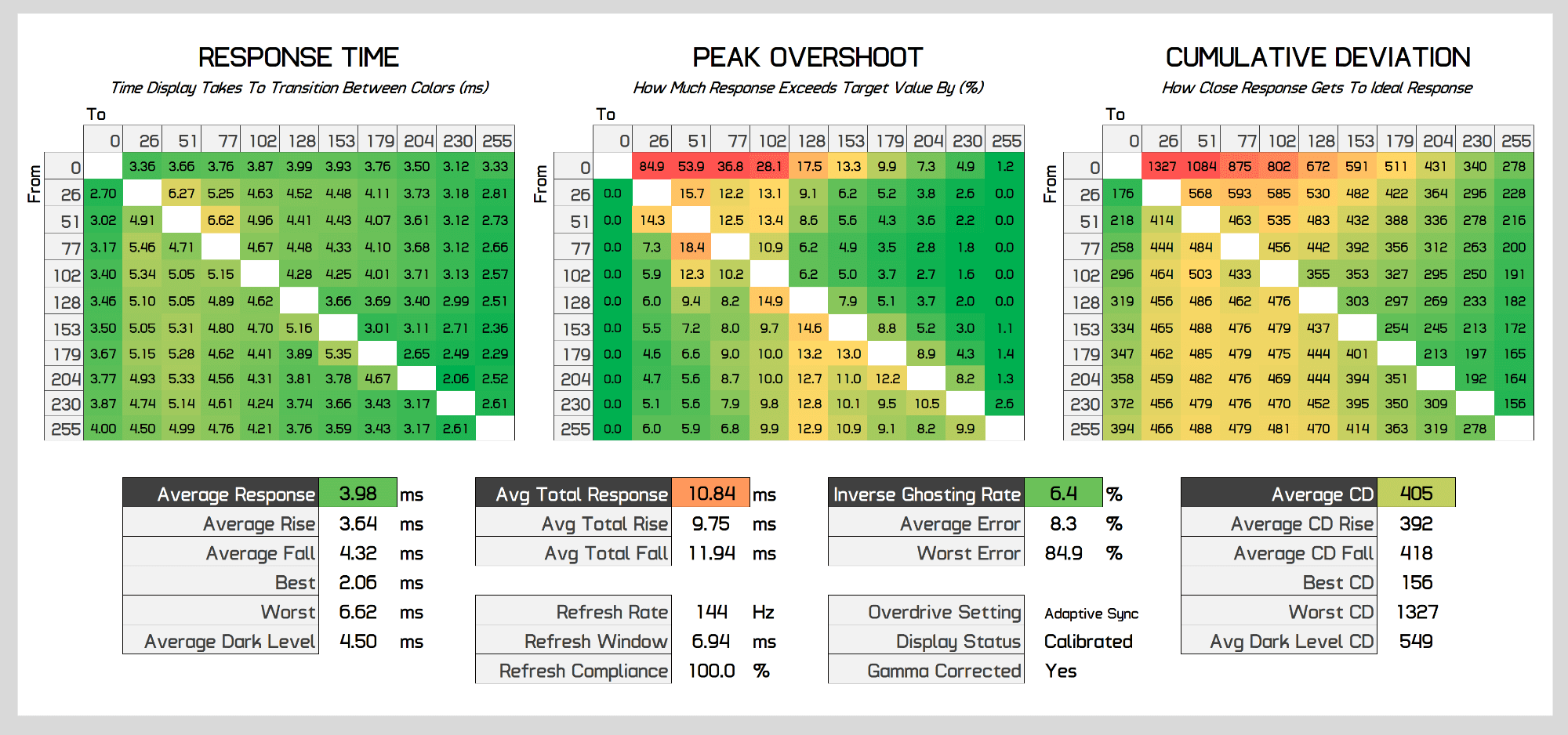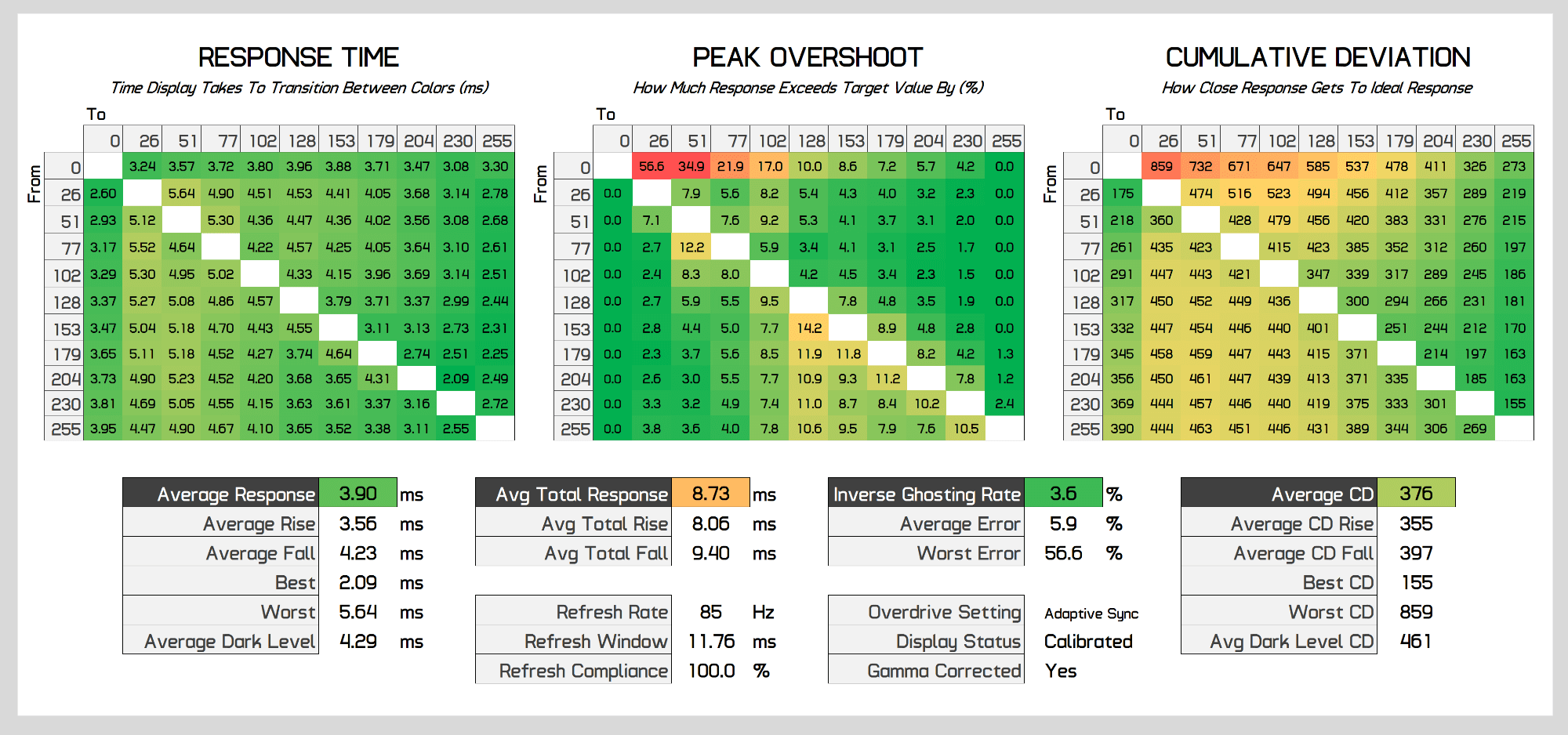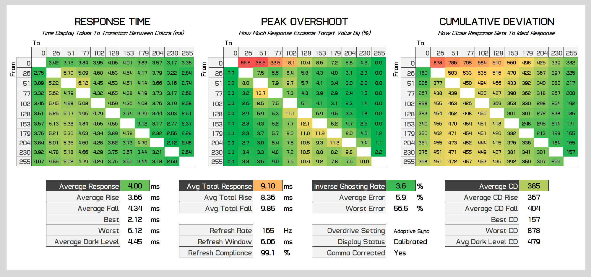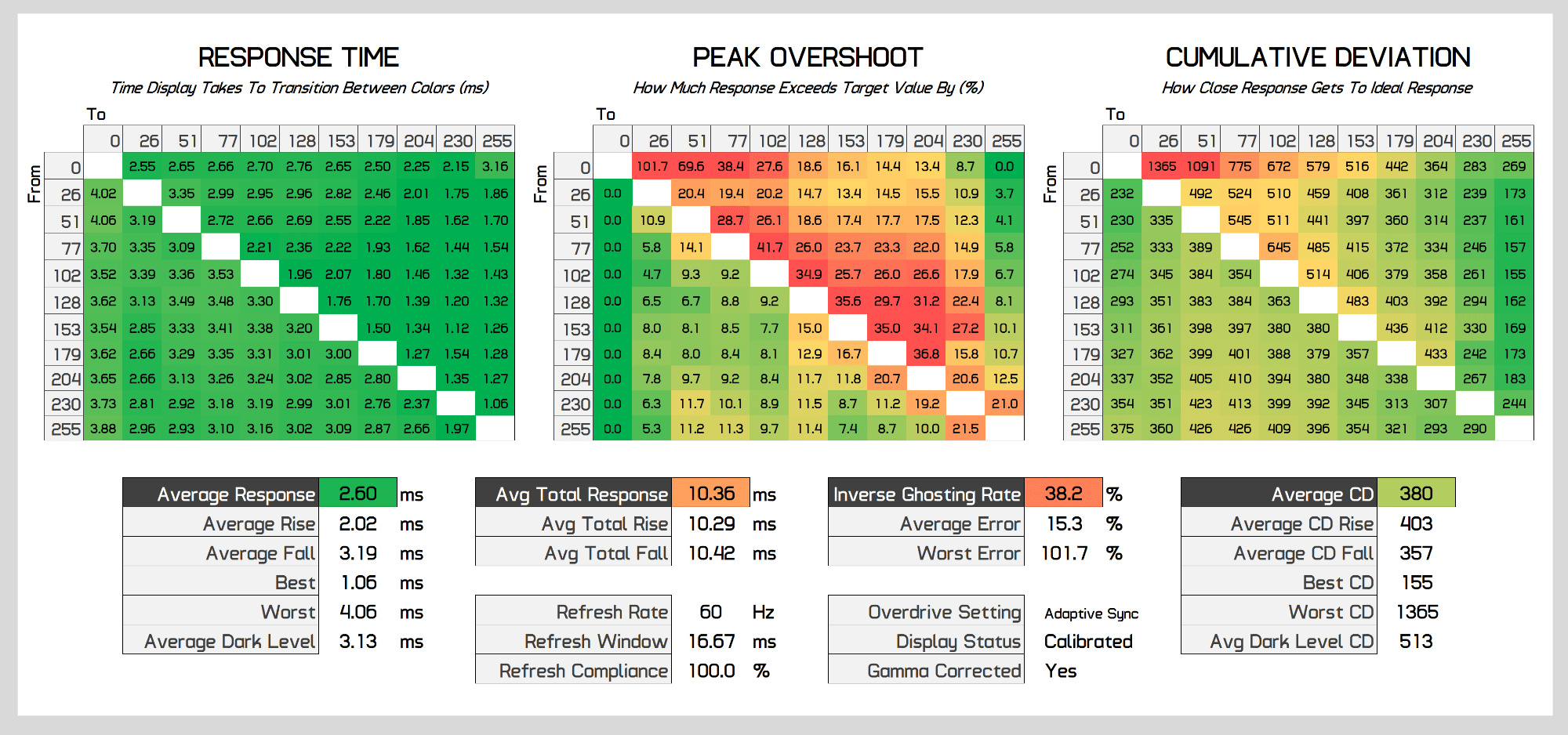 As the refresh rate decreases, performance stays pretty balanced. At below 200Hz, overshoot drops away to be insignificant, while for the most part preserving a sub-4ms response time average with few changes to cumulative deviation. At 100Hz performance improves again as the Neo G9 actually runs this refresh rate at 200Hz on the display, and similar at 60Hz which actually runs at 180Hz, standard refresh rate duplication on a variable refresh monitor which is done to deliver the best performance. But regardless you can clearly see the Neo G9 delivers a single overdrive mode experience.