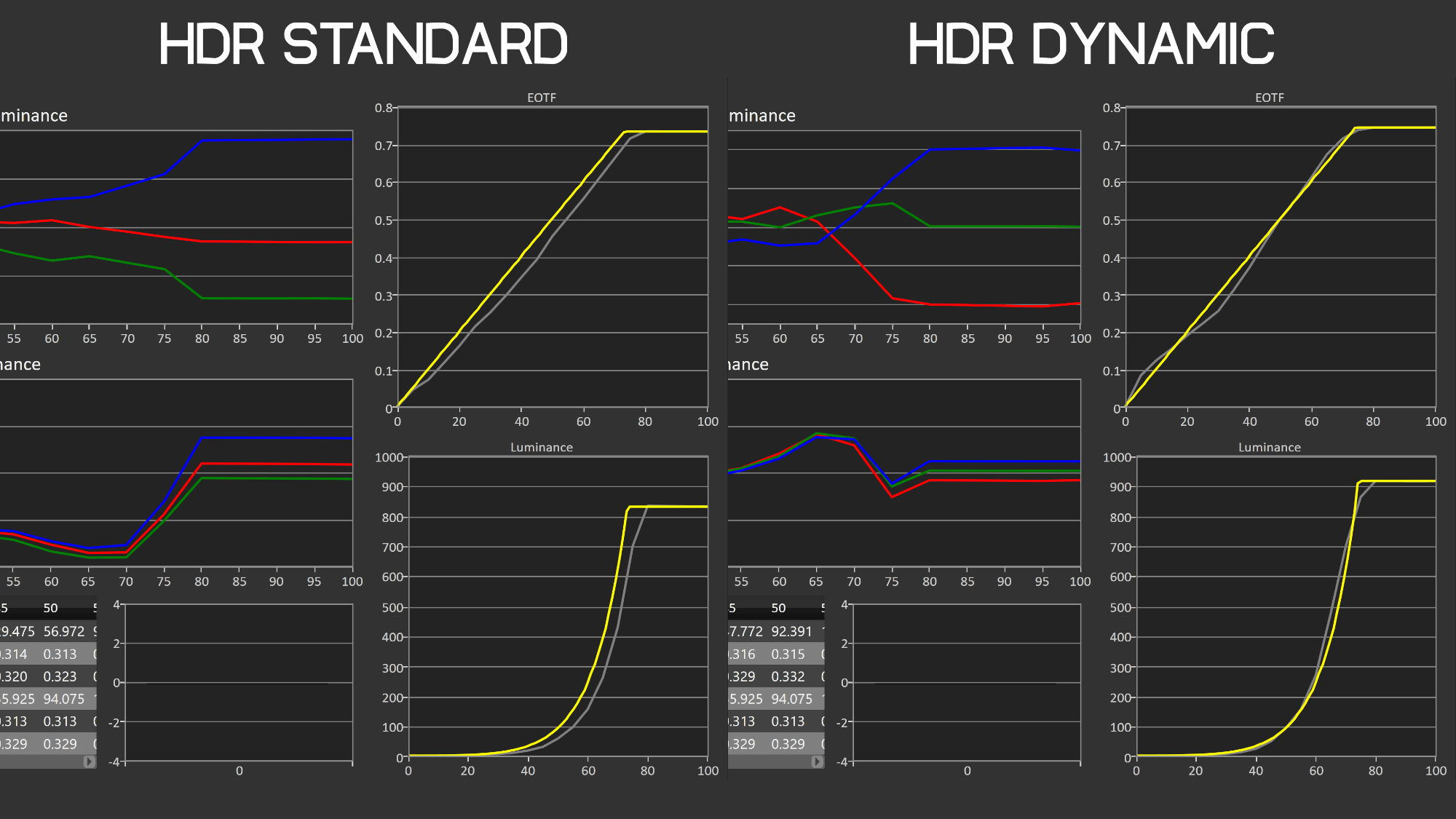 What's super weird is that the HDR Dynamic mode has different EOTF behavior to HDR Standard. In the Standard mode, the image is generally too dim relative to what it should be displaying. You can see that when the content, the yellow line, requests 400 nits, the monitor is showing more like 250 nits, which doesn't give us as impressive highlights as the monitor is capable of. Meanwhile the Dynamic mode has much better adherence to the EOTF curve, but doesn't give us a linear line in the sections it needs to, which I think contributes to some of the artifacts, including raised black levels as shown in this section.