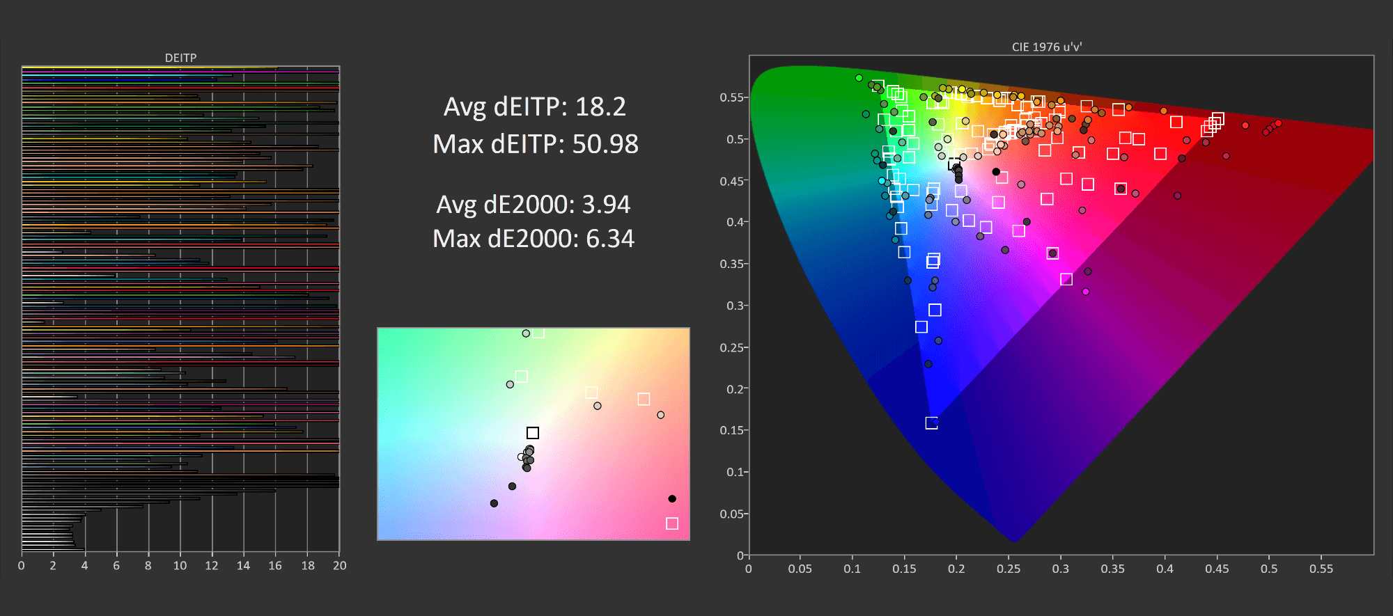 Next up we have color performance and to be honest there's not a lot to talk about because the Odyssey Neo G9 performs just like the original G9. Wide gamut support is the same for example, at 89% DCI-P3 and 66% Rec.2020, which means the Neo G9 has a somewhat limited wide gamut that only really extends into P3 and not into Adobe RGB. Fine for HDR content and gaming, but it doesn't make the G9 as versatile as the best IPS monitors which sit at the top of this chart and provide a dual P3 and Adobe RGB experience.