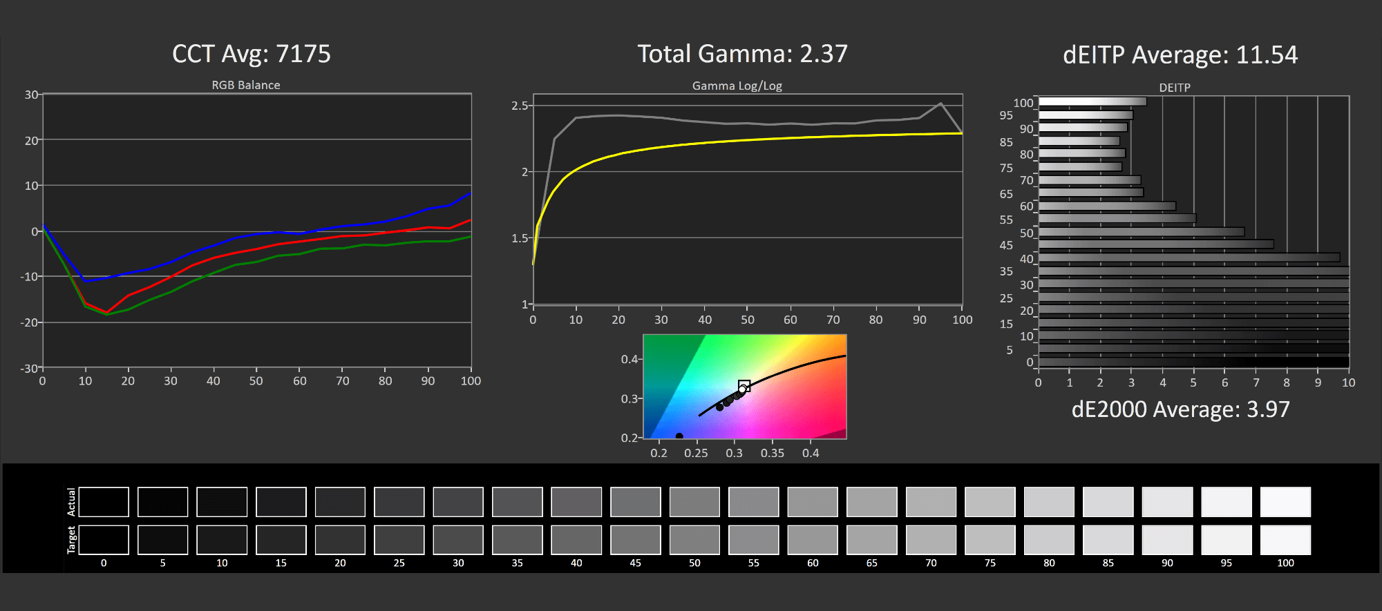 Factory calibration is below average in the default, out of the box mode. Greyscale performance is off, with a gamma that's too high, meaning the monitor is a little dark most of the time. Combined with an incorrect white point, and deltaE results are a little higher than we like to see from gaming displays. It also ships without an sRGB mode enabled by default, so you will see some oversaturation, though as the gamut itself isn't particularly wide, this issue isn't going to be that bad.