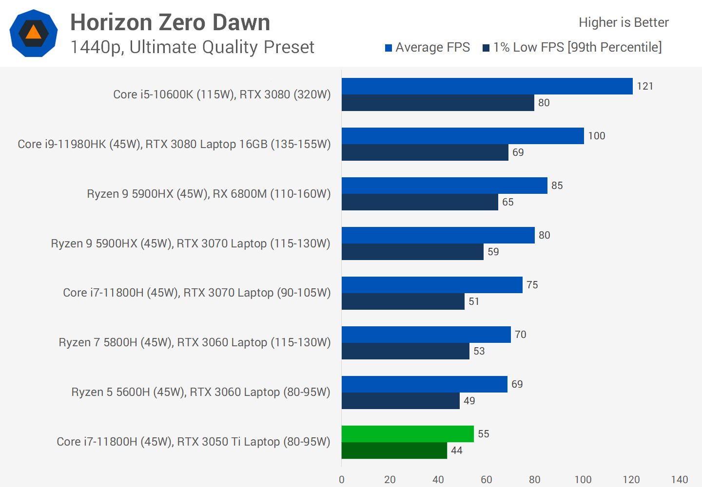 Then at 1440p, the RTX 3050 Ti struggles. It's actually competitive with the RTX 3060 80W, but well behind the higher power variant which can offer a 60 FPS experience at this resolution and quality settings.
