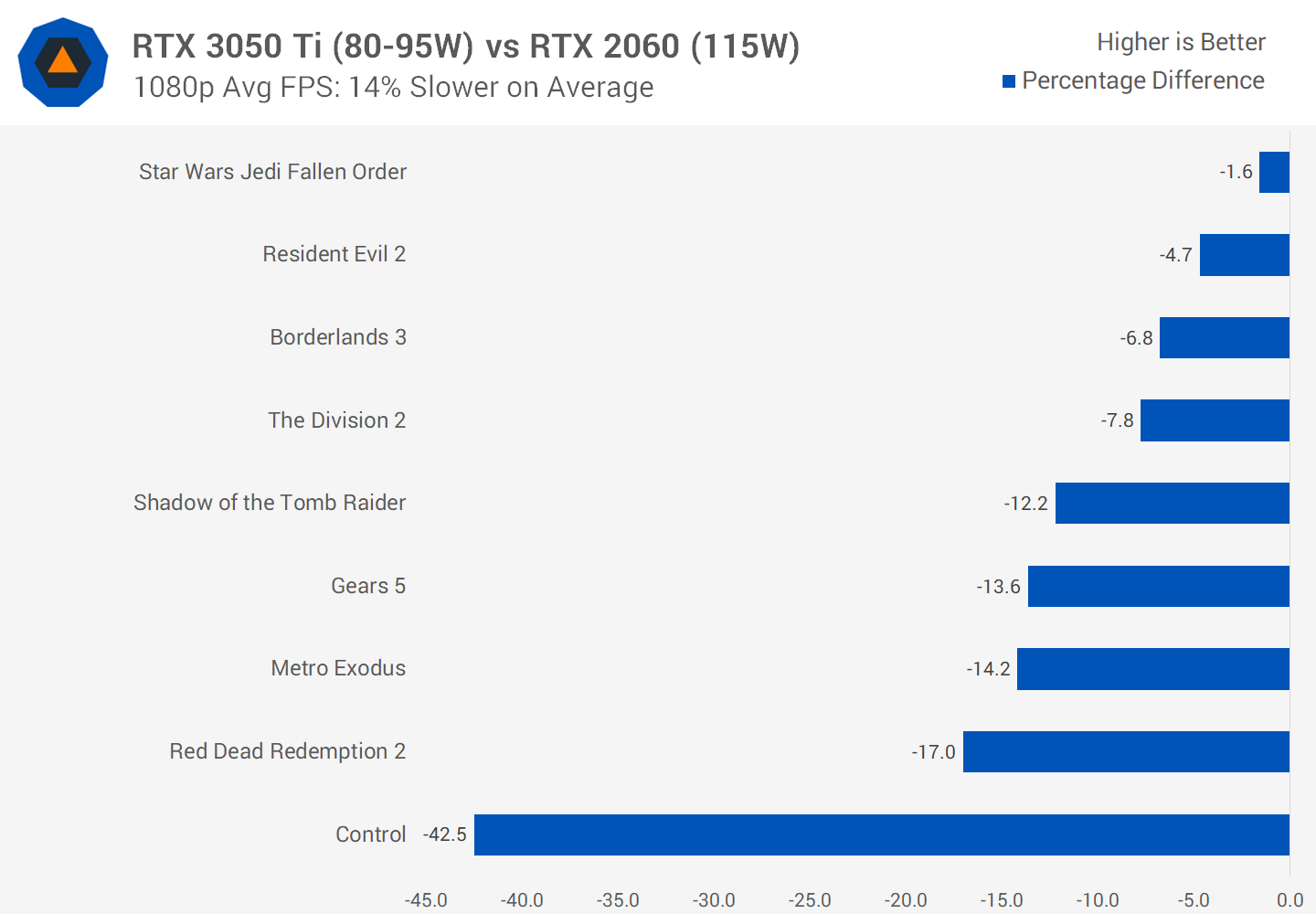 When comparing 80W vs 80W, the 3050 Ti was 7 percent faster in a limited selection of games at 1080p, with the best results in the 10%+ range. Though again, the VRAM limit is something to keep in mind, as the 3050 Ti has just 4GB vs the 1660 Ti's 6GB.
