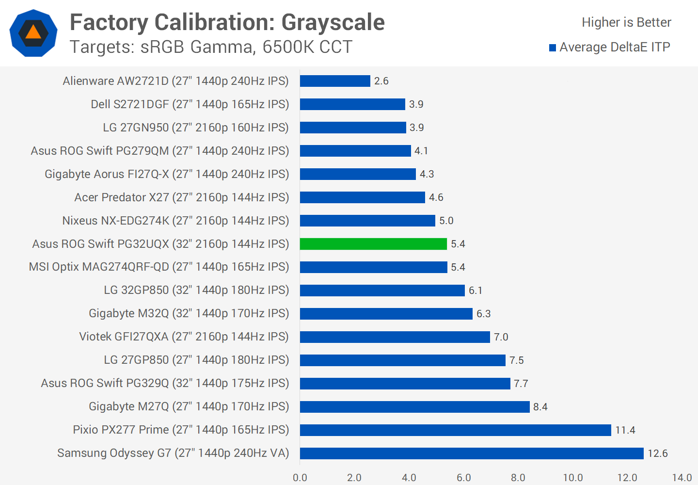 What this means is that compared to other monitors, the PG32UQX has noticeably better factory ColorChecker accuracy. The majority of displays here are wide gamut, and almost none of them limit that gamut to sRGB from the factory. The PG32UQX does, making it miles better than its competitors. Greyscale accuracy though is more mid table, not a bad result by any means but it could be a bit tighter from the factory.