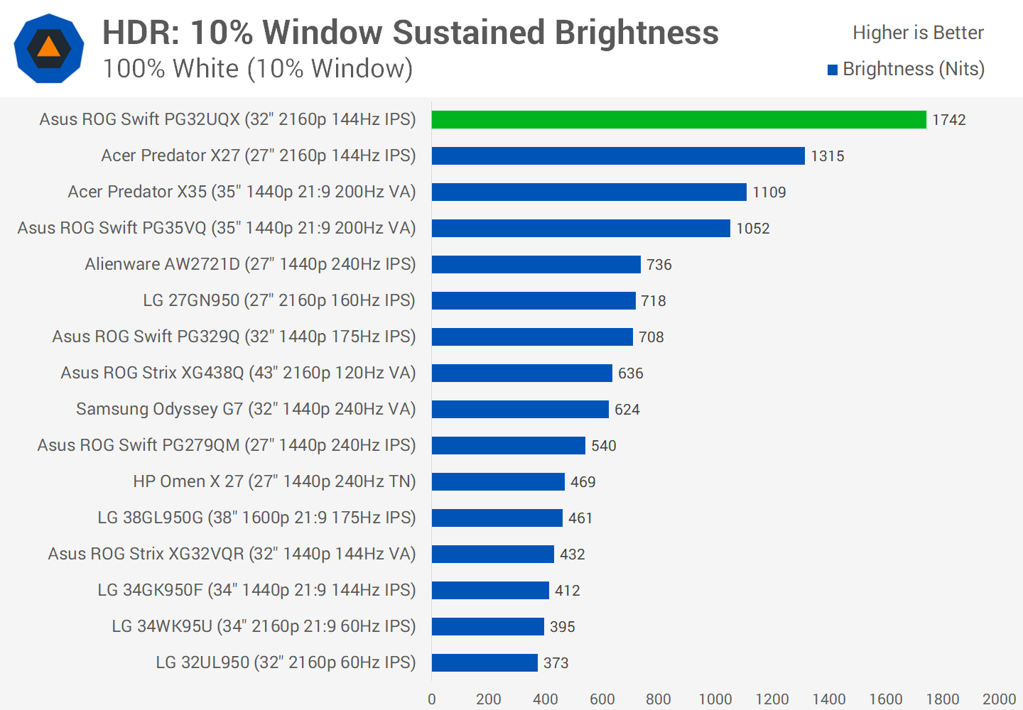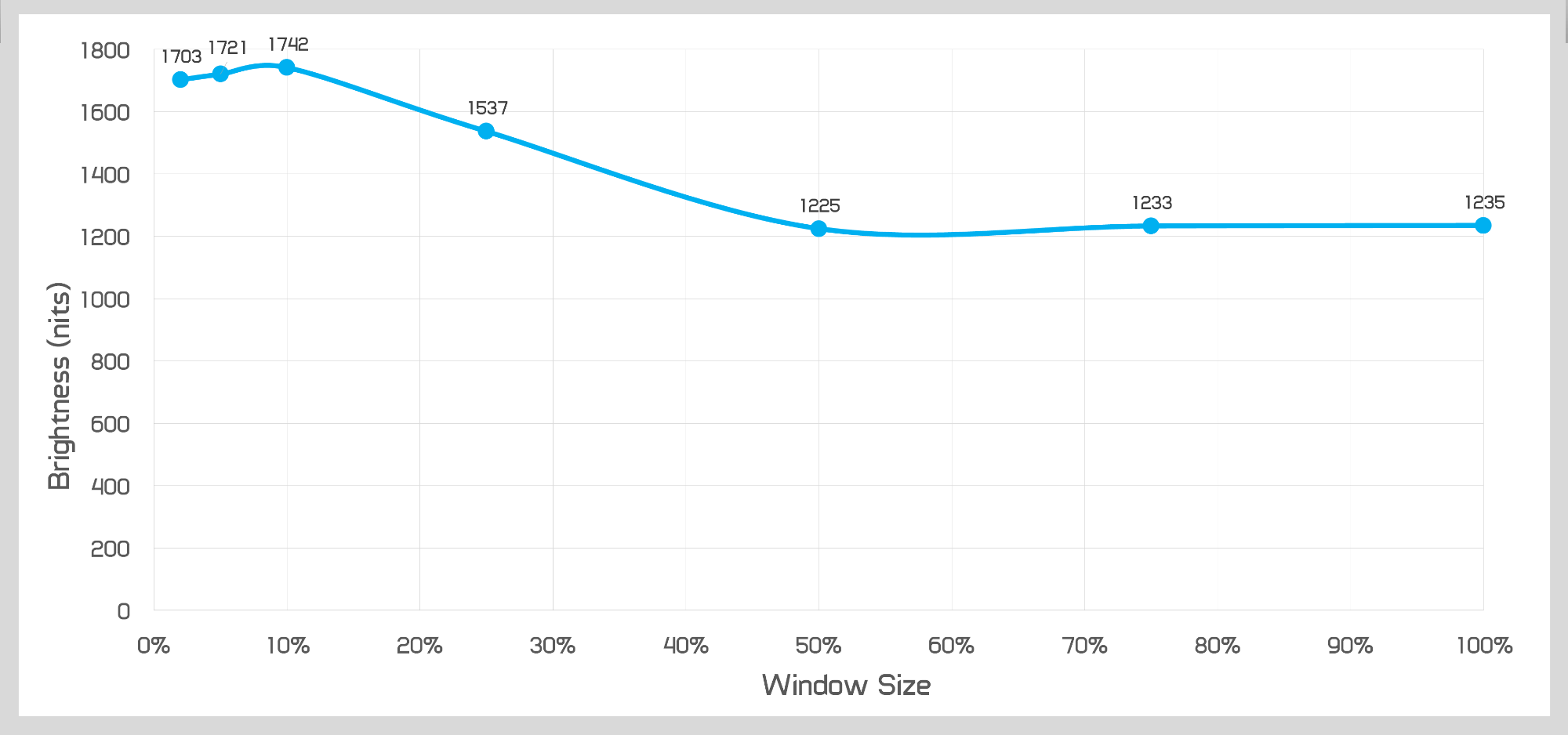 The PG32UQX is also able to sustain a much higher brightness for small areas than other monitors, pushing up to 1742 nits when viewing a 10% window, again higher than every other display. At no point did I measure a sustained brightness level below 1200 nits, for most content I'd say peaks of 1500 nits or above are achievable which is fantastic for HDR.