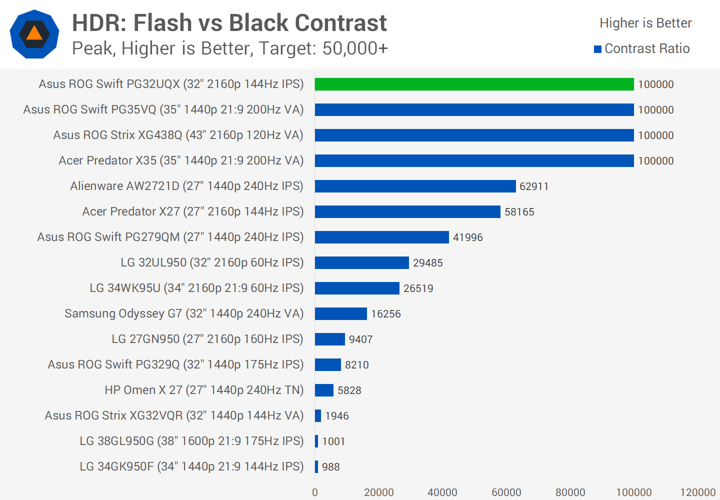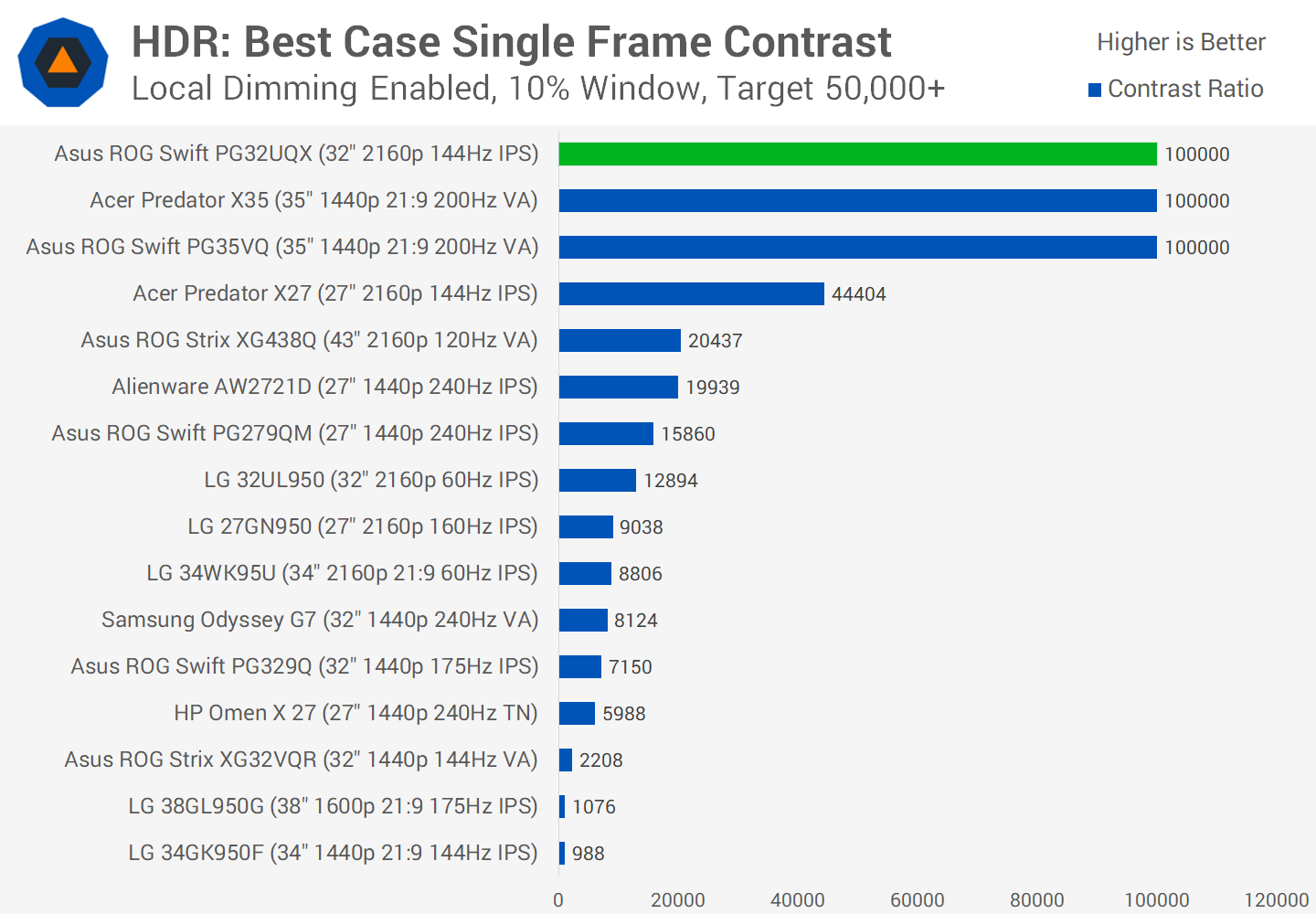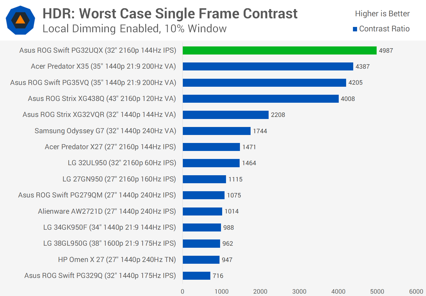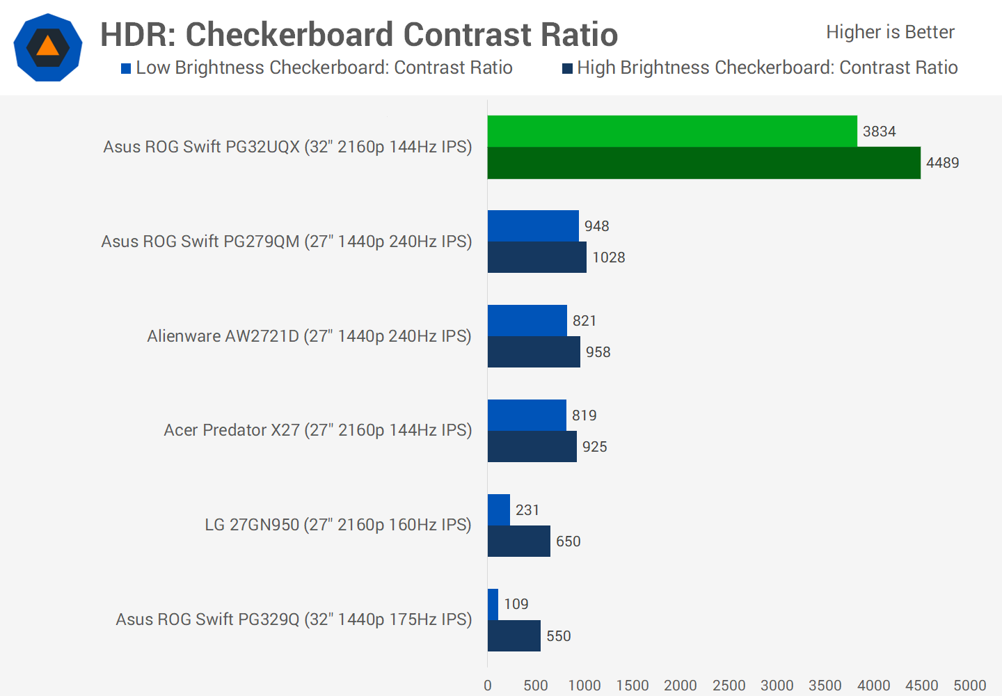 Our almost worst case test for HDR has a bright and dark area close together, which measures a display's ability to effectively dim dark areas. Edge lit dimmed displays are woeful in this test, quickly falling to or below their native contrast ratio, highlighting that in some situations edge lit panels have no functional dimming at all. Meanwhile the PG32UQX is the best monitor we've tested in this metric, delivering approximately 4x its native contrast ratio through local dimming. A contrast ratio of 5000:1 isn't mind boggling but does deliver great results in most true HDR scenes.