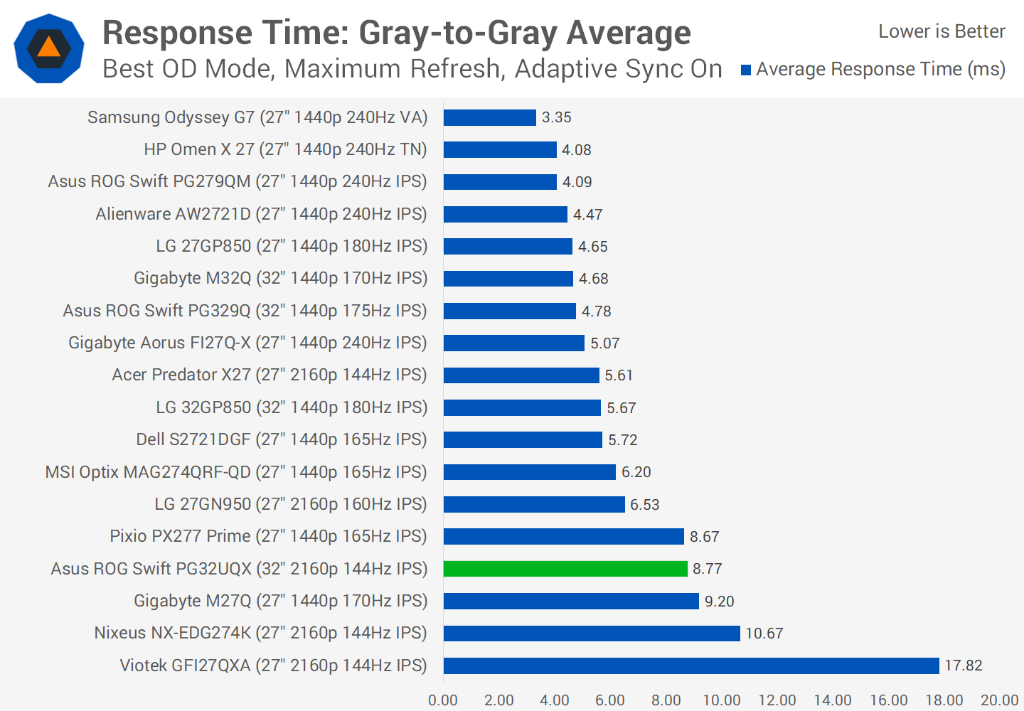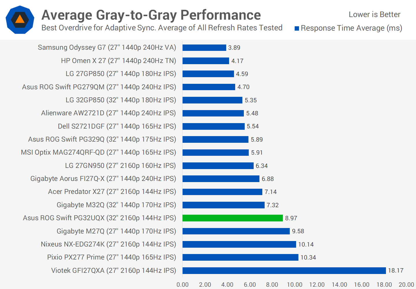 Across all refresh rates tested, on average the PG32UQX also doesn't fair that well, again delivering performance similar to prior generation IPS panels, which are now used in more budget friendly models like the Nixeus, or Pixio PX277 Prime as a 1440p option. Performance is no better than the Acer Predator X27, the prior flagship G-Sync Ultimate 4K 144Hz monitor that was released in 2018, and well behind the LG 27GN950.