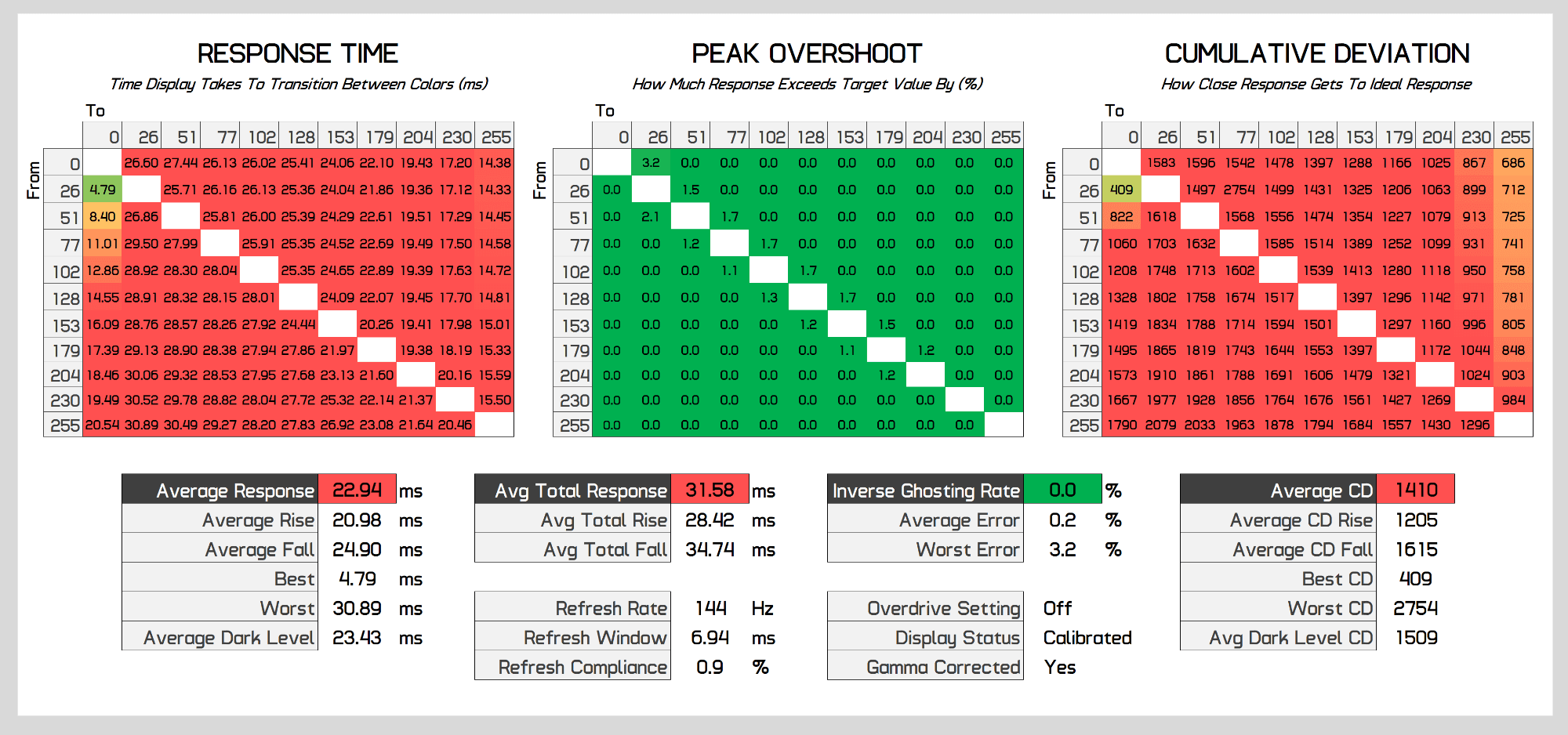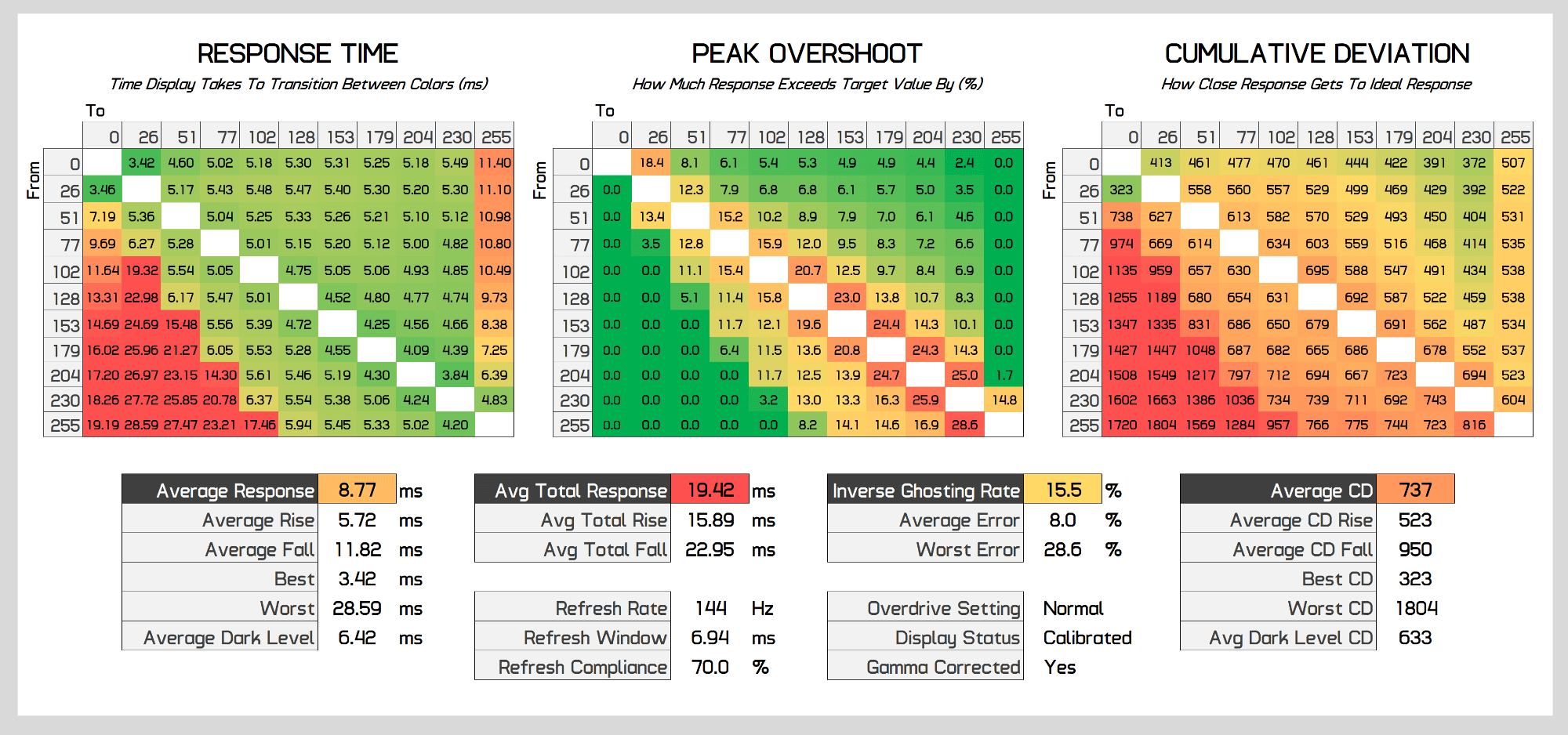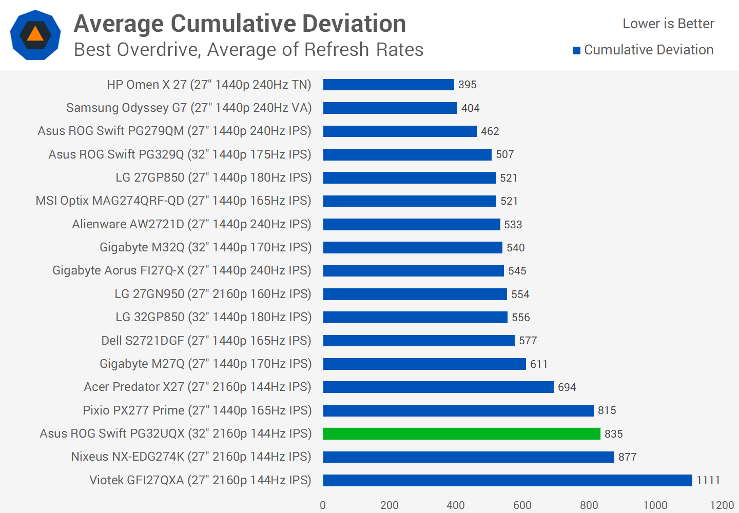 What really illustrates this issue are the cumulative deviation results, which measure how close the monitor's response time gets to the ideal instant response, and quantifies the balance between overshoot and response times nicely. The PG32UQX is clearly a step behind current generation IPS panels, which deliver cumulative deviation in the 500 to 600 range, roughly 50% better than what the PG32UQX is capable of. It's actually worse than the Predator X27 in our testing, a monitor we re-tested just a few weeks ago, which is a remarkably bad result for a high-end product.