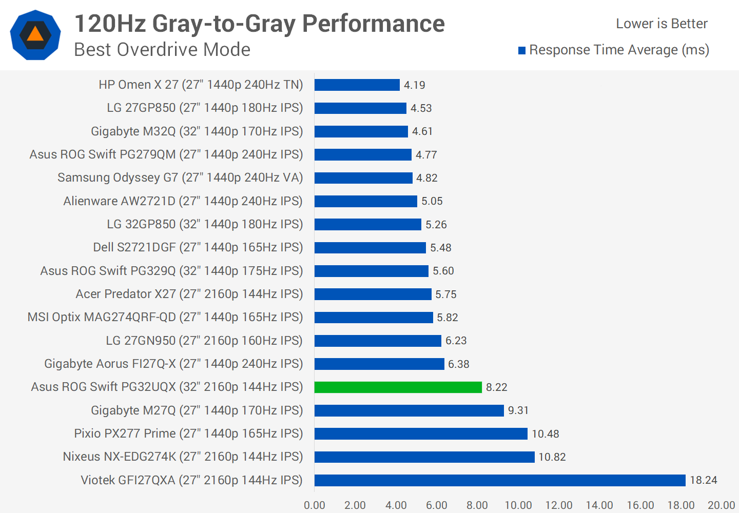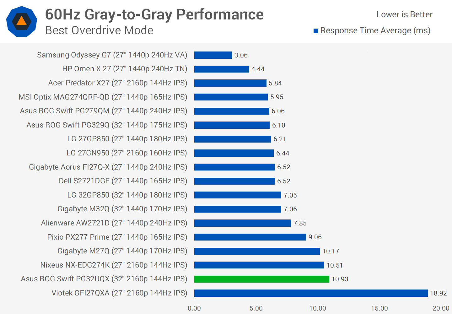 This is all down to those slow fall times really, the artifacts that issue creates are visible and prevent the PG32UQX from matching today's best IPS monitors. And this metric is such a great way to quantify that: the PG32UQX has artifacts in motion that the other monitors do not have.