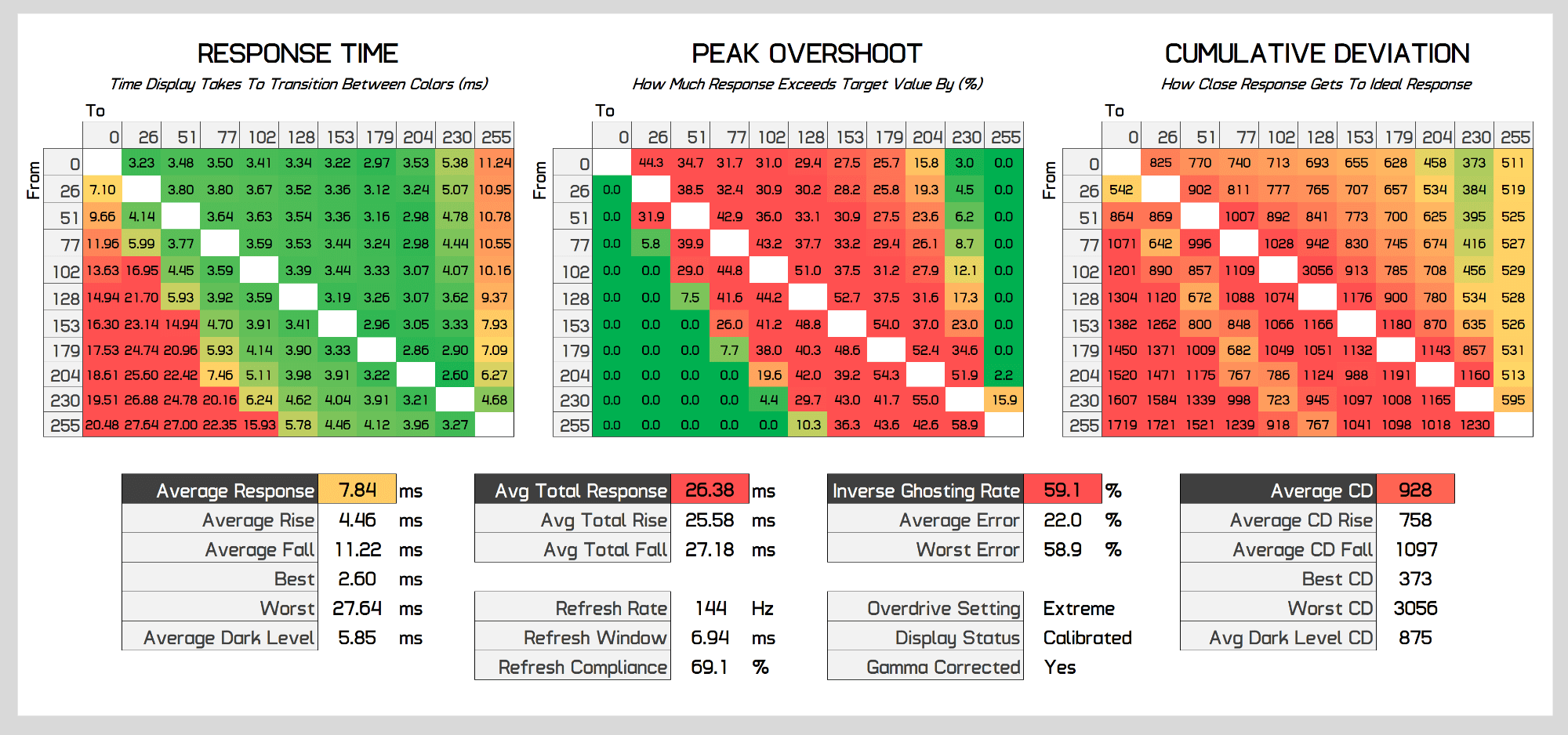 The Extreme mode at 144Hz isn't any better, in fact it's worse. Rather than solving the issue of slow fall times in some areas, the Extreme mode simply makes the majority of transitions even faster, leading to overshoot and noticeable inverse ghosting. I wouldn't recommend using this mode at the maximum refresh rate.