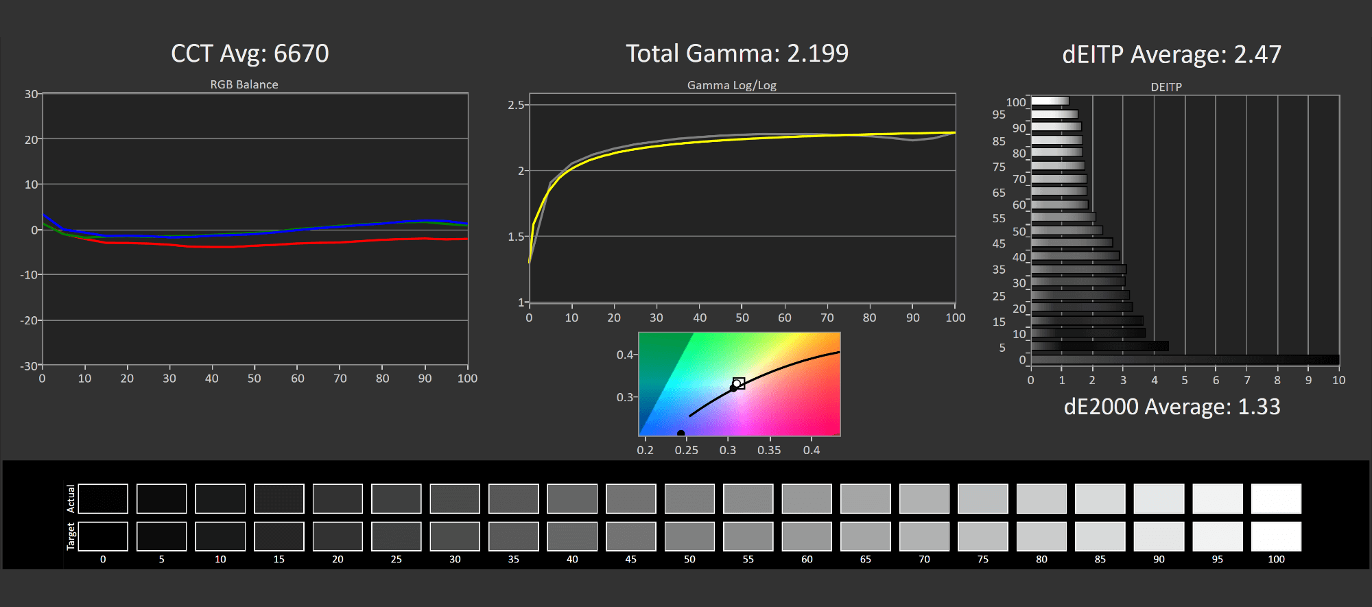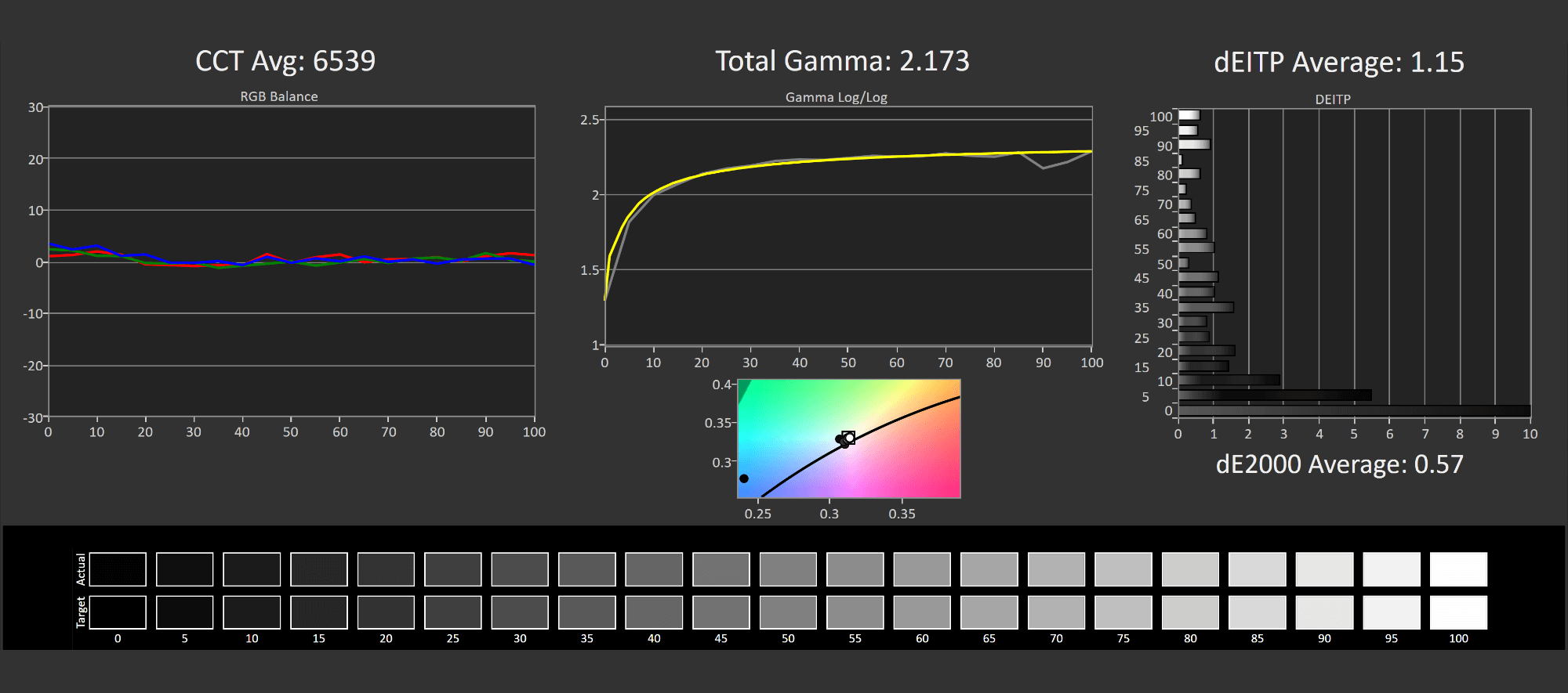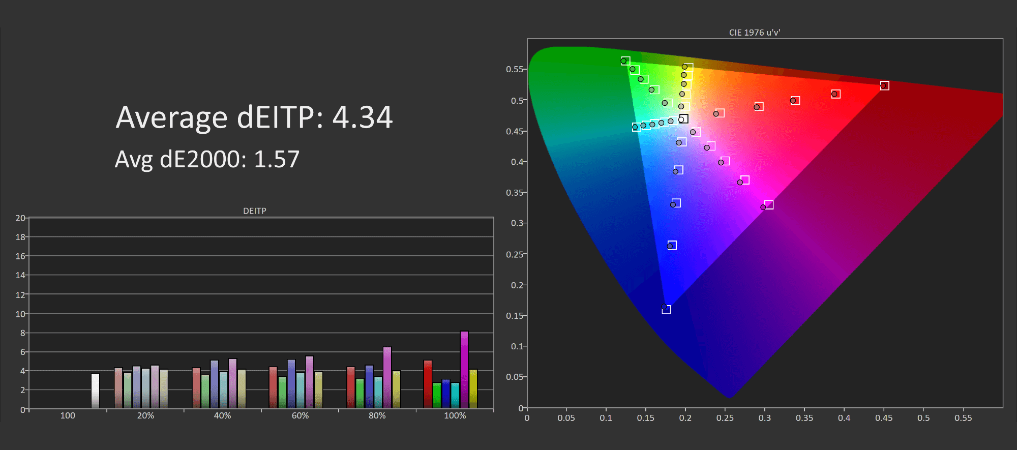 In terms of accuracy numbers, in our saturation sweeps we see a deltaE 2000 average result below 2.0 and deITP around 4 which is very good, and this carries across into the ColorChecker results, indicating only a small difference between what the monitor outputs and what is accurate. Greyscale results are not as good, there was a slight tint with my unit but reasonable adherence to the sRGB gamma curve.