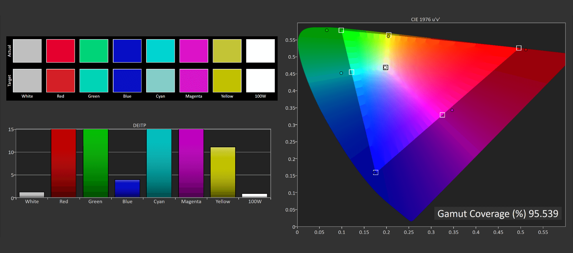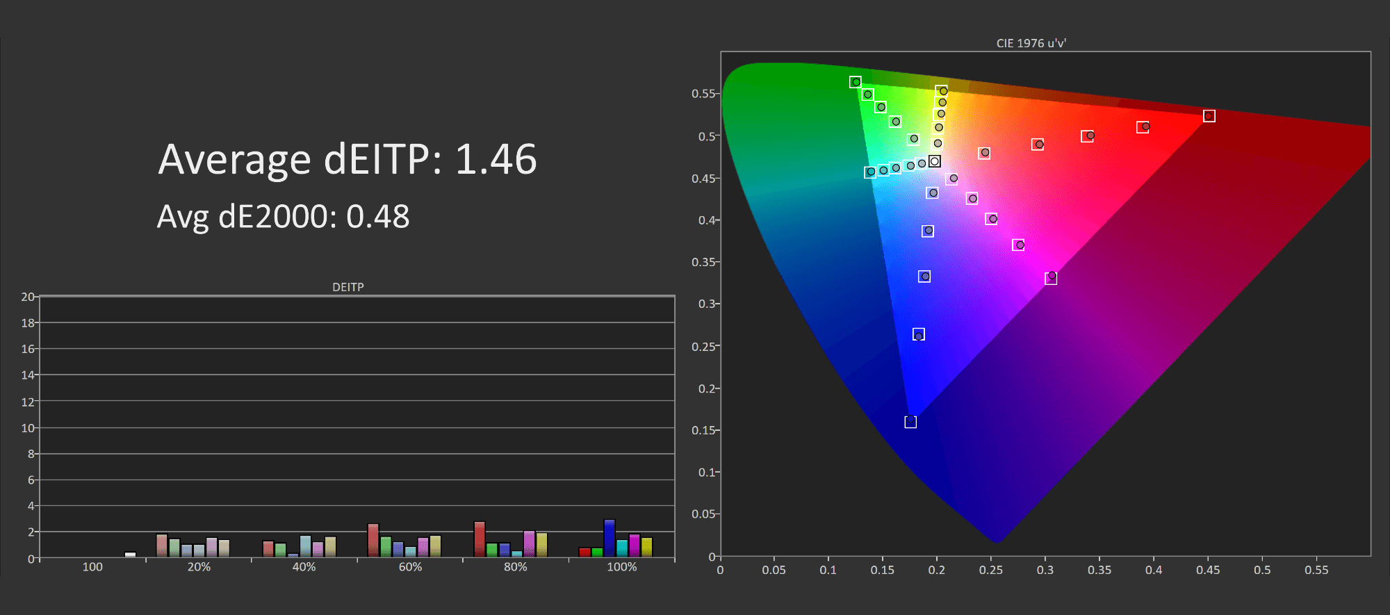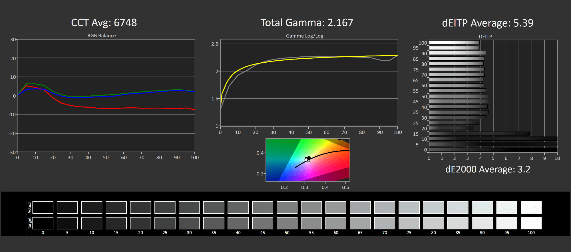 In terms of accuracy numbers, in our saturation sweeps we see a deltaE 2000 average result below 2.0 and deITP around 4 which is very good, and this carries across into the ColorChecker results, indicating only a small difference between what the monitor outputs and what is accurate. Greyscale results are not as good, there was a slight tint with my unit but reasonable adherence to the sRGB gamma curve.
