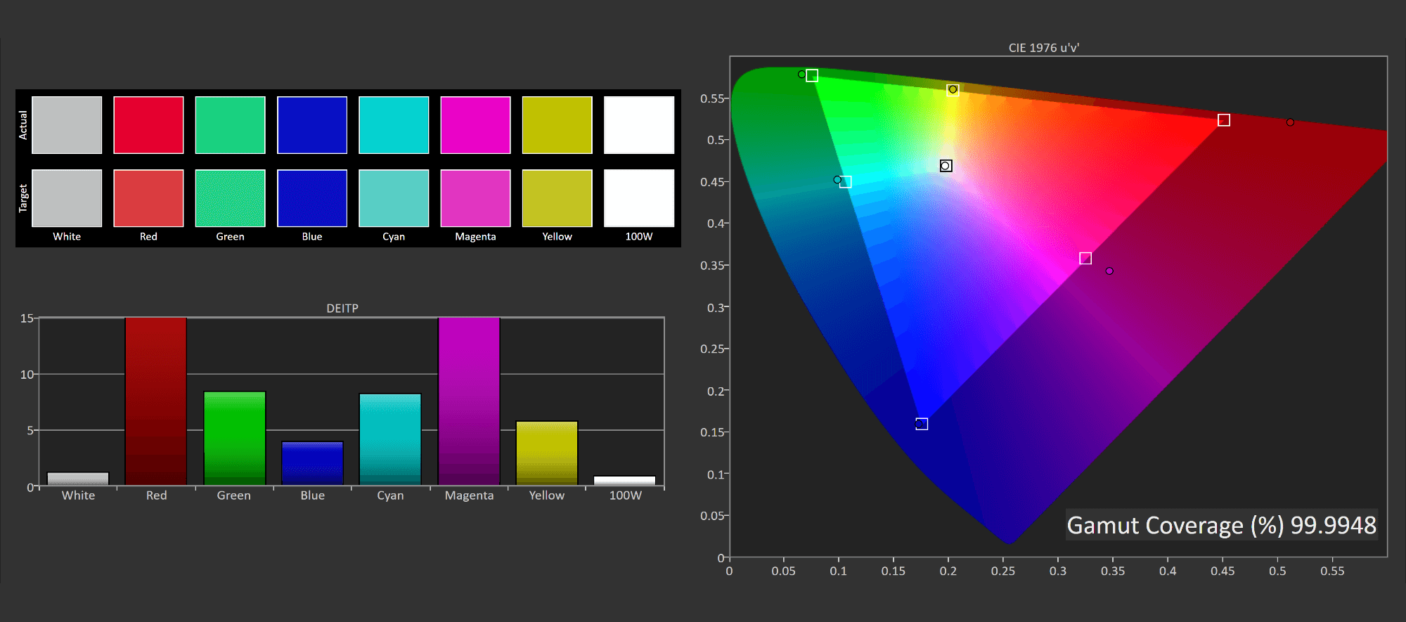 While motion performance may be disappointing, color performance in general is not. The PG32UQX has a very wide color gamut, encompassing 96% of the DCI-P3 color space in our testing, along with 100% Adobe RGB coverage. This makes the monitor great for productivity work in both print and video which requires one or the other of those wide gamuts. Total Rec. 2020 coverage ends up at 82% which is as good as other current AU Optronics high end IPS panels like we saw in the PG329Q.
