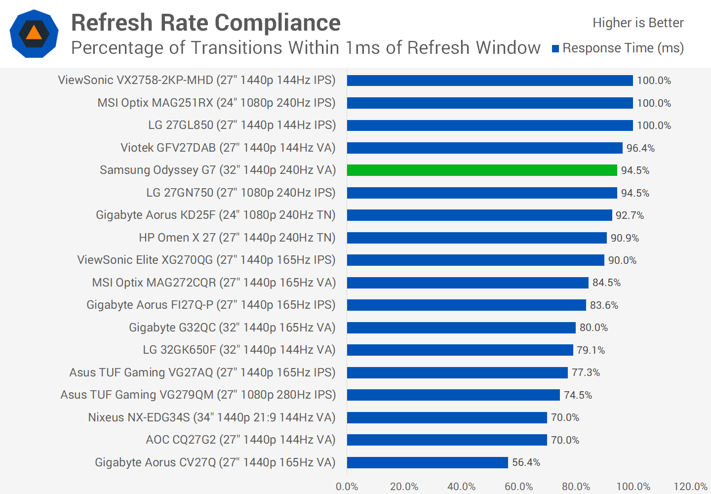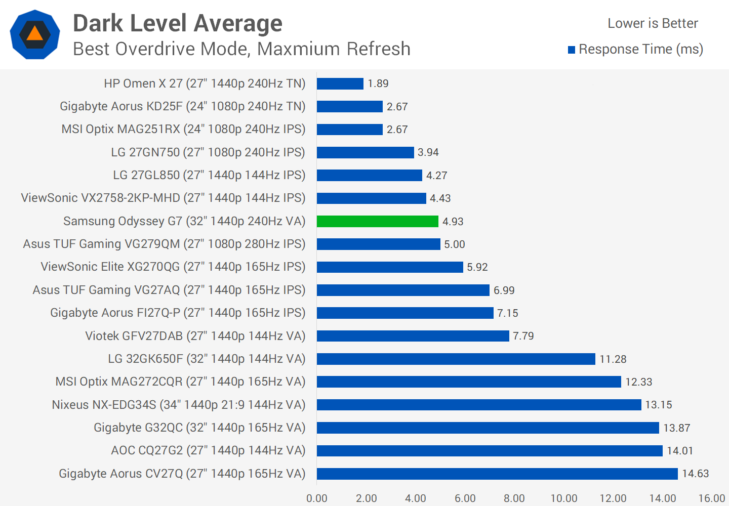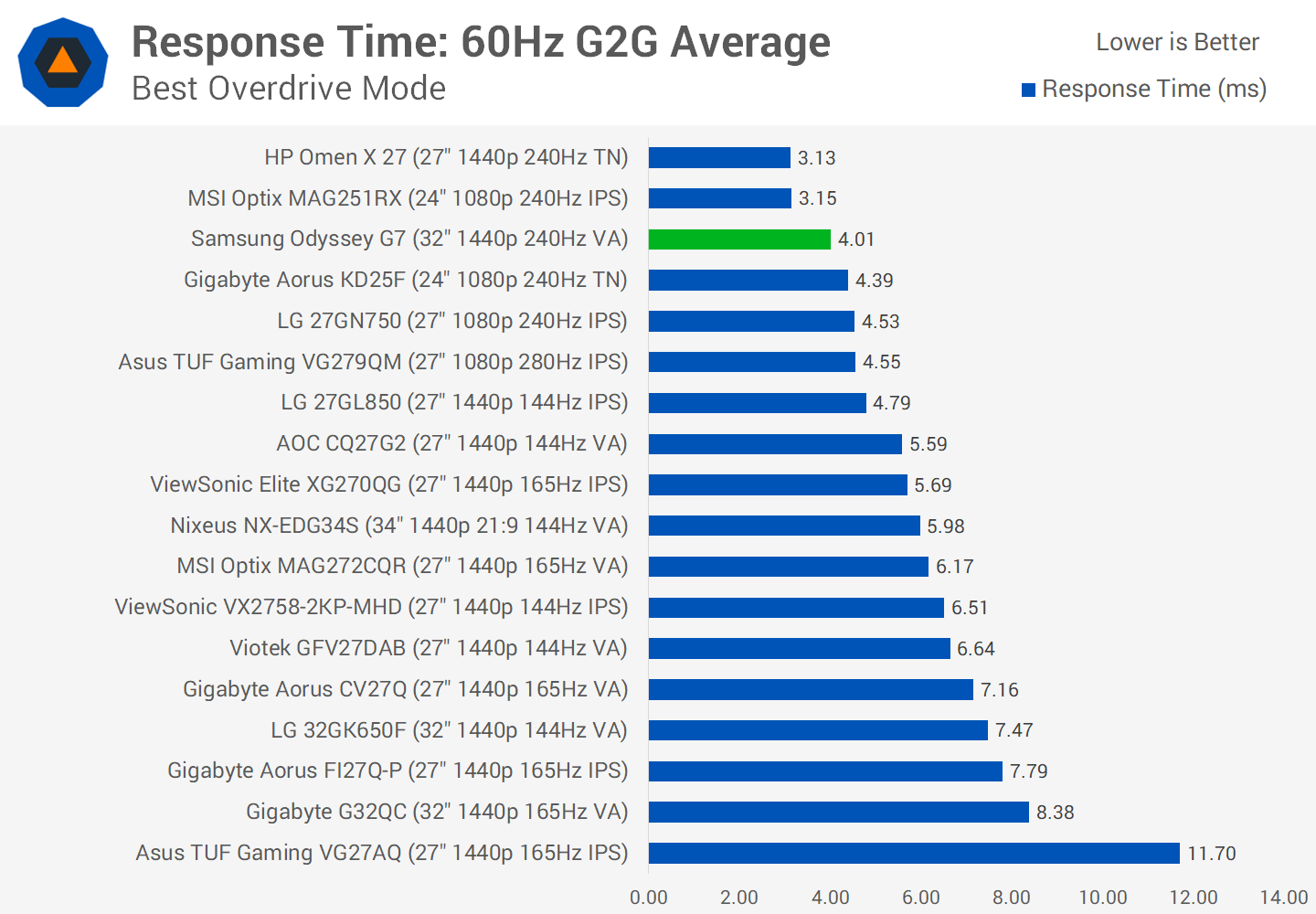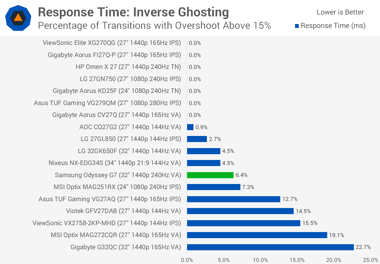 We're also seeing performance that far outstrippes the best VA monitors we had tested before. Something like the Viotek GFV27DAB which all things considered has well tuned overdrive and uses a previous-gen Samsung VA panel, is nearly twice as slow. Then when you look at other options like the LG 32GK650F or AOC CQ27G2, it's a no contest, those VAs aren't remotely in the same class.