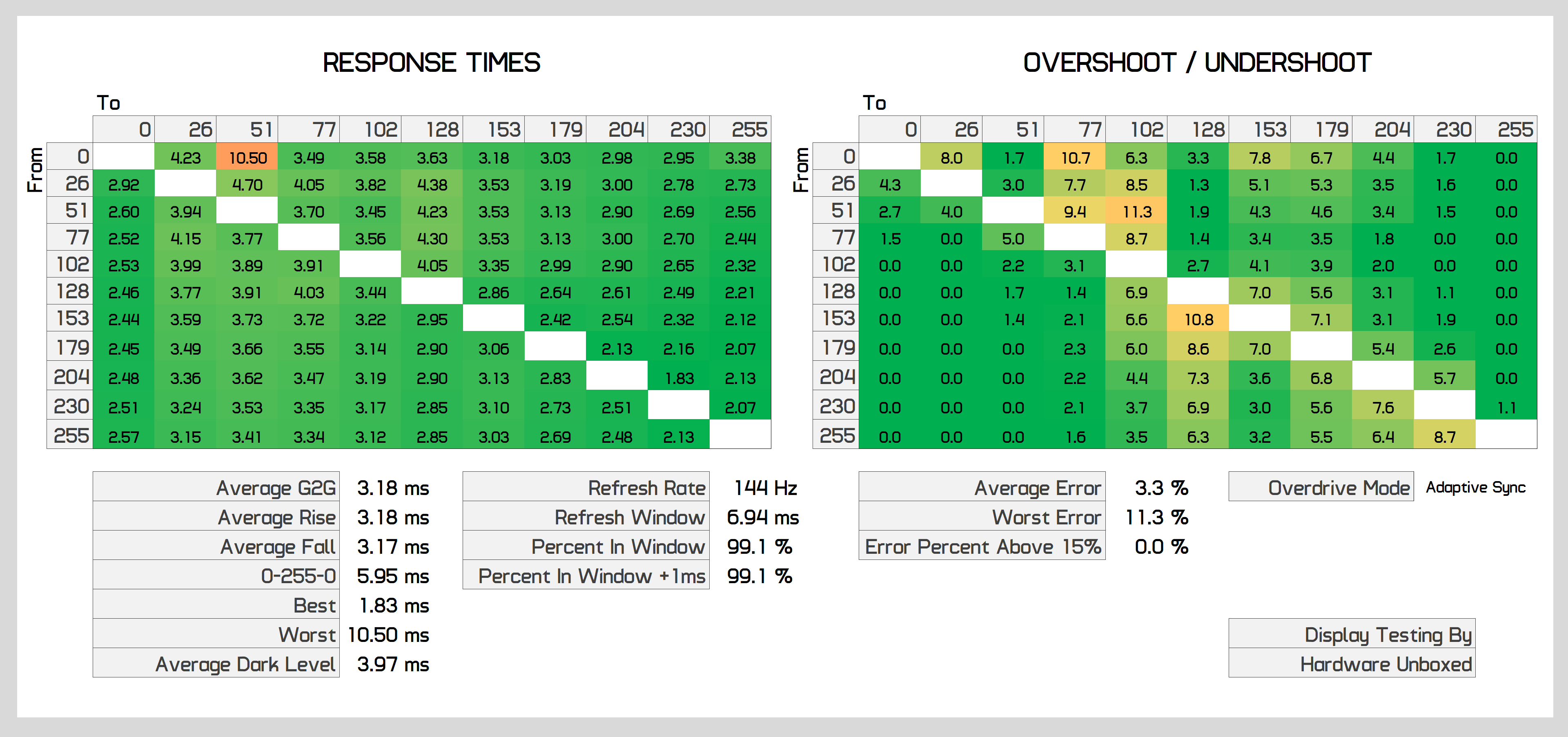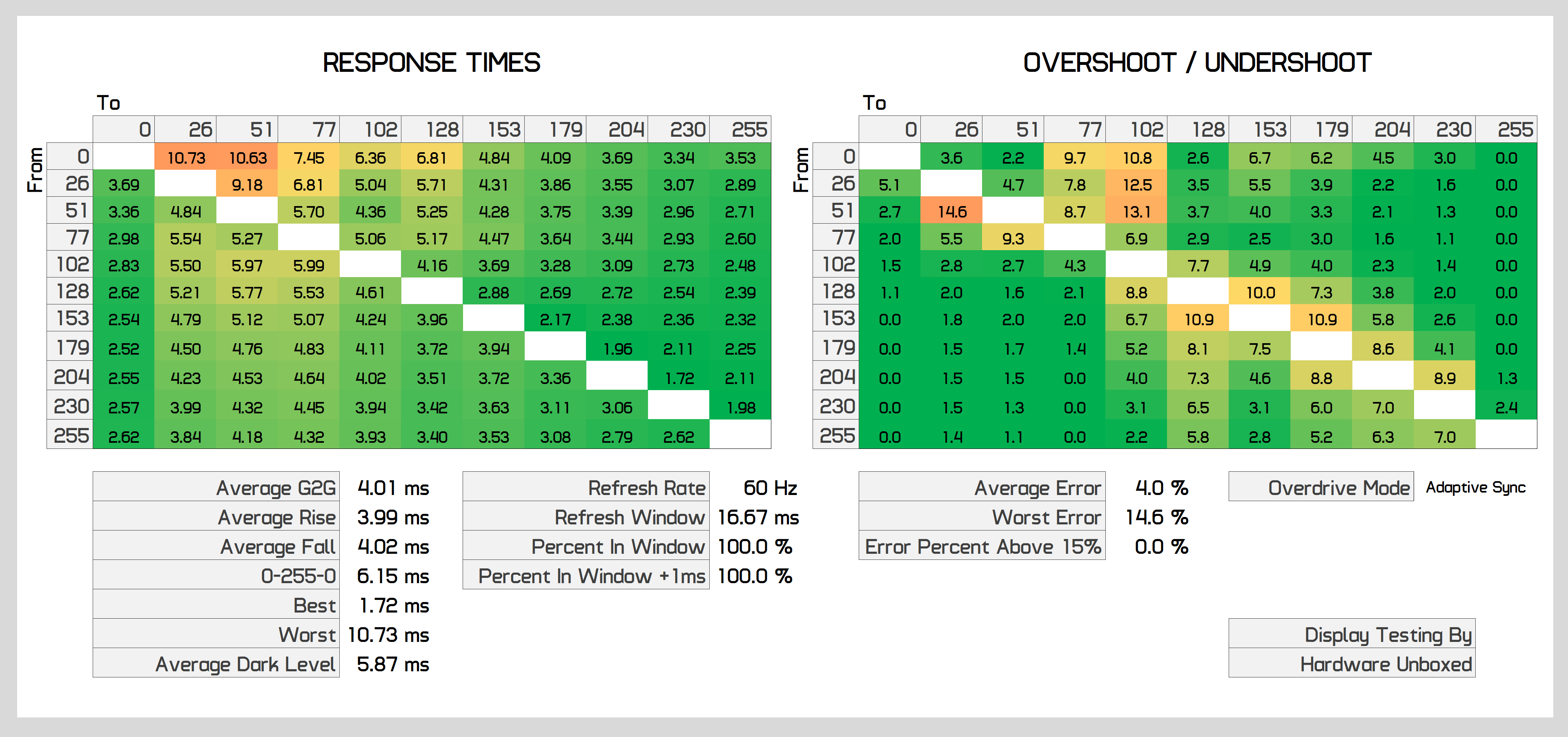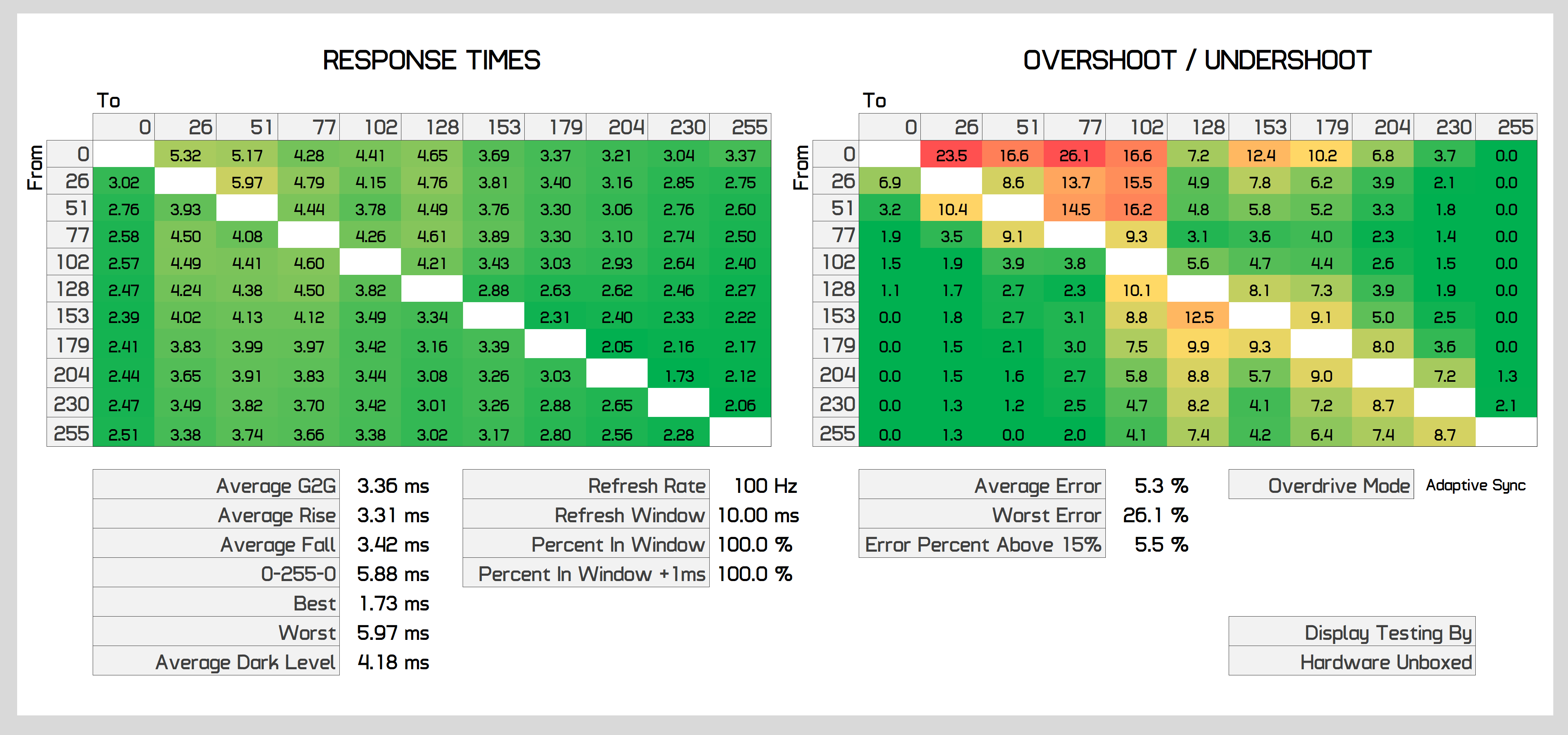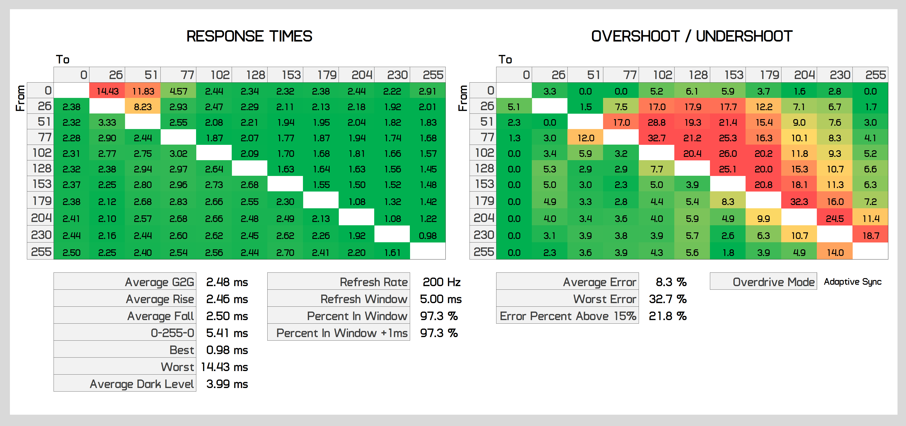 You can push the response times higher if you disable adaptive sync and switch to the "fastest" overdrive setting, however this introduces noticeable inverse ghosting. Both the "standard" and "faster" modes appear identical and perform exactly like the adaptive sync on results we've just been showing.