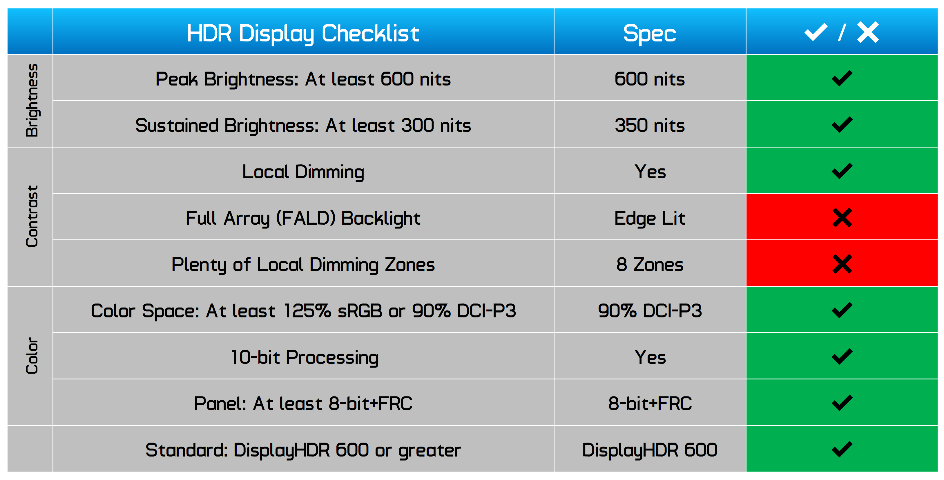 As for HDR performance, we plan to go in-depth on HDR testing later on, but for this review we'll stick to the checklist, which reveals semi-HDR performance. We do get a peak brightness of 600 nits and around 90% coverage of P3 so we do get two of the three pillars of HDR. As the native contrast for the panel is low at around 2000:1, to get the proper contrast required for HDR content, we need local dimming.
