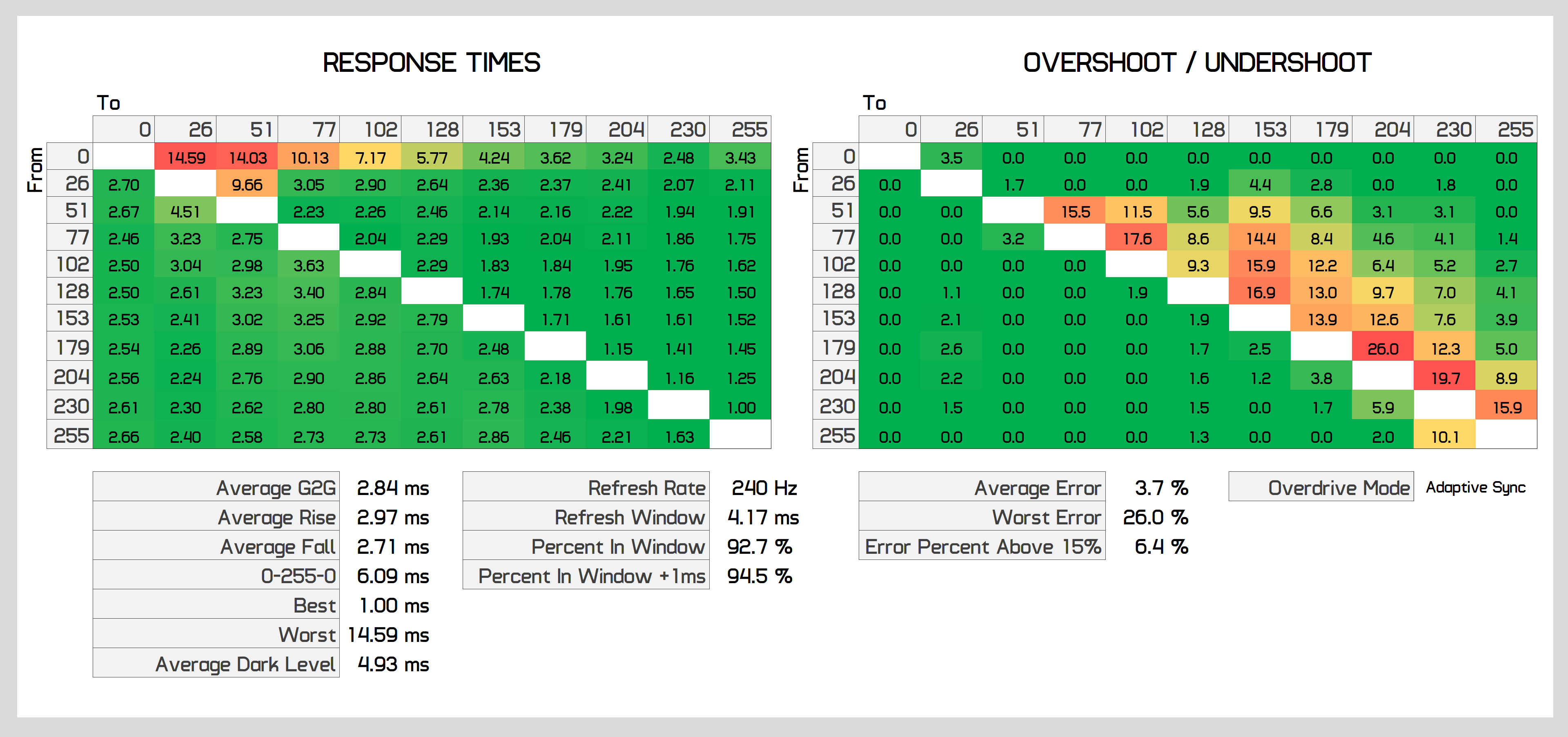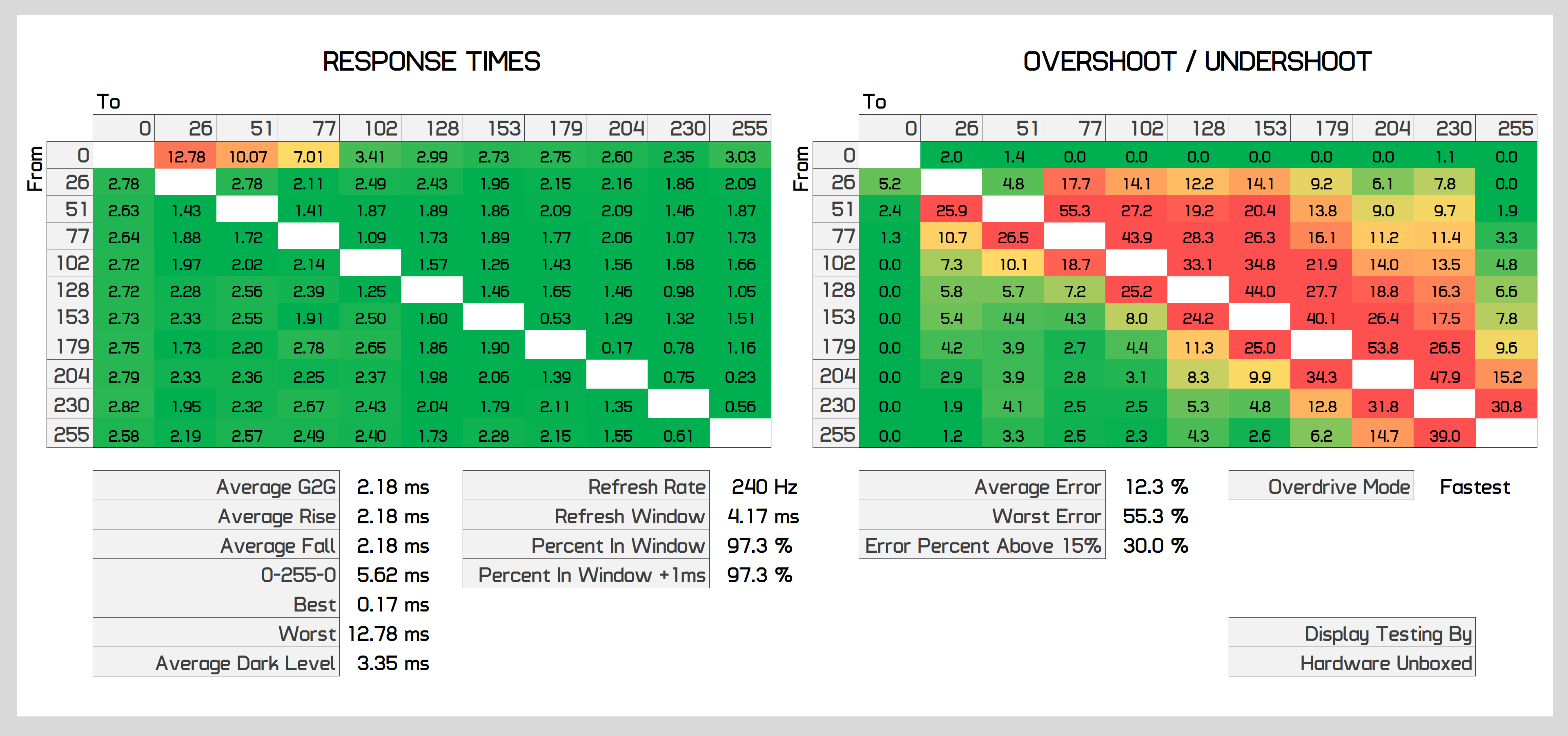 At 240Hz we see an average grey to grey response time of 2.84ms, which means that more than 90% of transitions are truly fast enough for a 240Hz experience. We also see minimal overshoot. Yes, there's a bit creeping in for some sub-2ms transitions, but on the whole you get limited inverse ghosting that we found hard to notice.