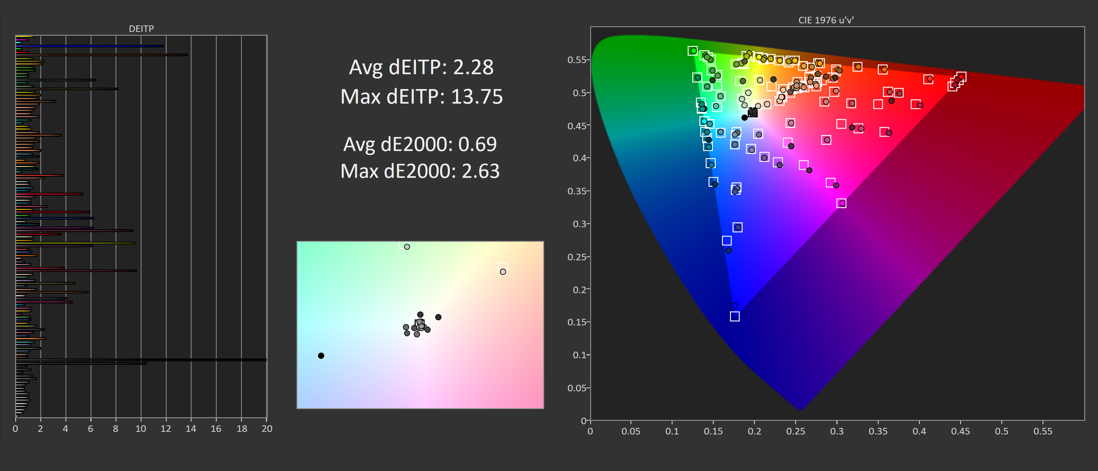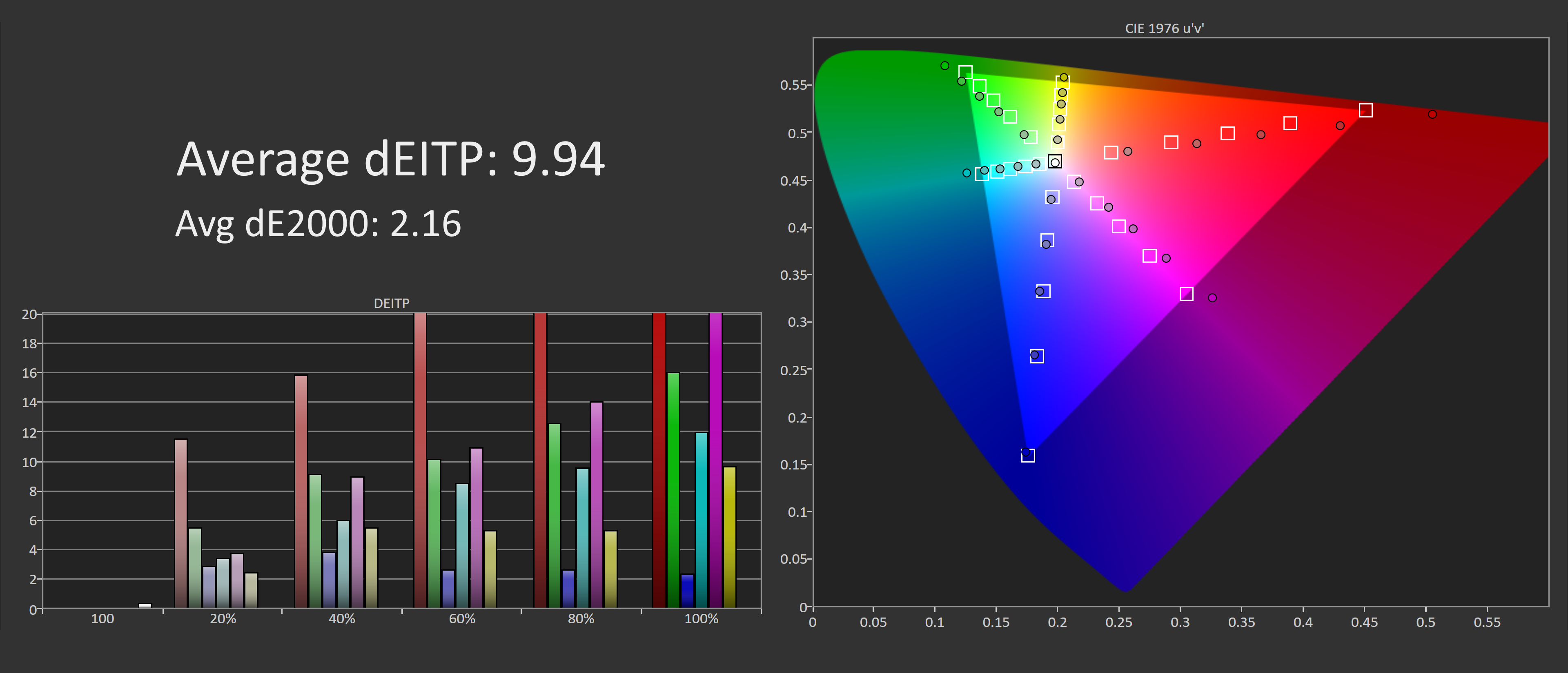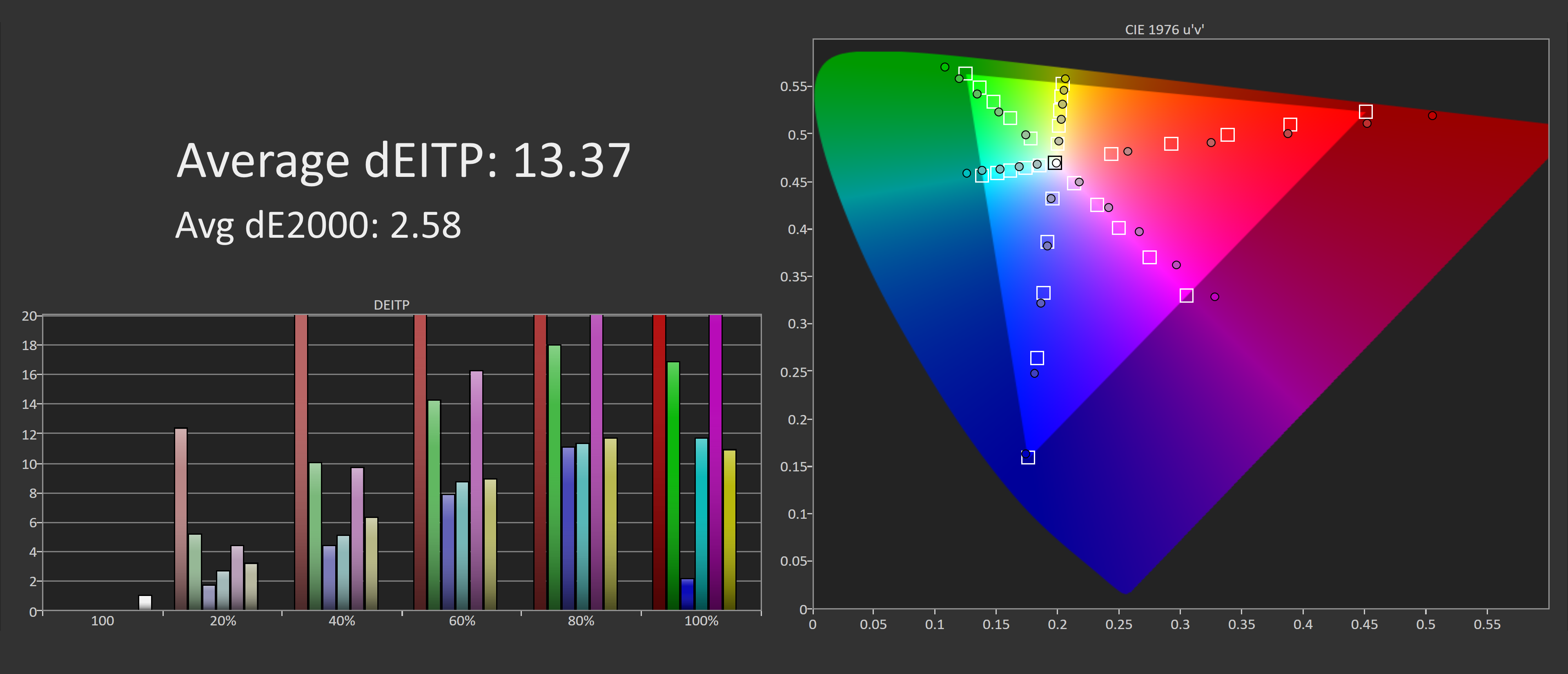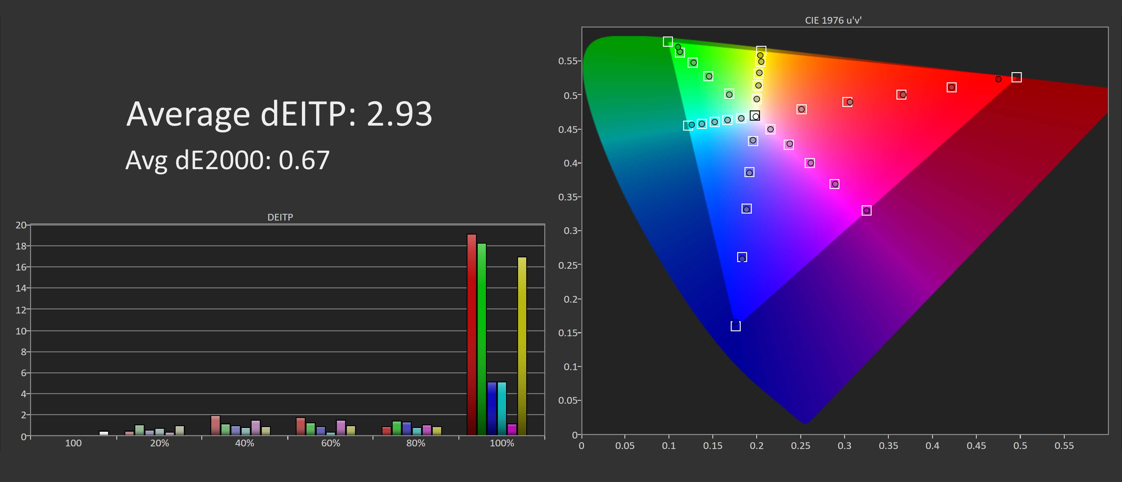 Finally, our full calibration results after a pass through DisplayCAL. Excellent sRGB performance thanks to easy 100% coverage, and a nice adherence to the sRGB gamma curve. We end up with deltaE ITPs around 2.0 and deltaE 2000s below 1.0 which is an excellent result.