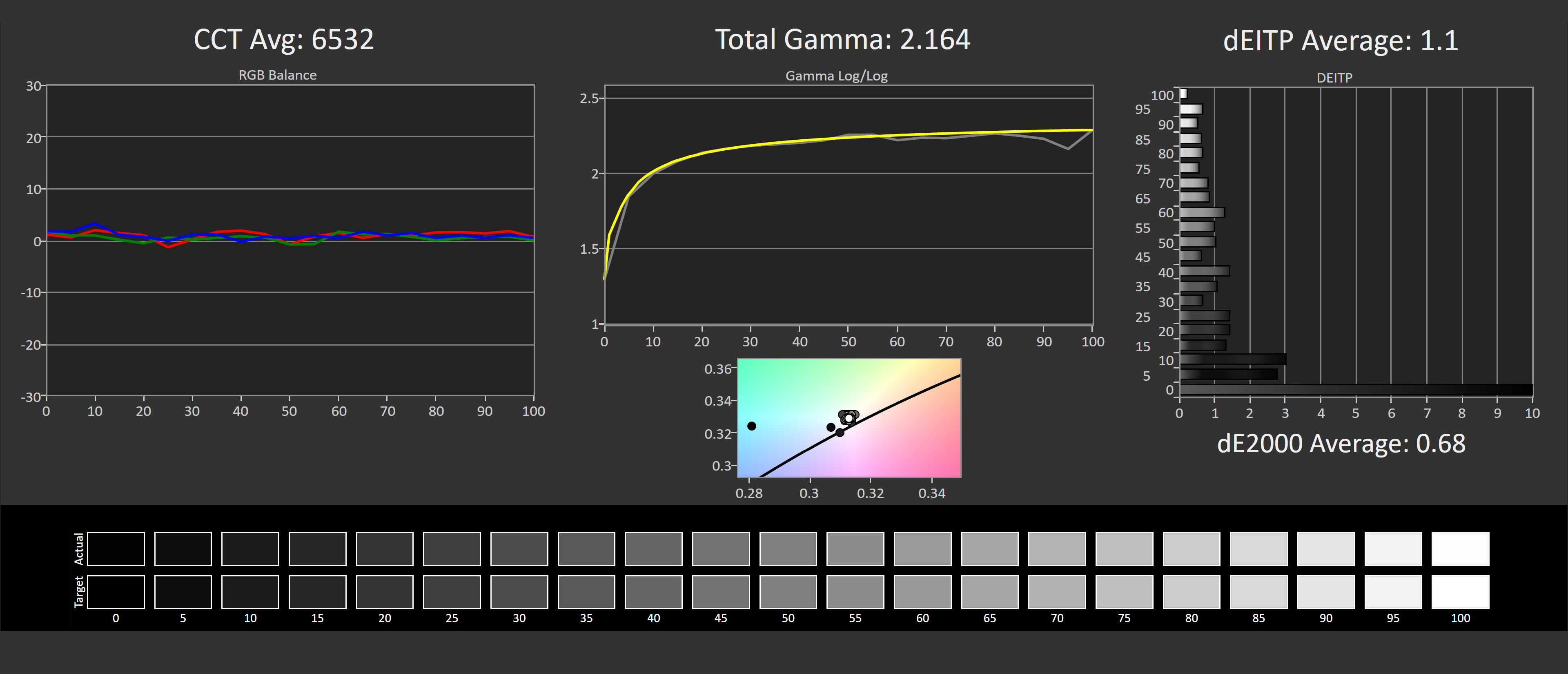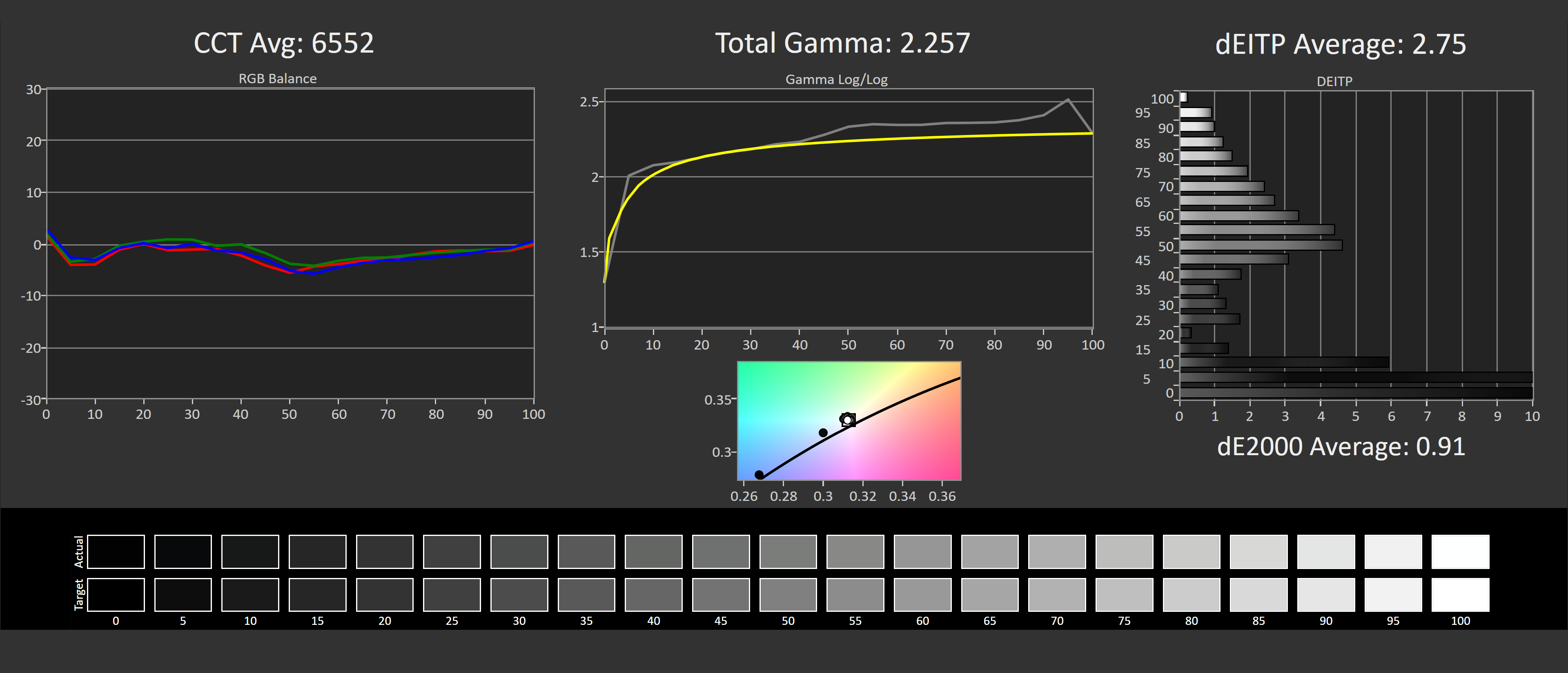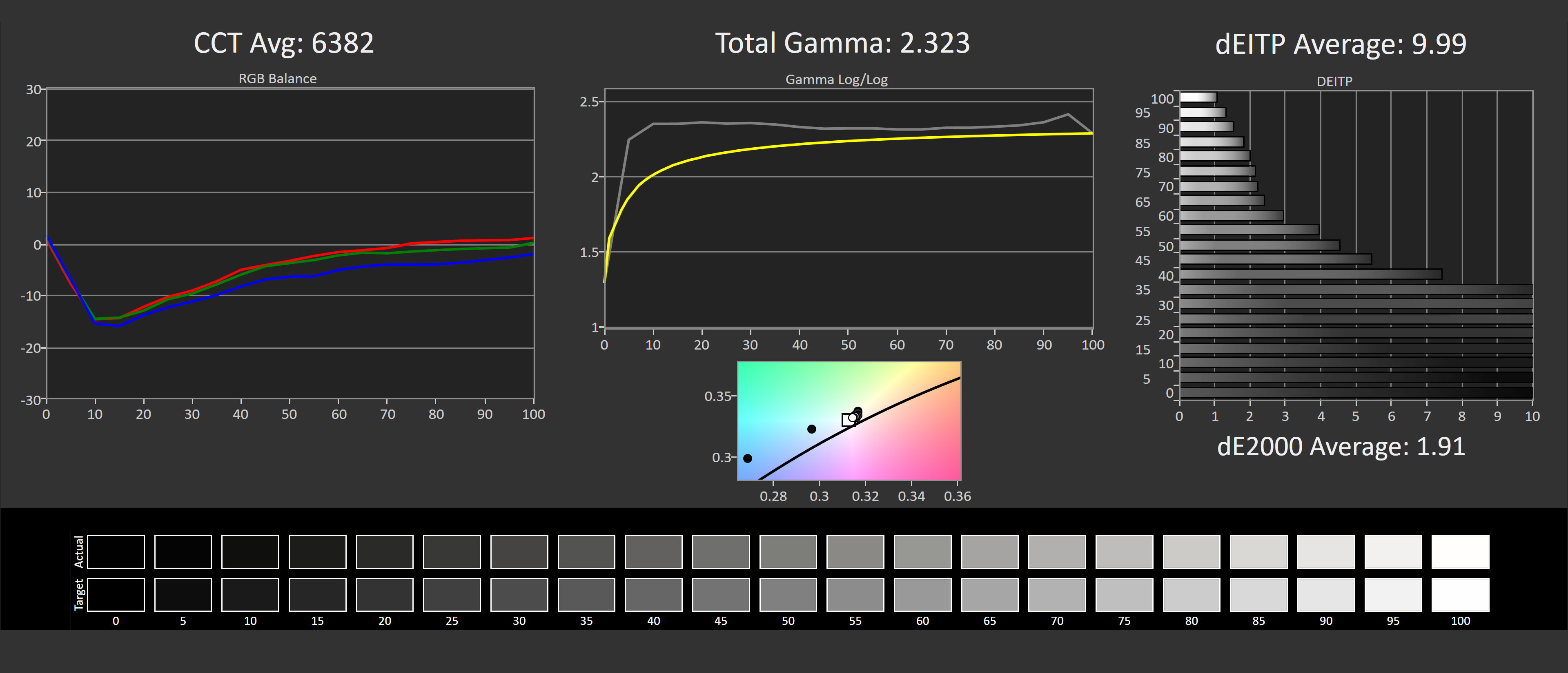 Not bad, but not amazing. A greyscale deltaE 2000 average of 1.91 is respectable and above average for a gaming grade display, and there was no noticeable tint with the retail unit Samsung sent. However the gamma is a bit off, particularly on the low end. What you see below 30% grey is too high of a gamma by default, and what this means is dark shades can be darker than they should be. For gamers this might make dark environments harder to spot enemies in, and for accuracy purists well, it's not quite accurate.