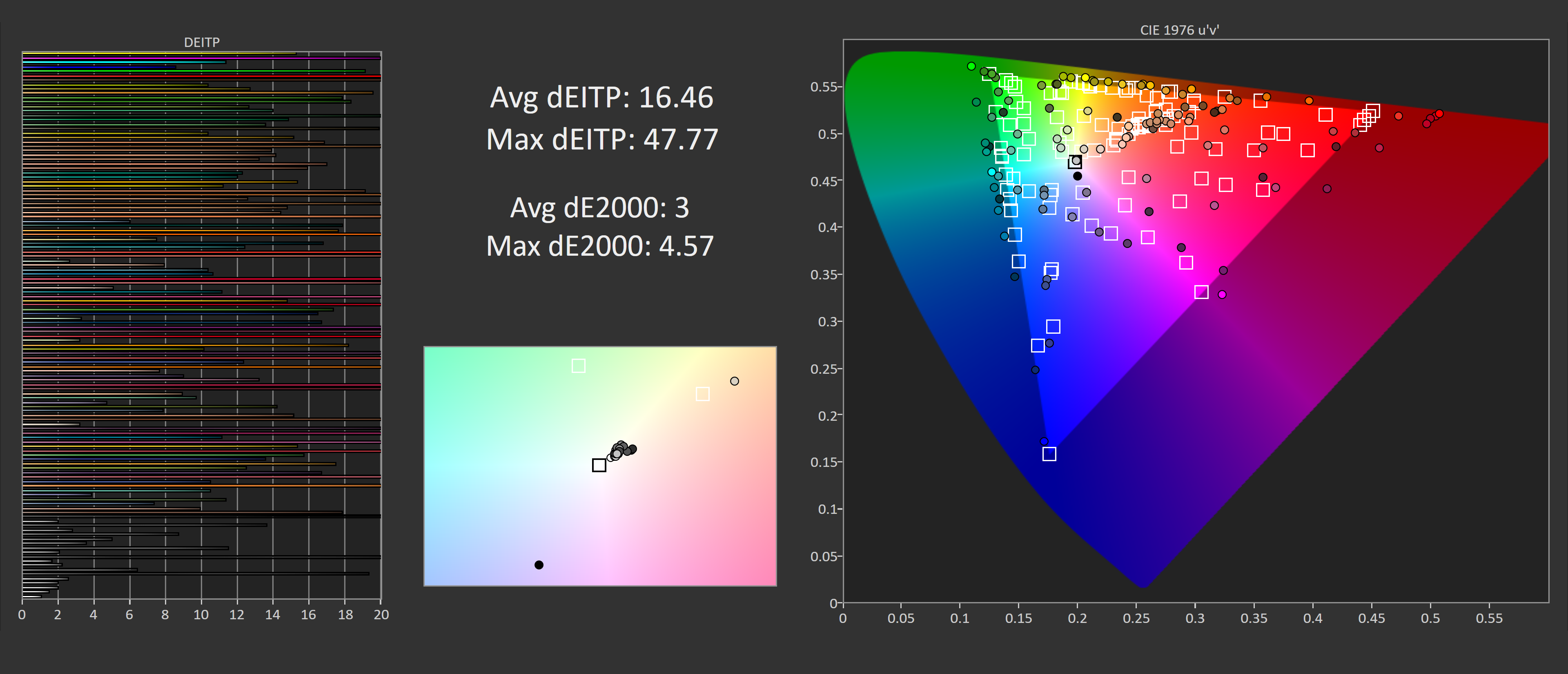 Saturation performance is okay but the monitor does suffer from not having any sRGB clamp by default, the age old issue we see with wide gamut displays. This means that without any further tweaking, the Odyssey G7 will oversaturate standard sRGB images. Similar situation with ColorChecker, a deltaE average of 16.46 is not great.