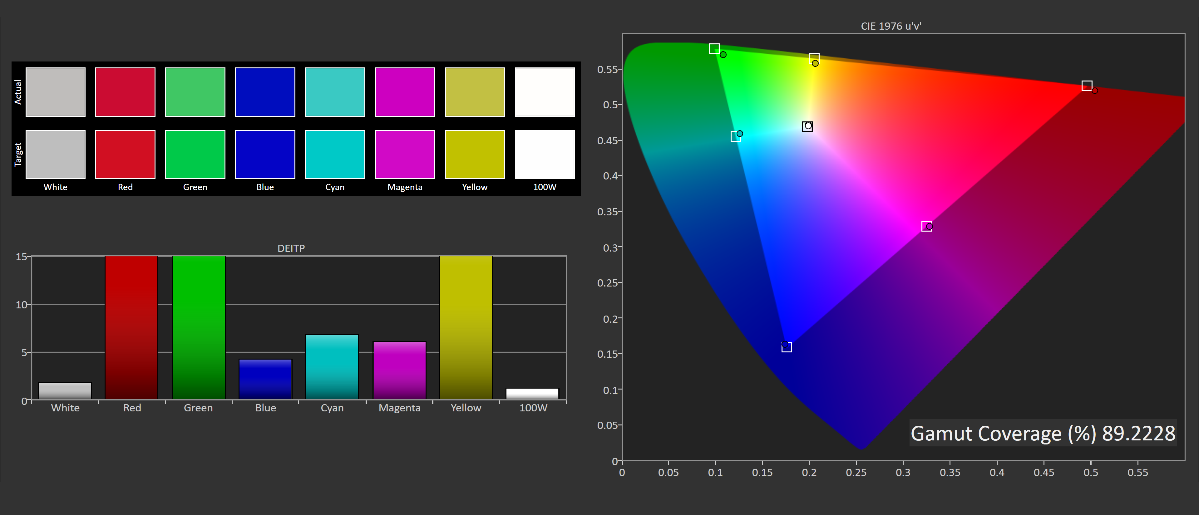 Calibrated P3 performance is also strong with the exception of top-end colors as the display delivers just 89% coverage of the P3 color space. If you really need an accurate monitor for P3 work, we'd recommend choosing an IPS instead.