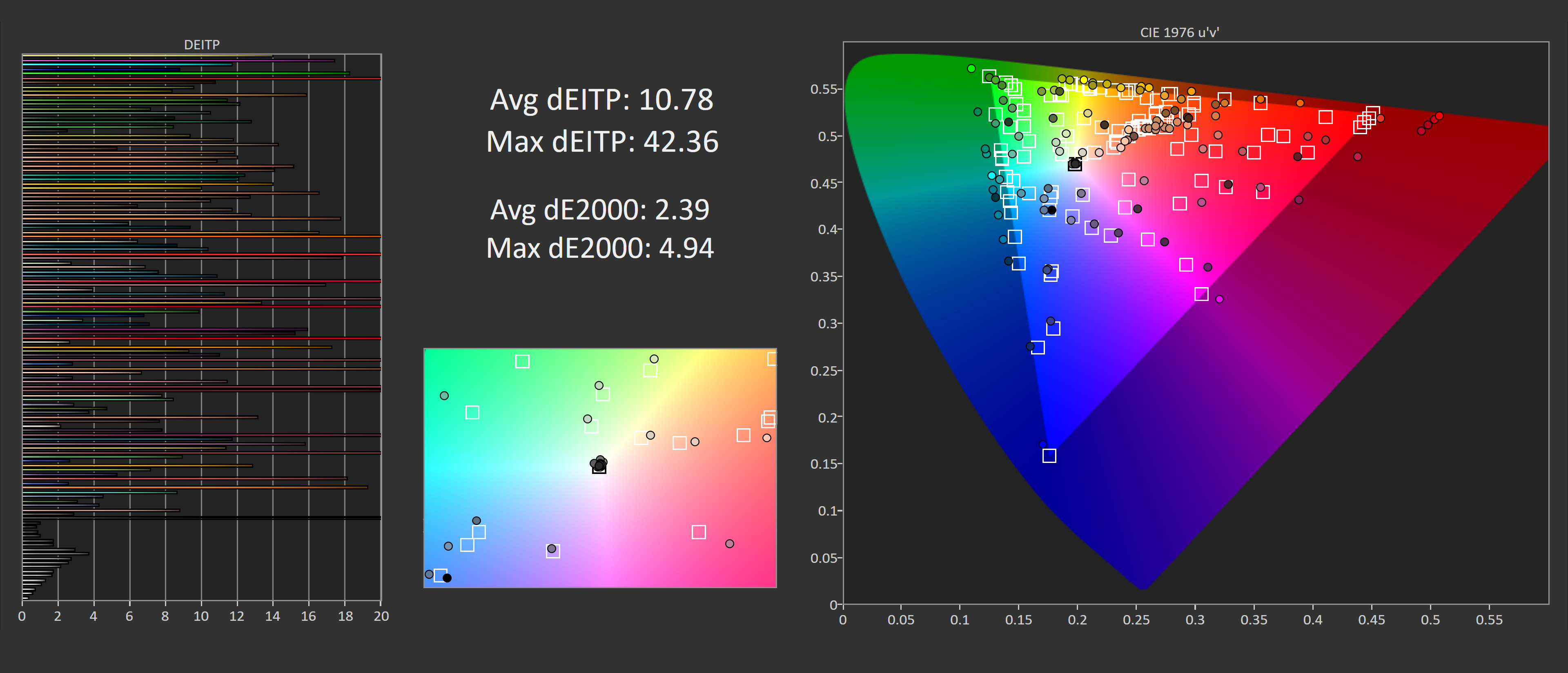 Back to OSD tweaked performance, you can see that especially by changing that Black Equalizer setting, we get much better gamma performance and superior deltaEs, if you think the monitor is too dark out of the box, this might be the setting to change. Outside of greyscale these settings only have a minor impact to performance.