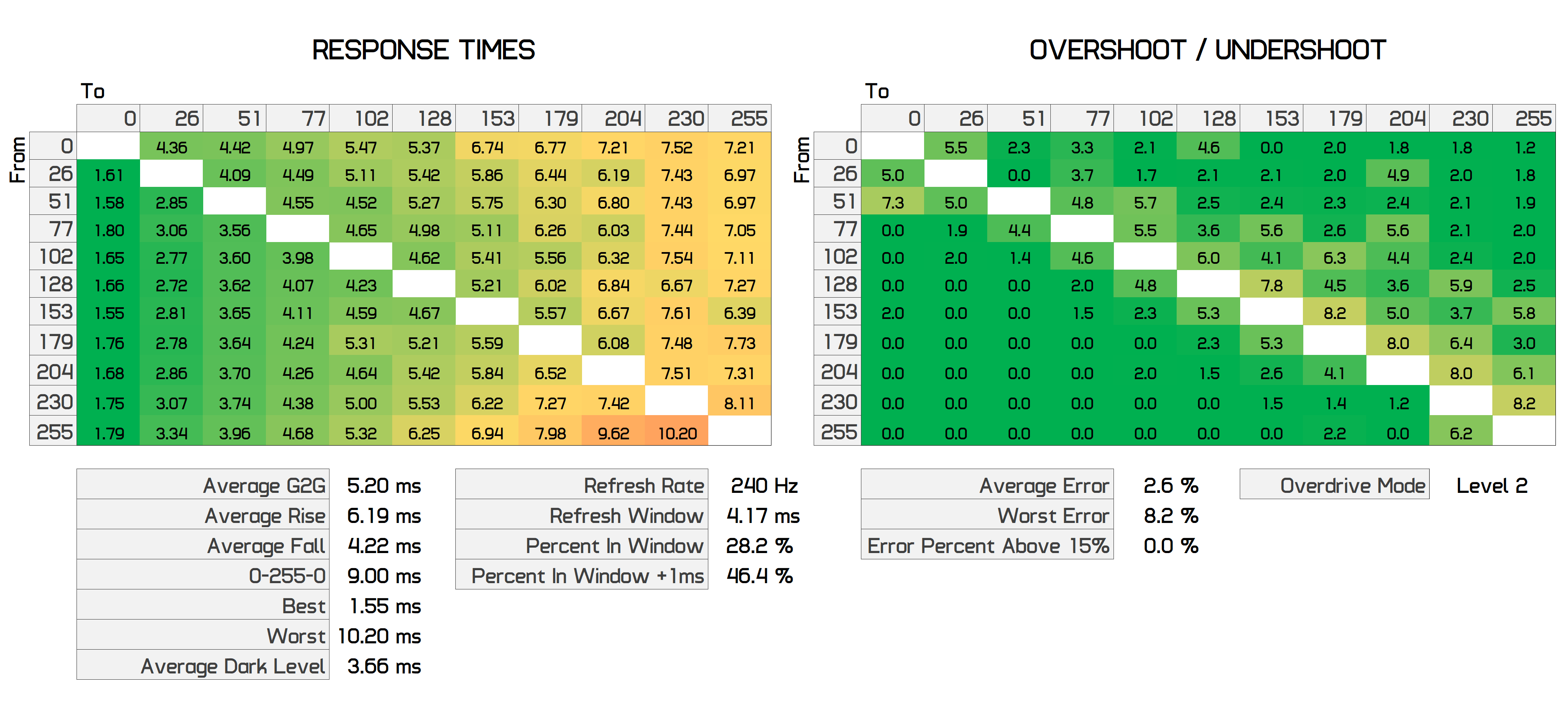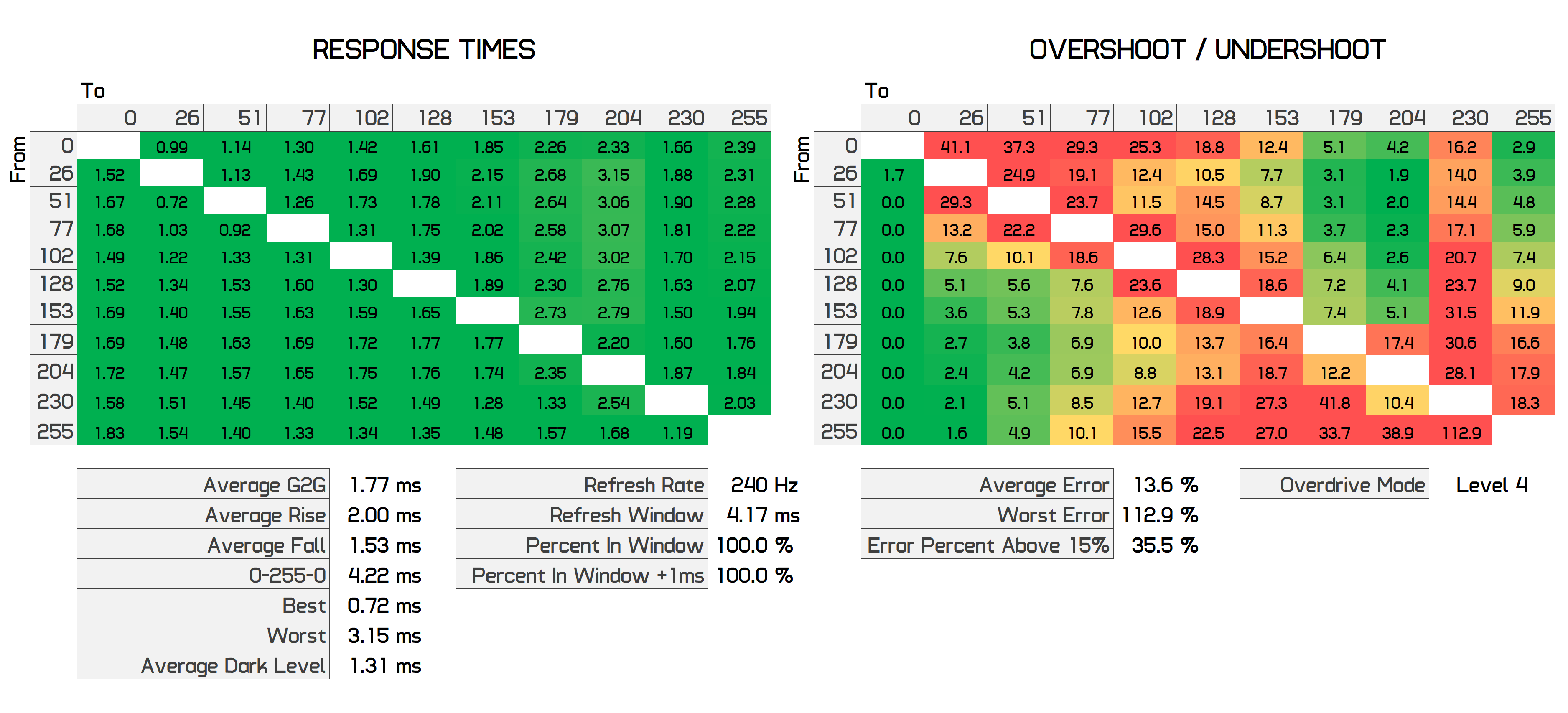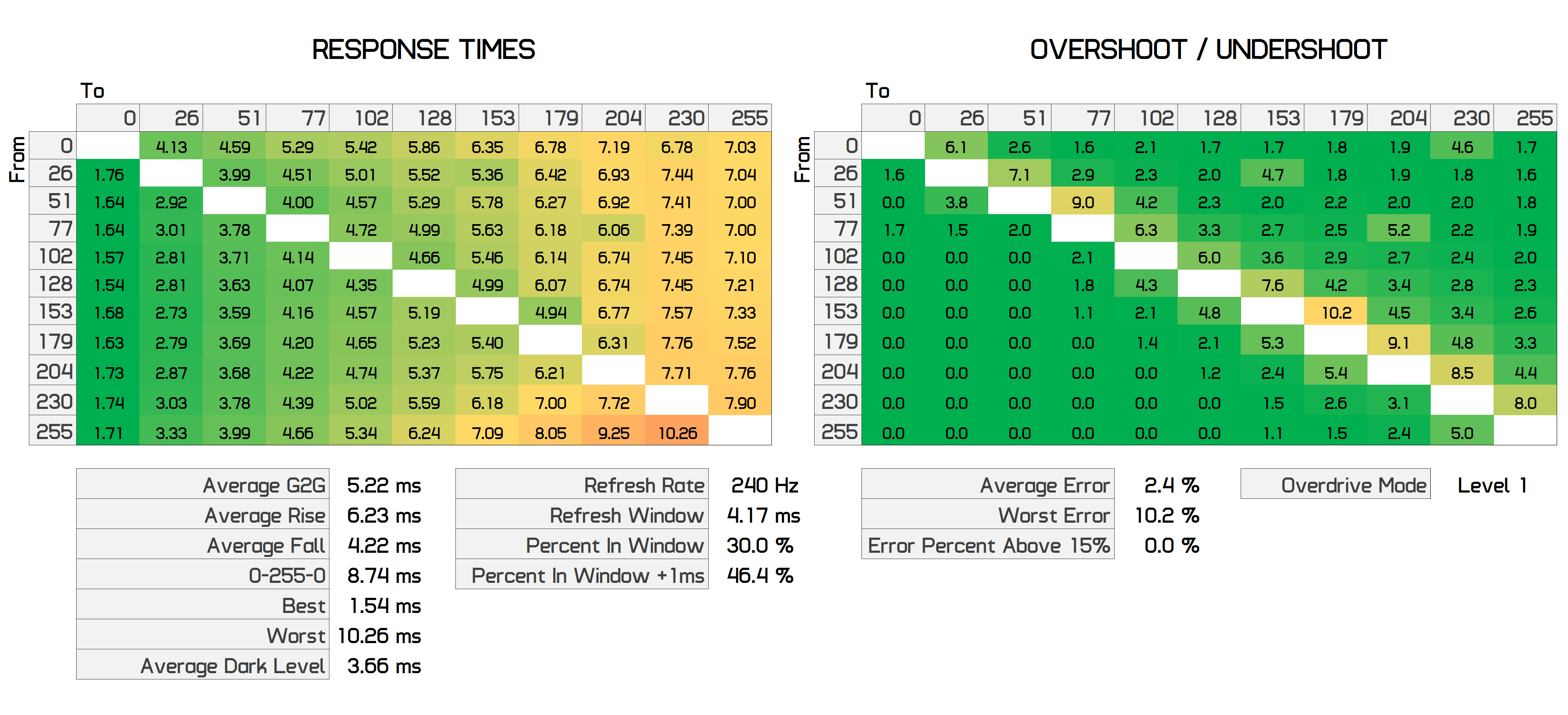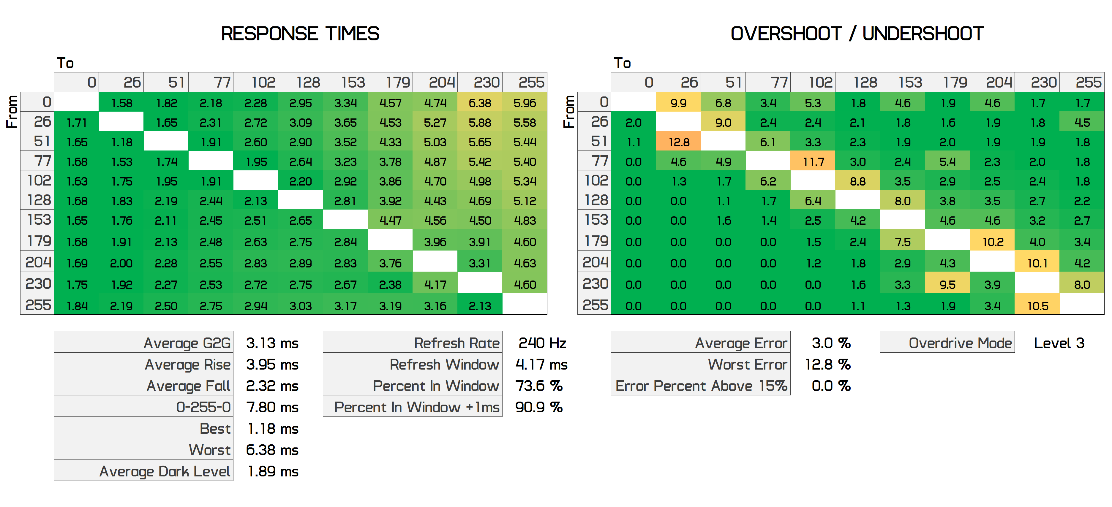 Level 3 is the optimal mode for this monitor. Here we are getting fast performance as you'd hope from TN. The overall grey to grey average is just 3.13ms and you can tell from the visual charts that most transitions are extremely quick at 240Hz, some as low as 1.2ms. Dark level performance is very good, so there's no smearing there either, not that this is unusual for a TN panel.