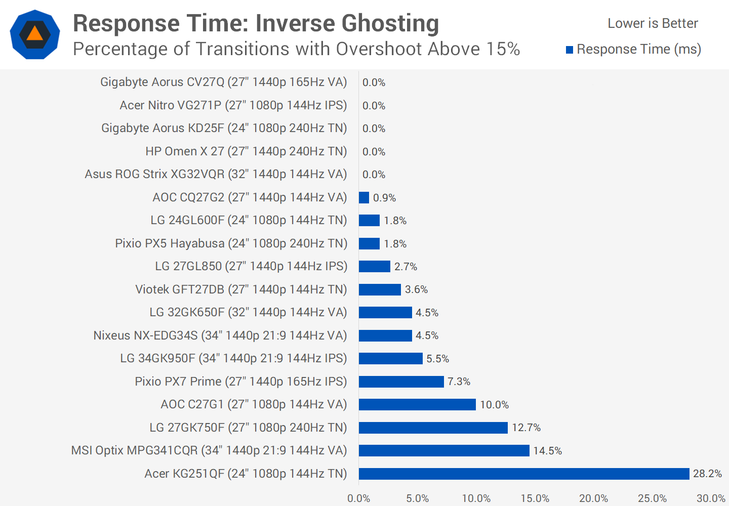The fastest available overdrive mode, Level 4, does push the average grey to grey transition down to 1.77ms, but it does so at the expense of high levels of overshoot. 36% of transitions had overshoot above 15%, many transitions above 20% ,which does cause inverse ghost trails in fast motion. This isn't a mode I'd recommend.