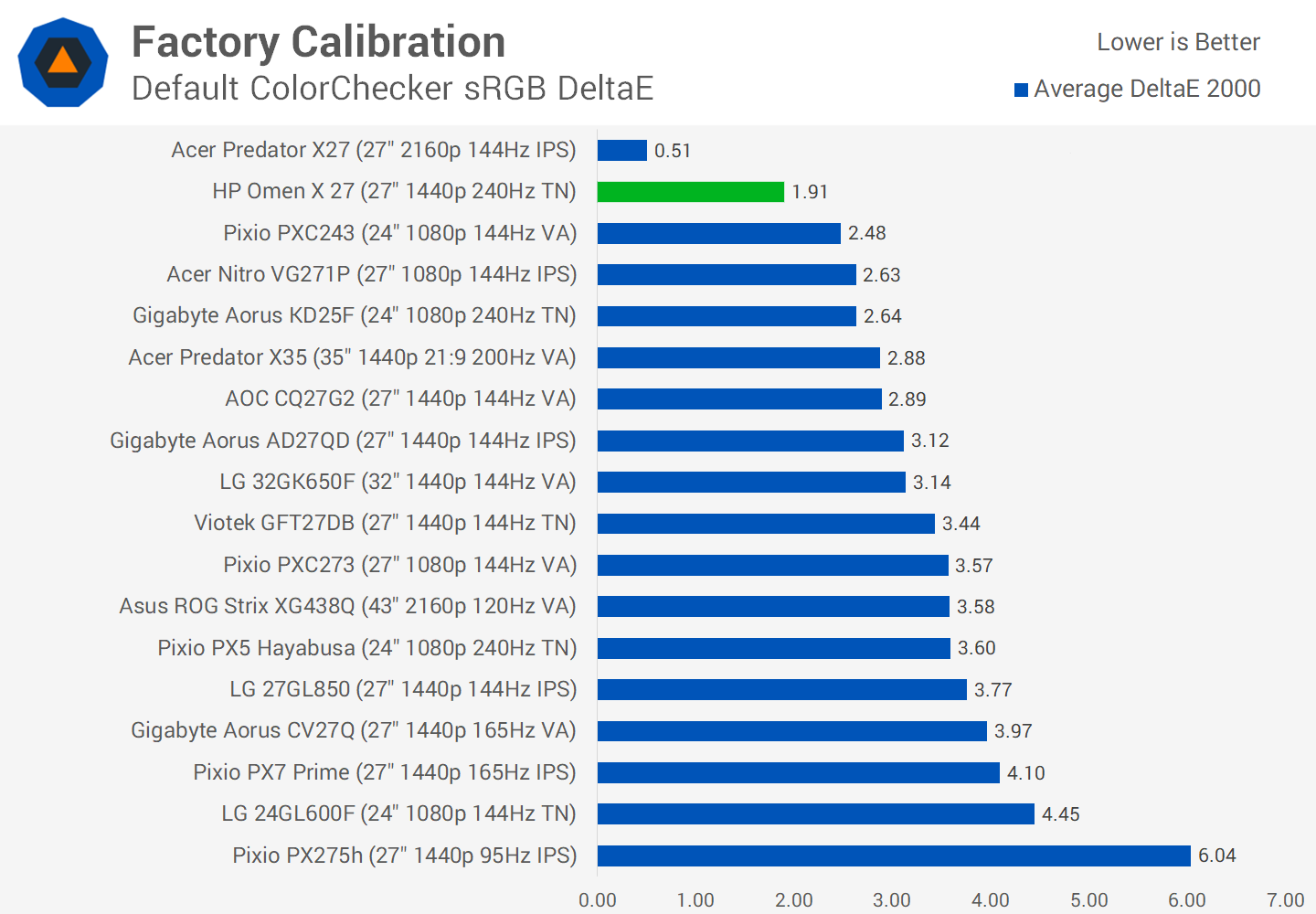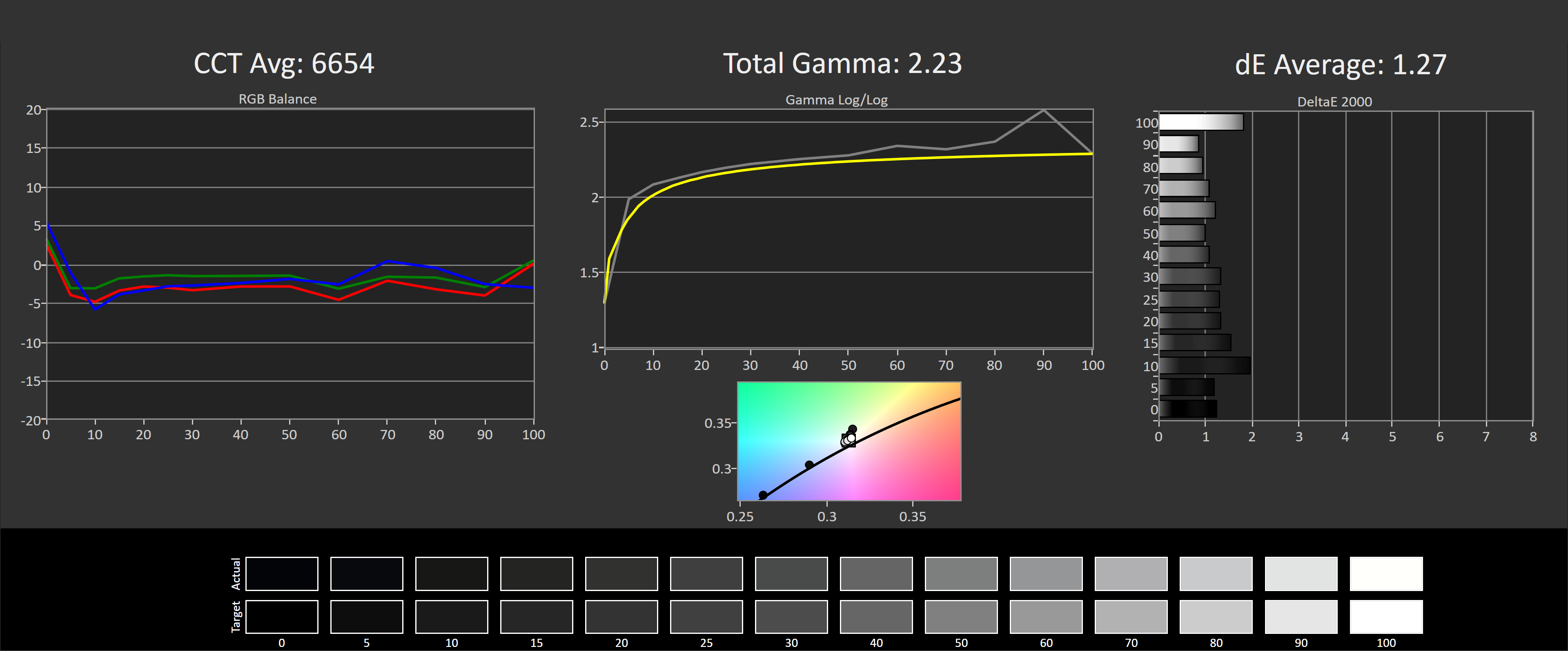 Color performance is surprisingly excellent from the HP Omen X 27, too. This is a wide gamut monitor, however even when measuring against sRGB we see good things. For starters, grayscale performance is very good out of the box, with just a deltaE average of 1.27. As usual, we're targeting below 2.0, so this is very accurate.