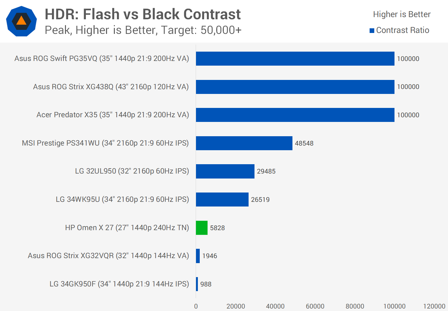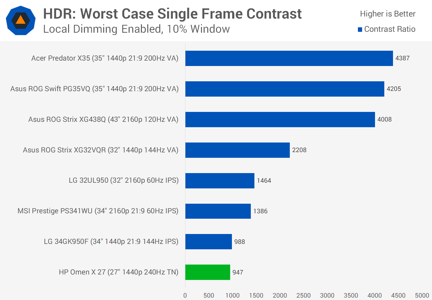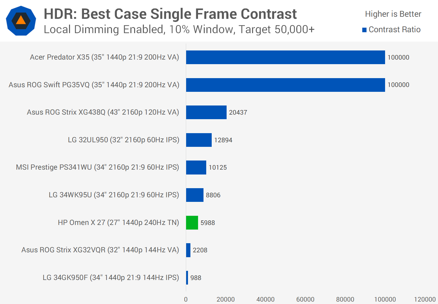The absolute best contrast ratio we can achieve in the HDR mode is around 6,000:1 with the Omen X, which admittedly is more than 6x higher than the panel's default SDR contrast without local dimming. But that's not that impressive against even semi-HDR monitors like the LG 32UL650 with DisplayHDR 600 certification. And in our single-frame contrast tests, again the Omen X falls behind the pack due to its low zone count.