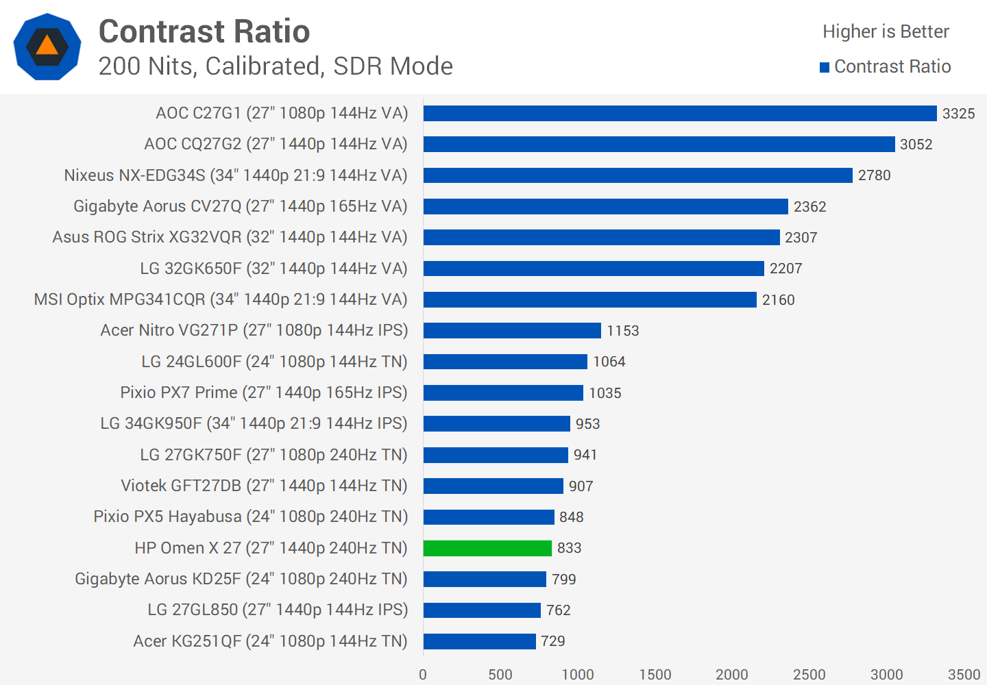 The contrast ratio is also quite weak, at just 833:1 when calibrated. Blacks just don't get very black, and while there are no major backlight bleed issues at least with my unit, if you're viewing this monitor in a dark environment you'll notice that blacks are more like a dark grey. Again, common for all but VA and OLED monitors, but it is a downside of TN technology.