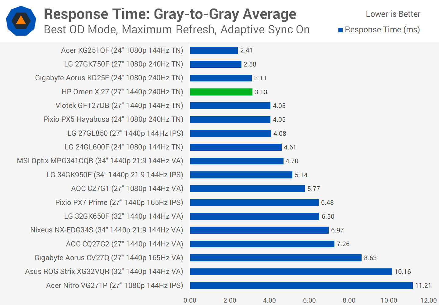 How does the Omen X 27 stack up to other monitors? When looking at grey to grey average we're right in the zone for TN monitors at between 2 and 4ms. The Omen X is a step up from the Viotek GFT27DB we reviewed earlier this year, which is a 1440p 144Hz monitor, although we aren't moving the needle much in terms of delivering faster-than-usual response times. Not that this is necessary, as TN technology has been fast enough for 240Hz refresh rates at 1440p for a while now, it's just about bringing up to speed other areas of the display like the scaler.