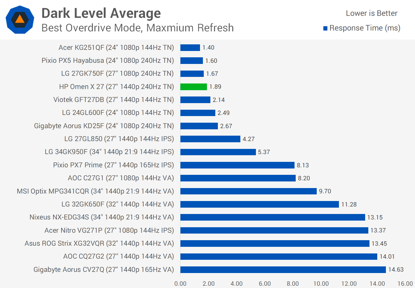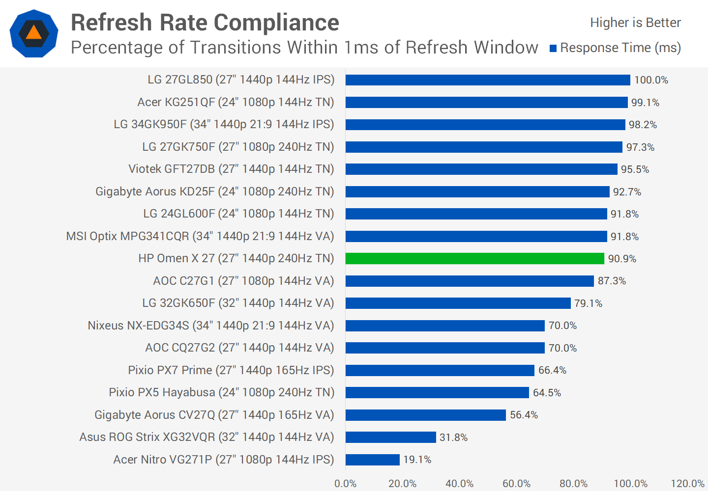 Dark level performance is obviously not an issue for TN monitors, that's only a consideration for VA. And while refresh rate compliance isn't chart topping, anything above 70 to 80% is vert good. With 91% compliance from the Omen X 27, this is more than enough for an excellent 240Hz experience and you won't get much better from other options.