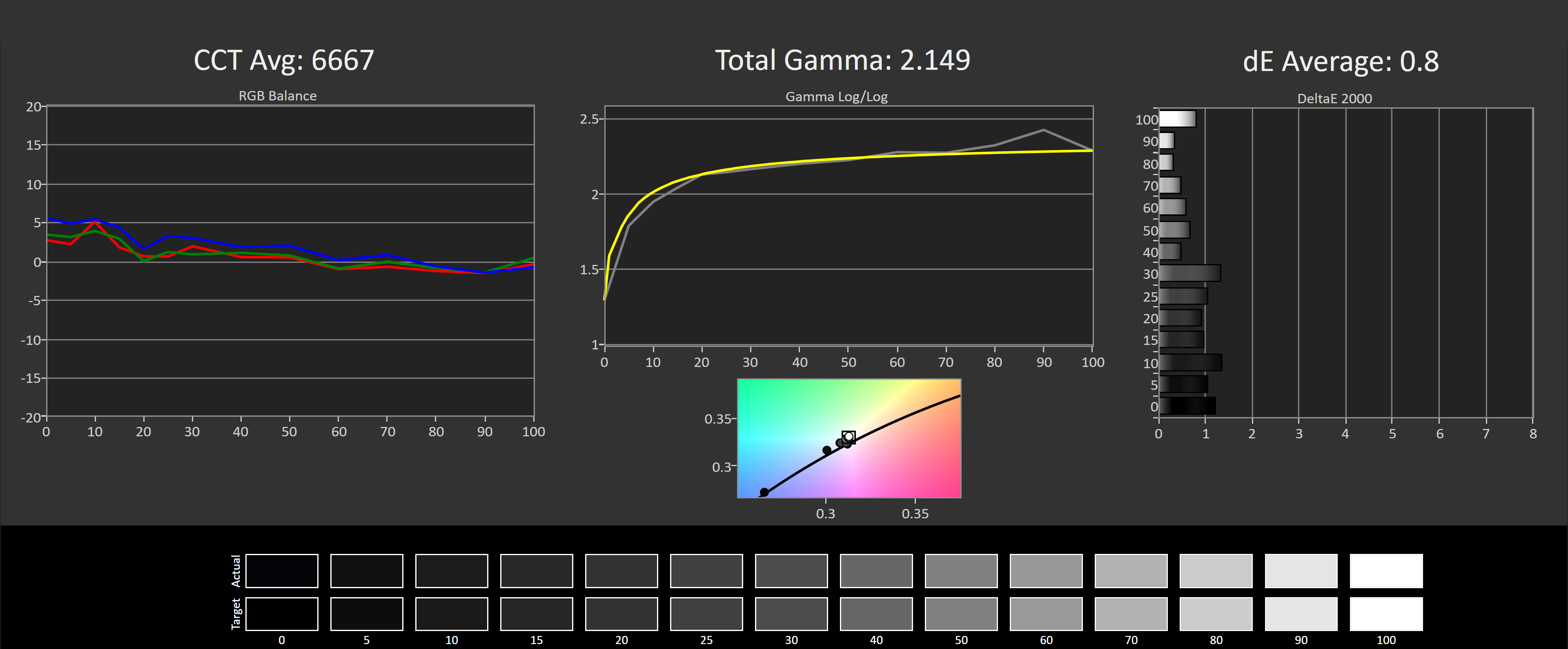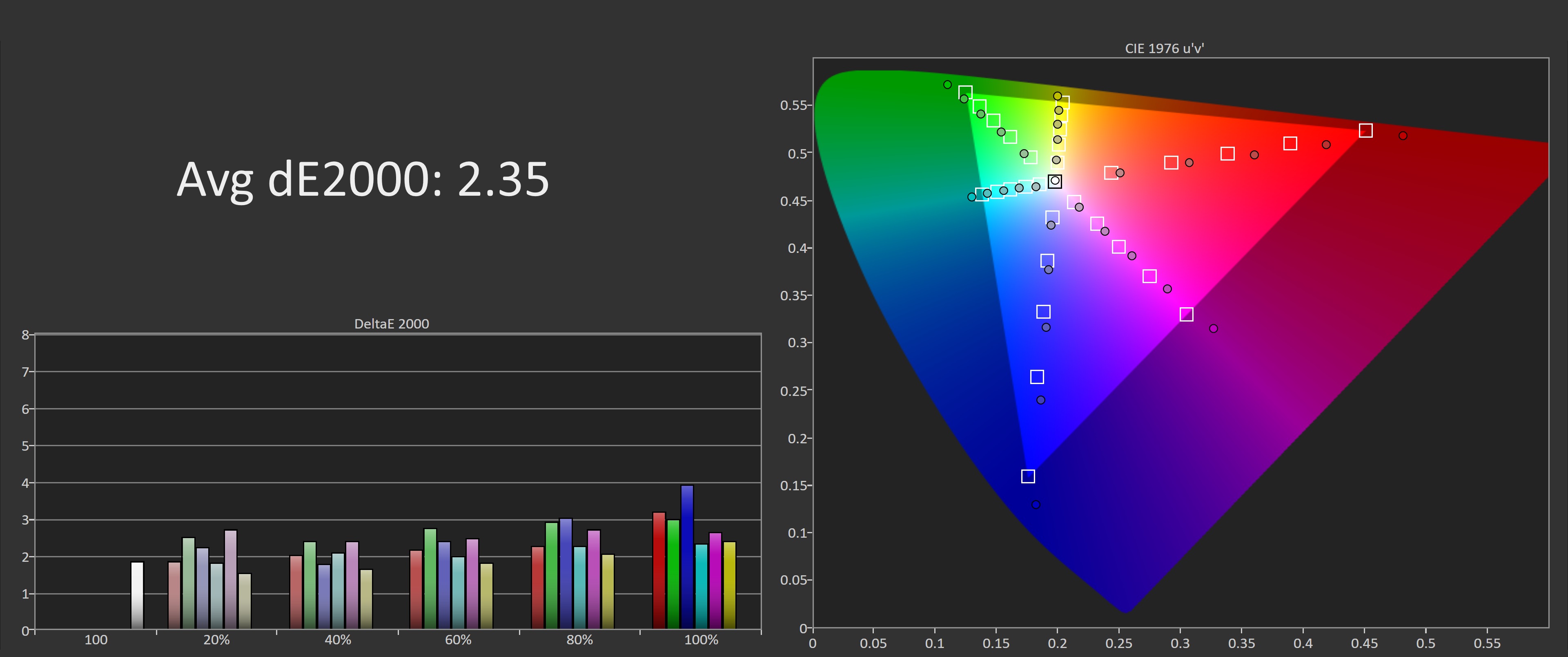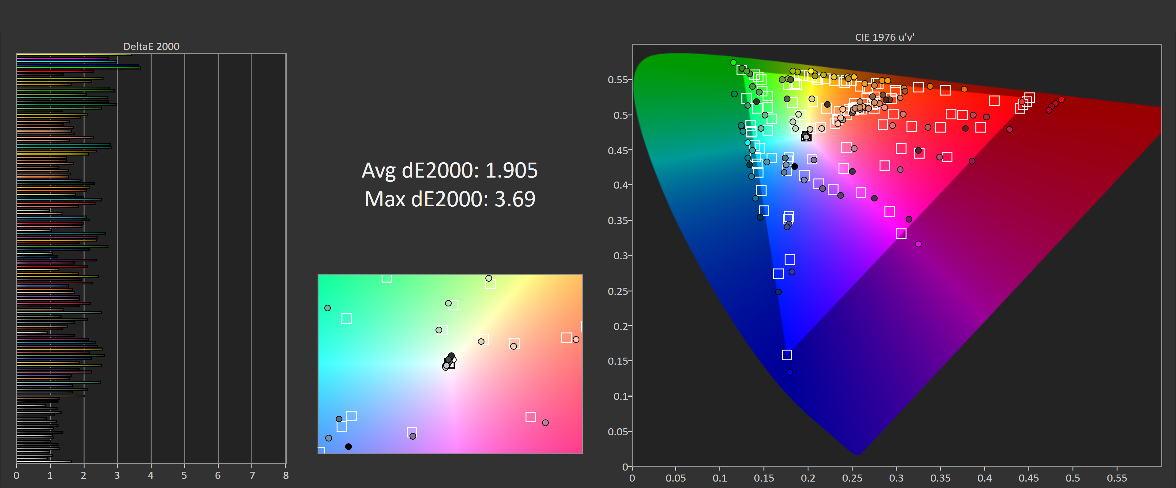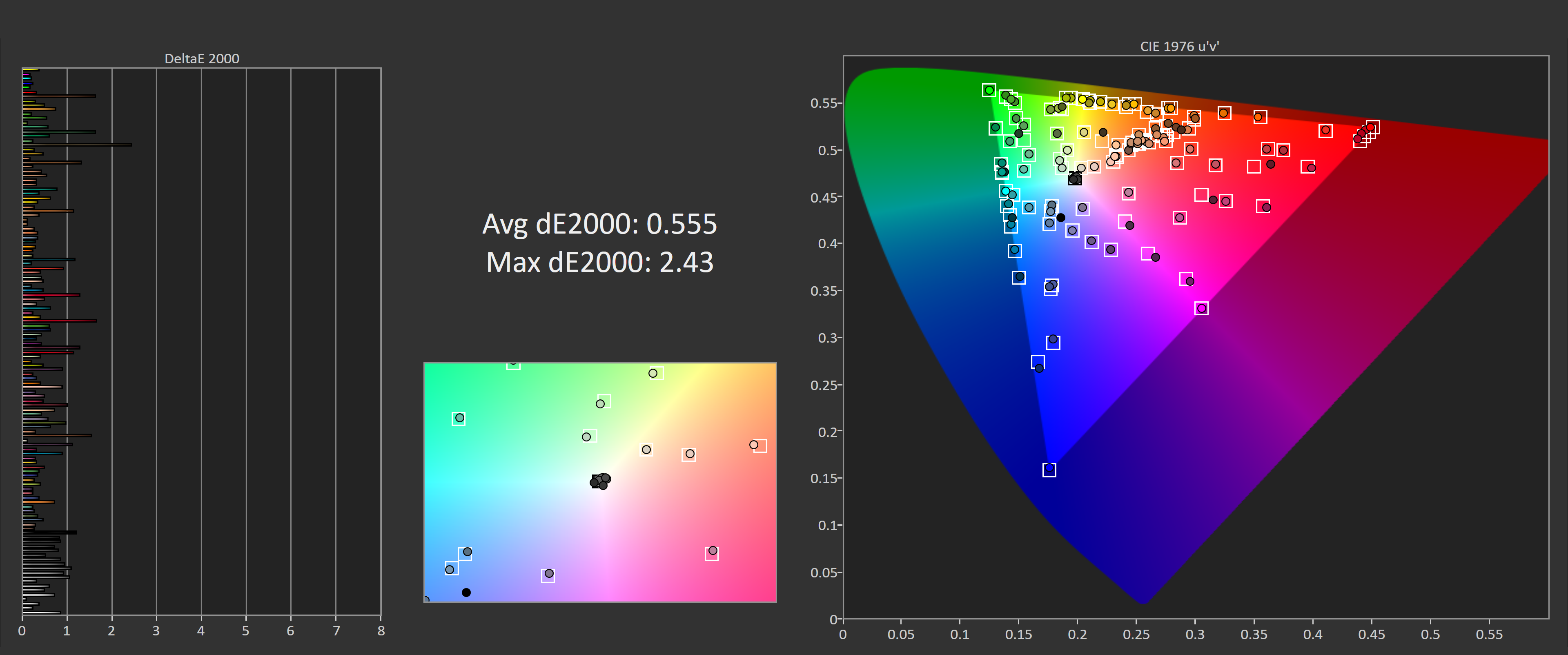 The CCT curve is also decent and while our unit was tinted very slightly towards the yellow end out of the box, this is a nitpick really and you won't get anything better outside of full calibration. Saturation performance is affected mostly by the unclamped gamut, but this only delivers moderately inaccurate results due to oversaturation; there are no other issues. Yes, we do see deltaE averages above 2.0 in saturation, but surprisingly in ColorChecker this is below 2.0, which is very good.