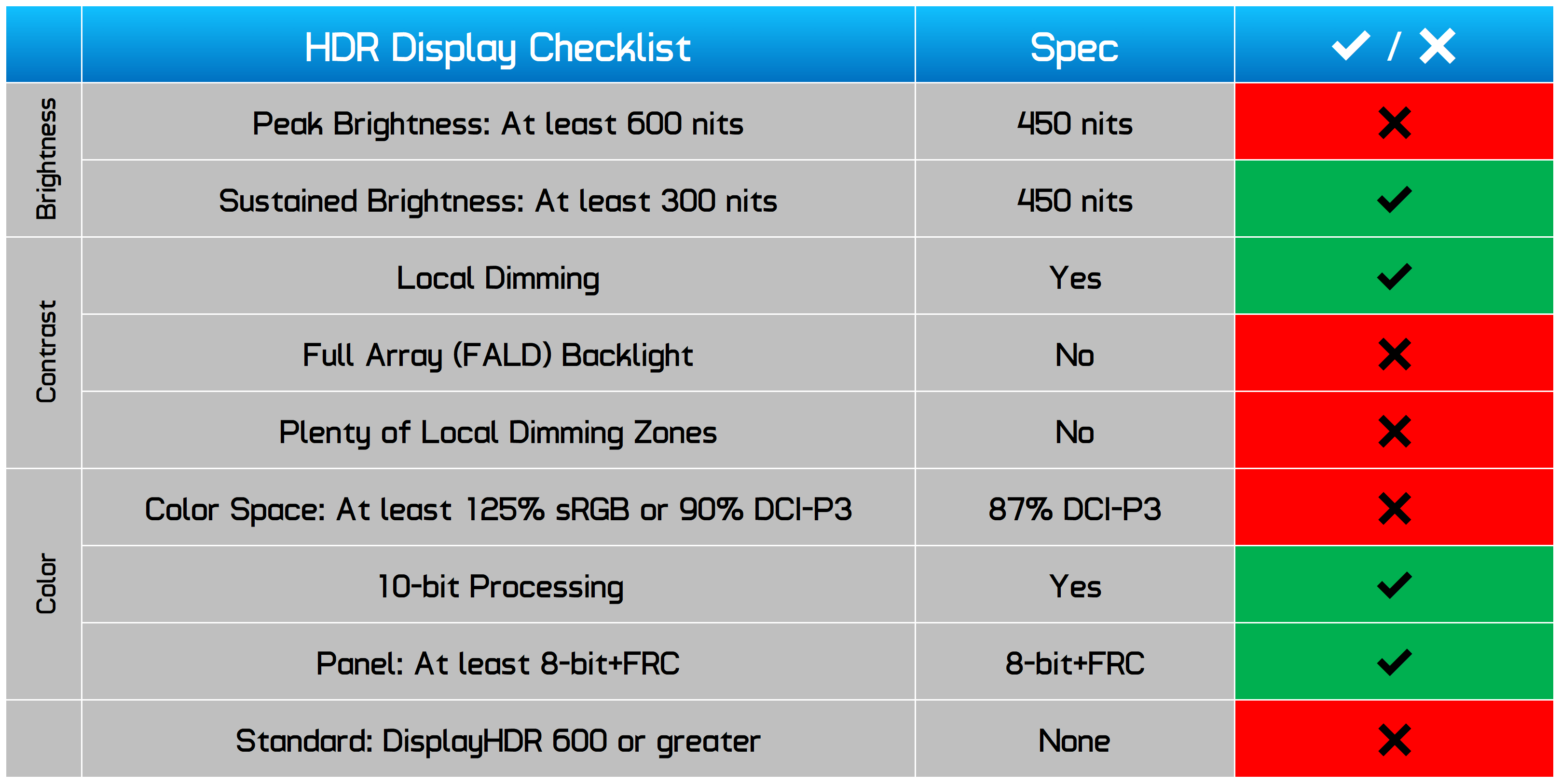 This is a curious monitor in that it gets halfway there with each of the three main pillars of HDR. For brightness, the monitor can sustain 450 nits easily, but can't push up to 600 nits. For contrast we do get some local dimming with 16 edge lit zones, but we don't have the full array or high zone count necessary for an excellent experience. And while the monitor is wide gamut capable, around 87% P3 coverage falls just short of the 90% we ideally want to see as a minimum.