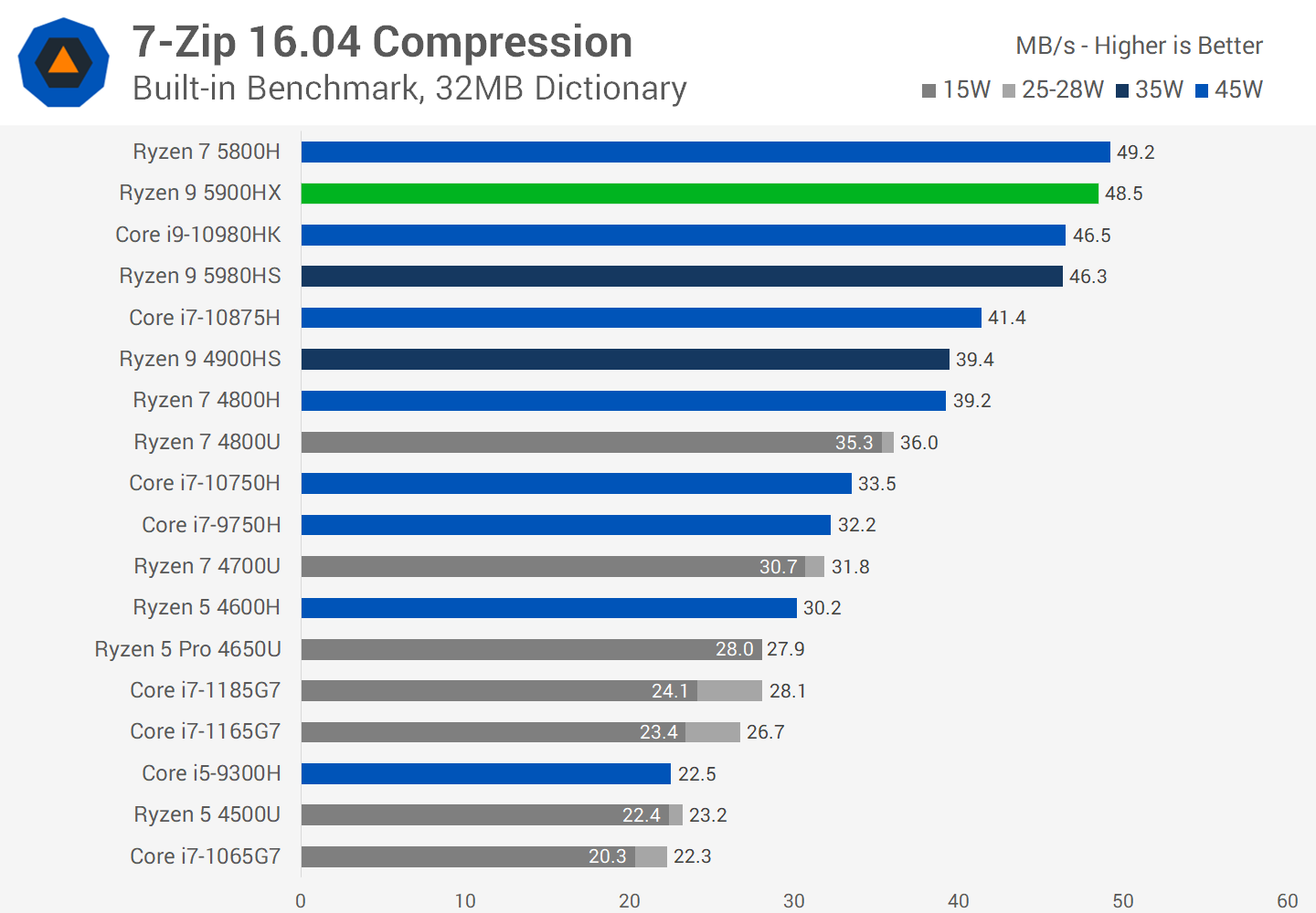 In 7-Zip compression, the 5900HX and 5800H deliver the same performance. The Ryzen 9 part is slightly ahead of the 5800H in decompression but not to any groundbreaking degree, and this merely extends Ryzen's lead on Intel processors for decompression workloads.