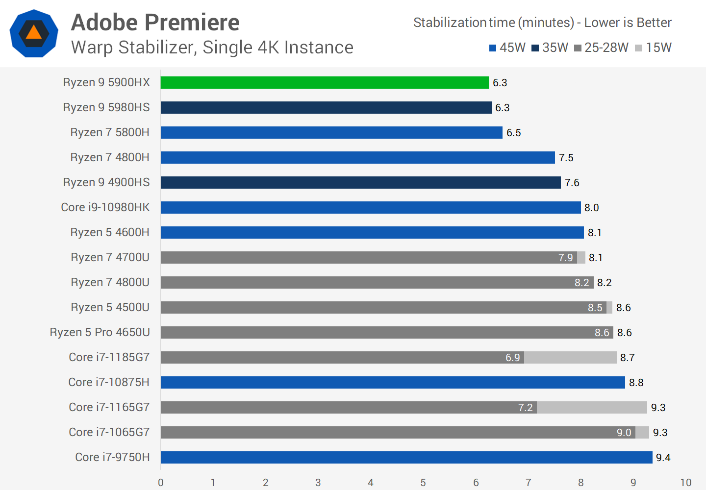 We also have Adobe Premiere's Warp Stabilizer effect, running a single instance which tends to occupy two threads at most. The 5900HX is a great choice for this workload, but it's barely any faster than the 5800H. When compared to the 10980HK however, there's a sizable 28 percent performance advantage.