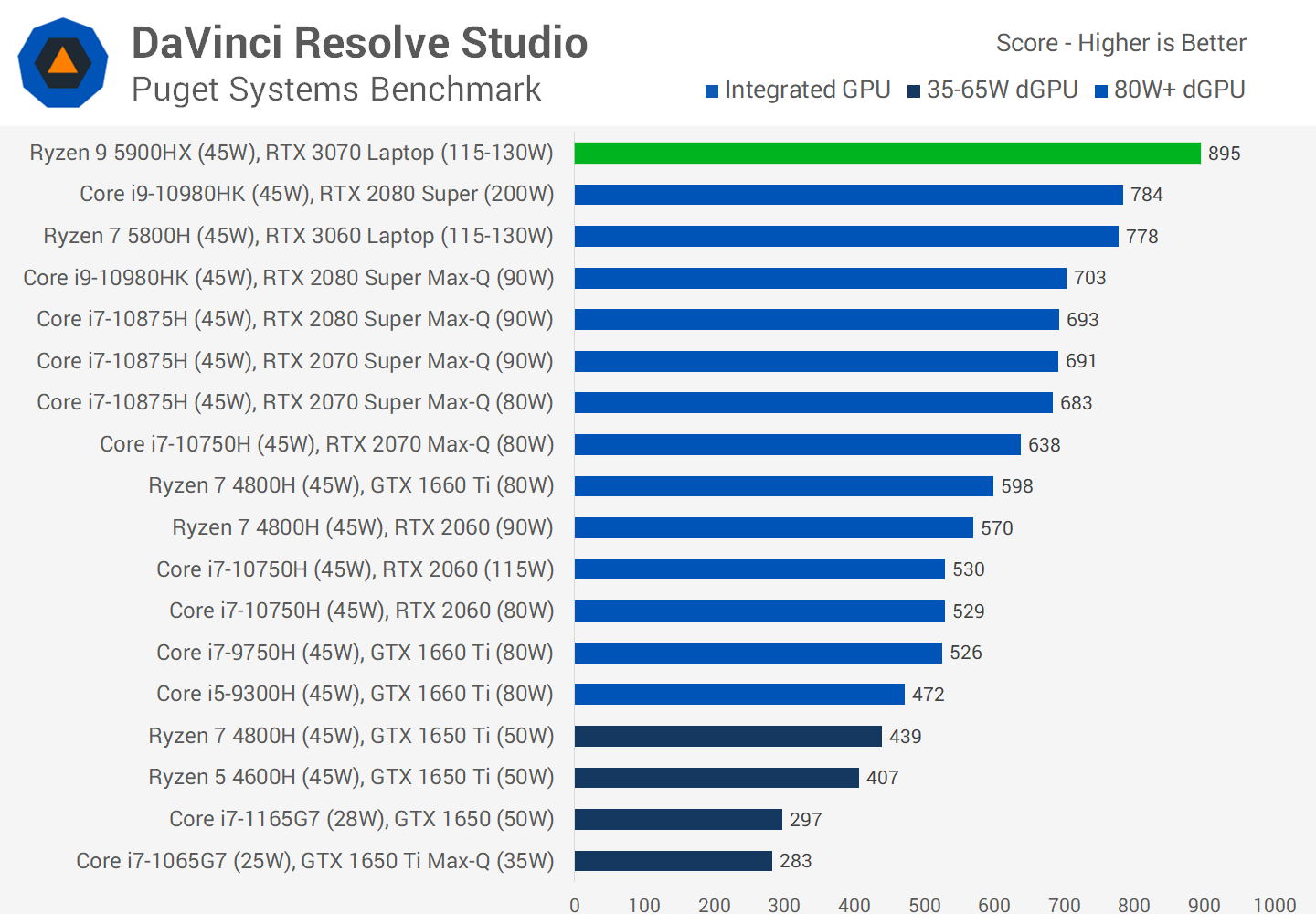 In DaVinci Resolve, the 5900HX plus RTX 3070 combination is the best that we've tested so far, beating last-gen 10980HK plus RTX 2080 Super combinations. This new laptop config is actually quite a lot faster in this GPU heavy workload, 14% better than the next best option and nearly 30% faster than your classic Max-Q style laptop.