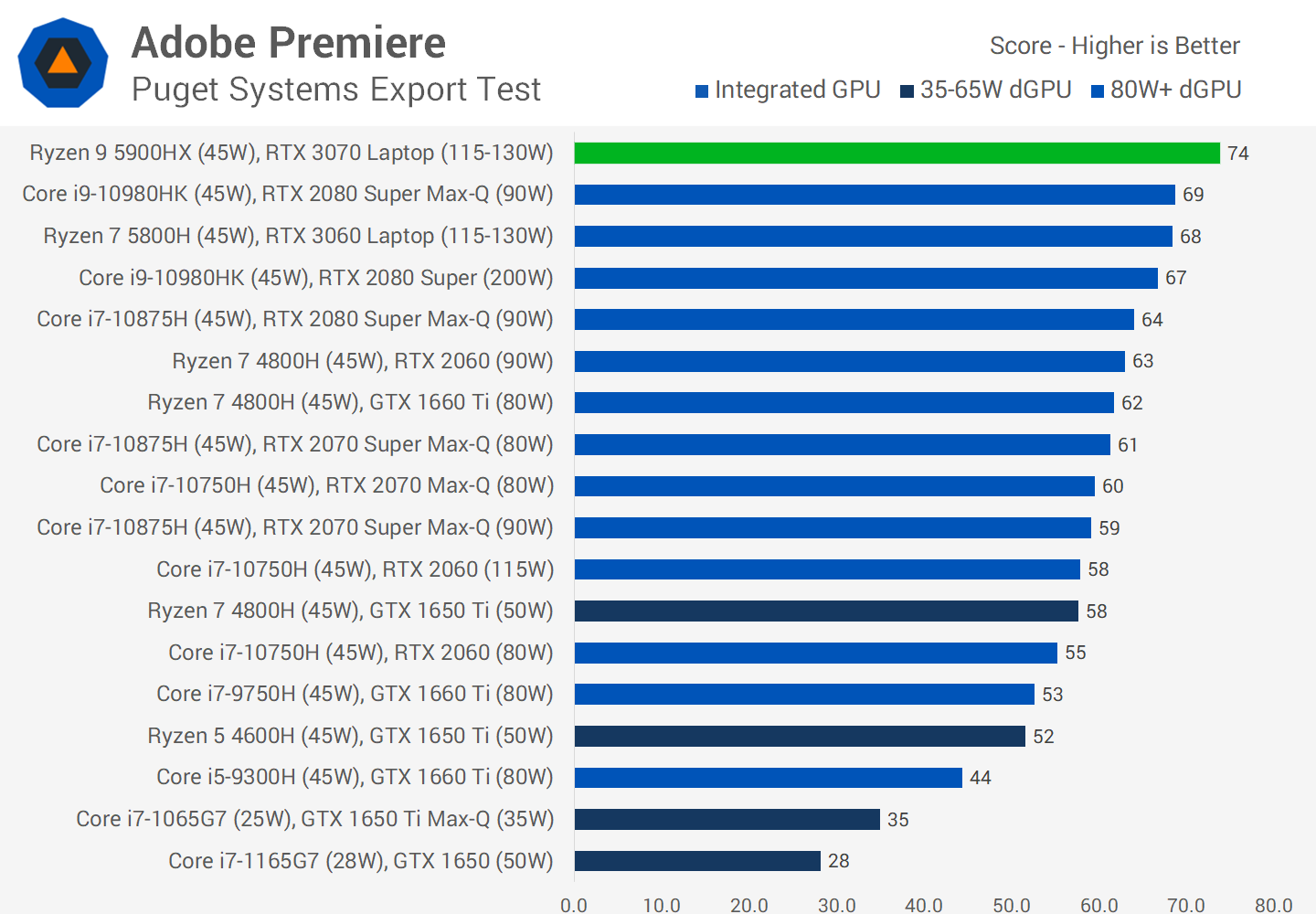 The 5900HX + RTX 3070 also delivers class leading results in Puget's Adobe Premiere export test, scoring above the best 10980HK configurations we've tested so far. However without accelerated encoding, using a 2-pass configuration instead for superior encode quality, we fall back to CPU performance and the 5900HX shows itself to only be slightly faster than the 5800H, which is what we've seen across many benchmarks so far.