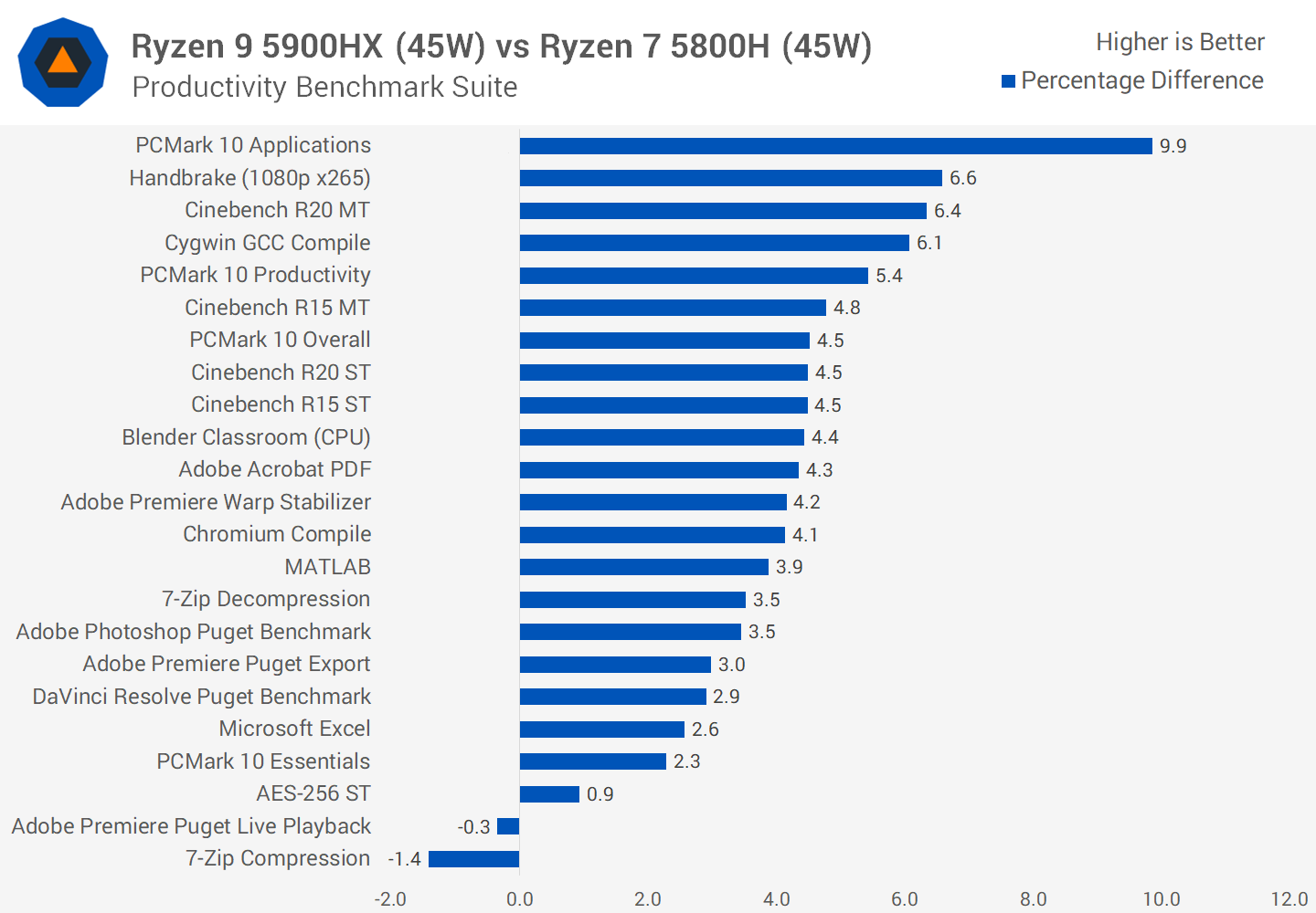 In Handbrake the Ryzen 9 5900HX does appear to be better binned, sustaining a marginally higher clock speed at 45W for a small performance improvement versus the 5800H. It's 7 percent faster in this test, achieving a 15 percent performance lead on the 4800H and 36% versus the 10980HK.