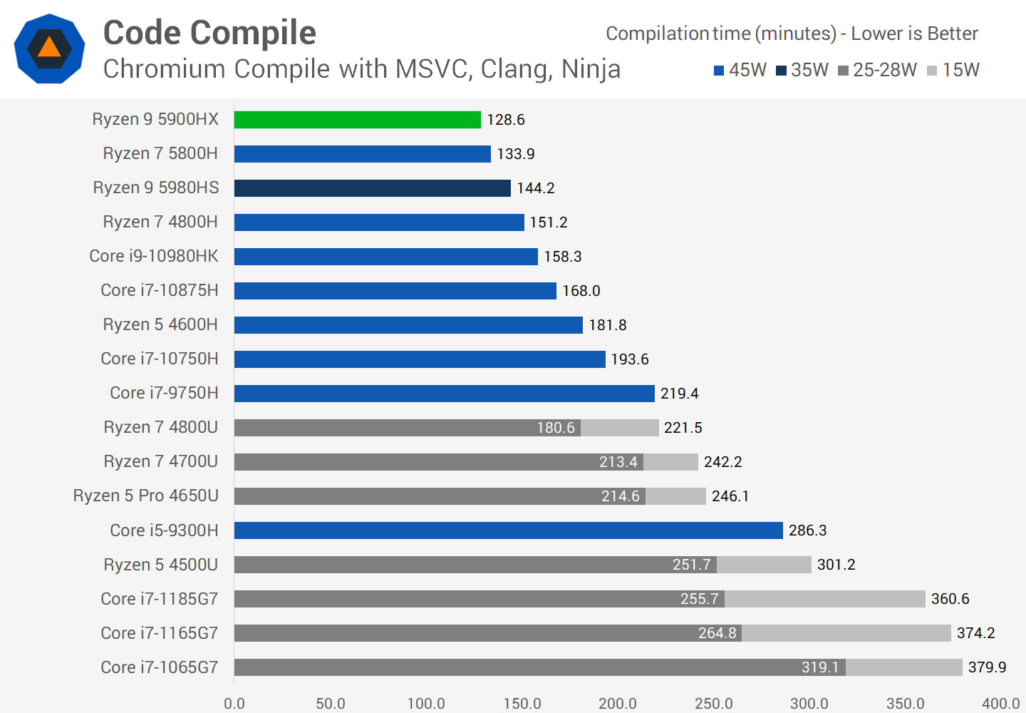 Code compilation does benefit from the 5900HX's faster boost clocks, as sections of the compile are single threaded. Here the Ryzen 9 part is 6 percent faster than the Ryzen 7 5800H, though that margin is reduced to 4 percent in the longer Chromium compilation.