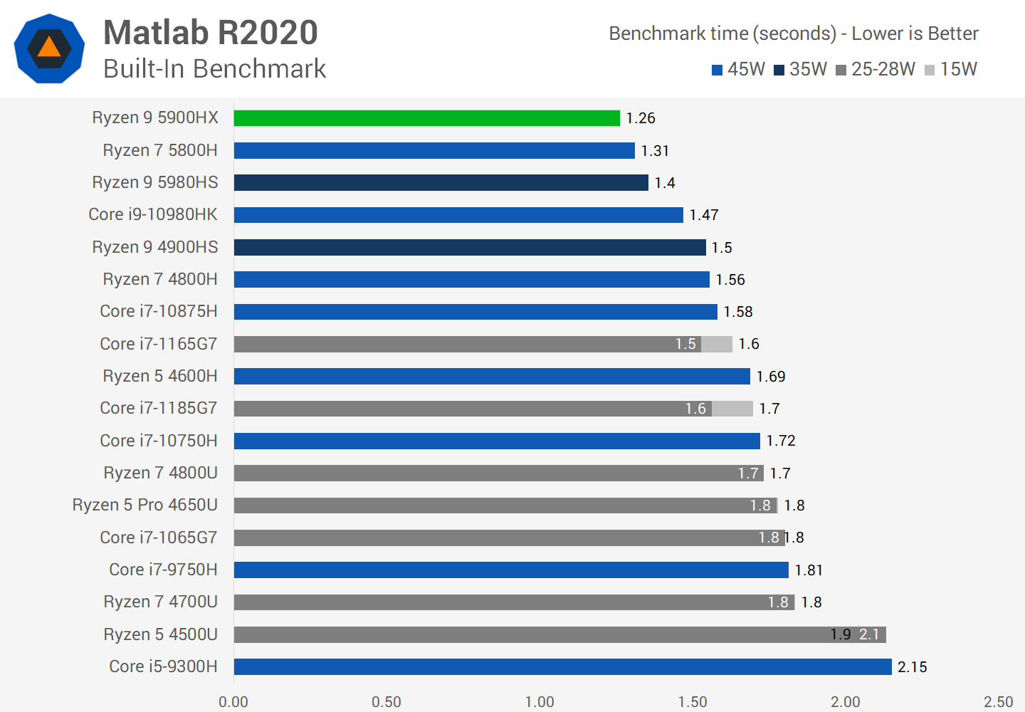 The Ryzen 9 5900HX is the fastest laptop processor we've tested so far for MATLAB, with this benchmark benefitting significantly from the changes made to the Zen 3 architecture. Higher IPC, higher boost clocks and more cache all help to deliver more than a 20 percent performance boost versus the 4800H. This makes the 5900HX 16 percent faster than the Core i9-10980HK.