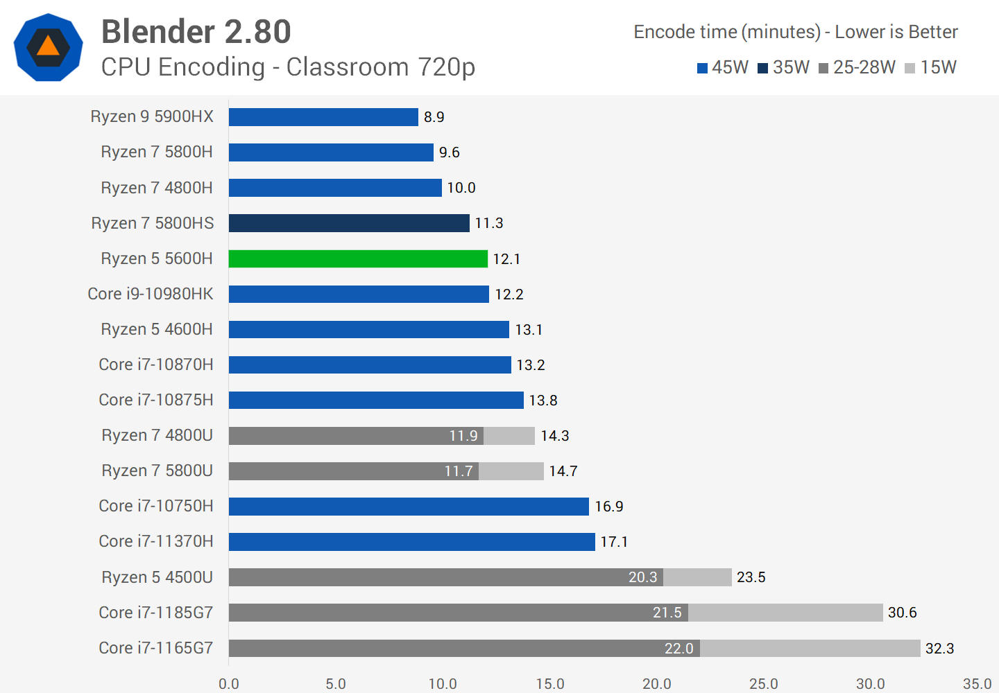 This allows the 5600H to sneak ahead of the Core i9-10980HK running at 45W, while beating the Core i7-10870H by 21%, and the six-core Core i7-10750H by 47%.