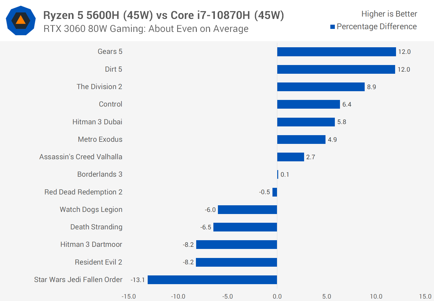 The first is that in CPU limited titles, the Ryzen 5 5600H performs okay but not amazingly. In Hitman 3's Dartmoor benchmark for example, the 5600H with the RTX 3060 is a little bit faster than a last generation 4800H system with the RTX 2060, and about 8 percent slower than a Core i7-10870H configuration.