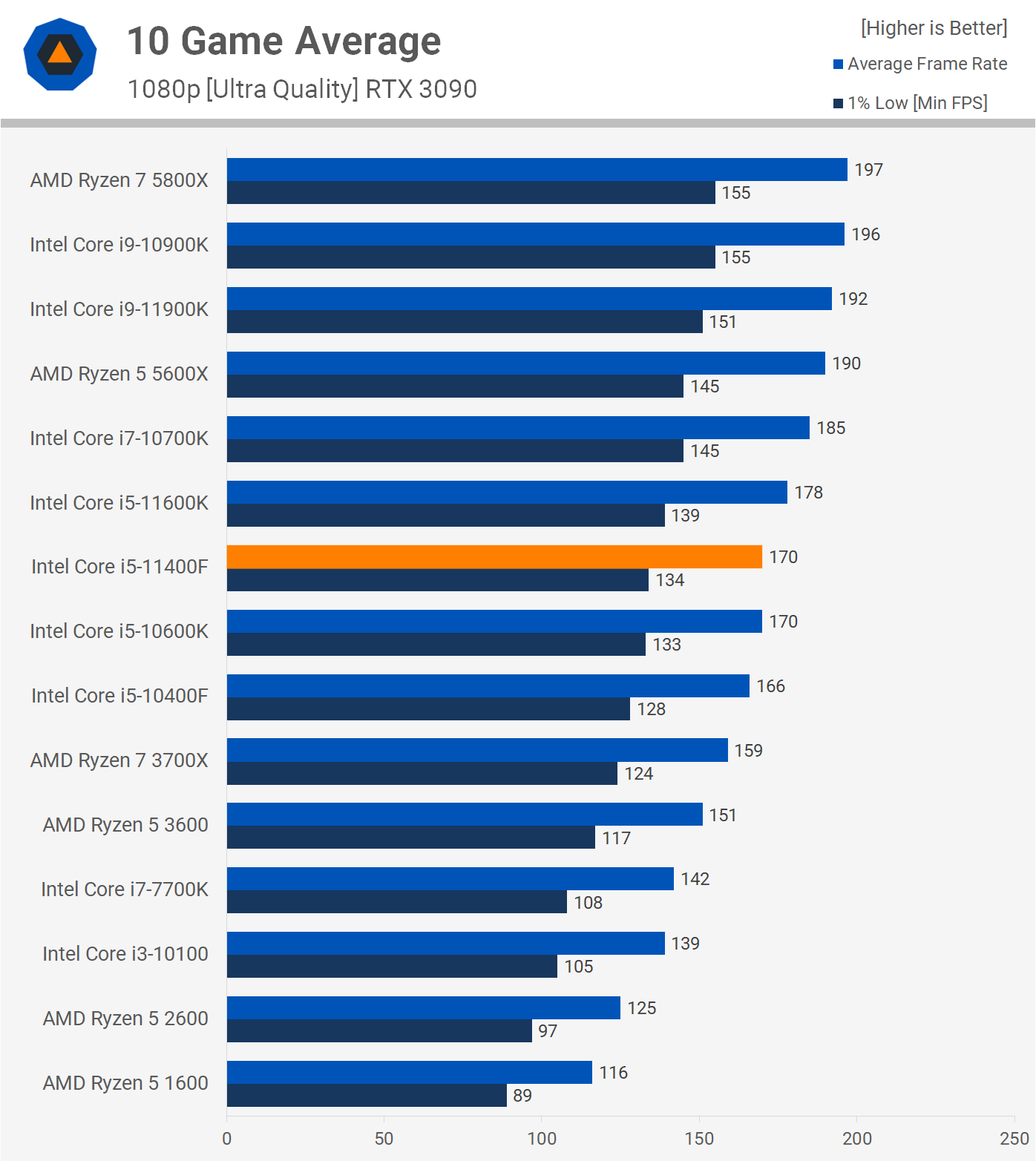 Here's a look at our 10 game average. Given what we just saw it won't surprise you to learn that on average the 11400F was just 4.5% slower than the 11600K, when testing with an RTX 3090 at 1080p. On average, we're looking at 10600K-like performance and that means the 11400F is about 2.5% faster than the 10400F.