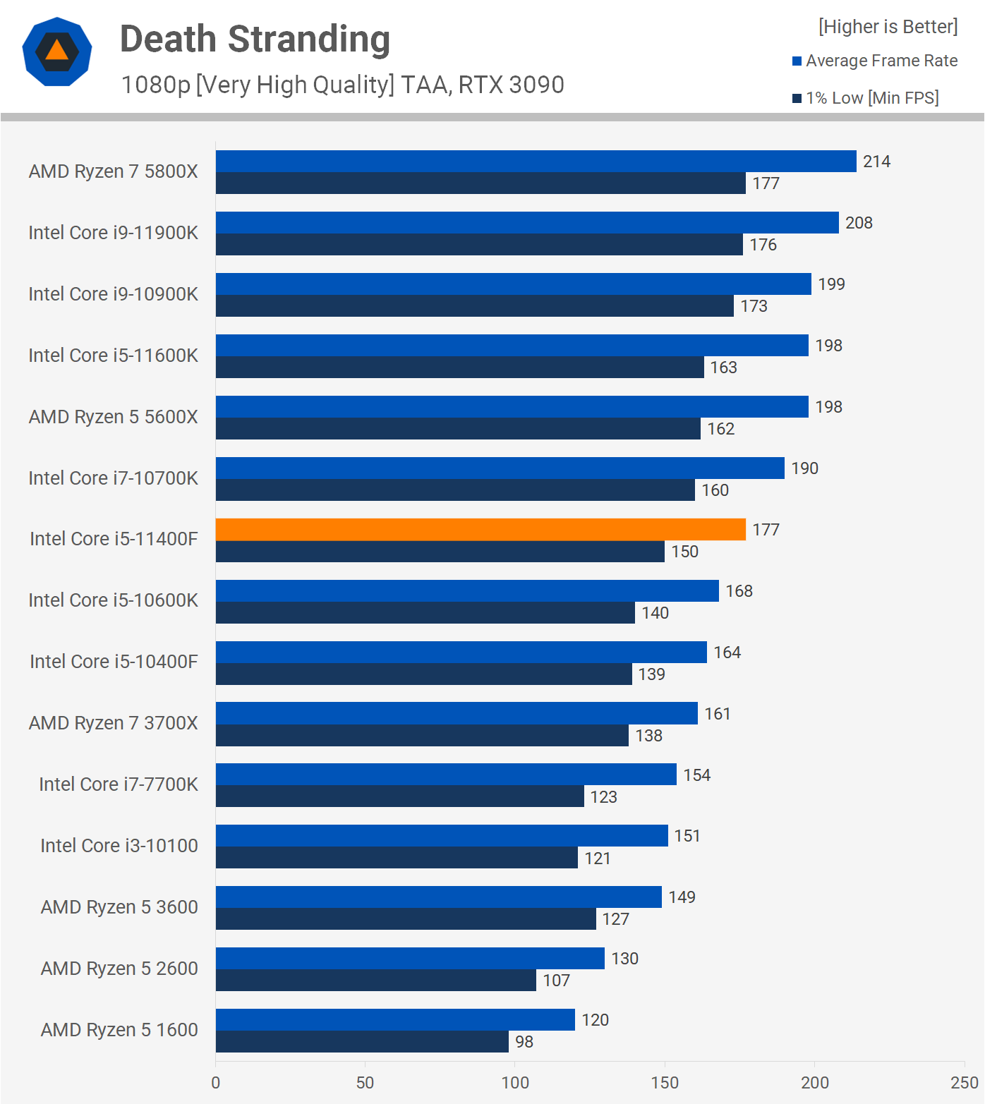Interestingly, Death Stranding scales with frequency and as a result the 11400F was 10% slower than the 11600K, so a reasonably large difference, but even so the locked 11th gen Core i5 processor was still 7% faster than the previous generation model.